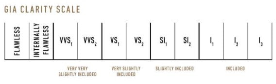 Next, we have the clarity of a diamond. This is how clear the diamond appears to be. All diamonds will have naturally occurring inclusions and deposits of minerals since they’ve been buried deep in the earth for a very long time! We like to call them birthmarks. A clarity rating will tell you how apparent these blemishes are. The GIA clarity scale has 11 categories ranging from FL (flawless) to I3 (with obvious inclusions). The majority of diamonds fall somewhere in between in the VS area as FL diamonds are outrageously rare. This scale was created so there was no misinterpretation of common language like the word “clean” when describing a specific diamond.