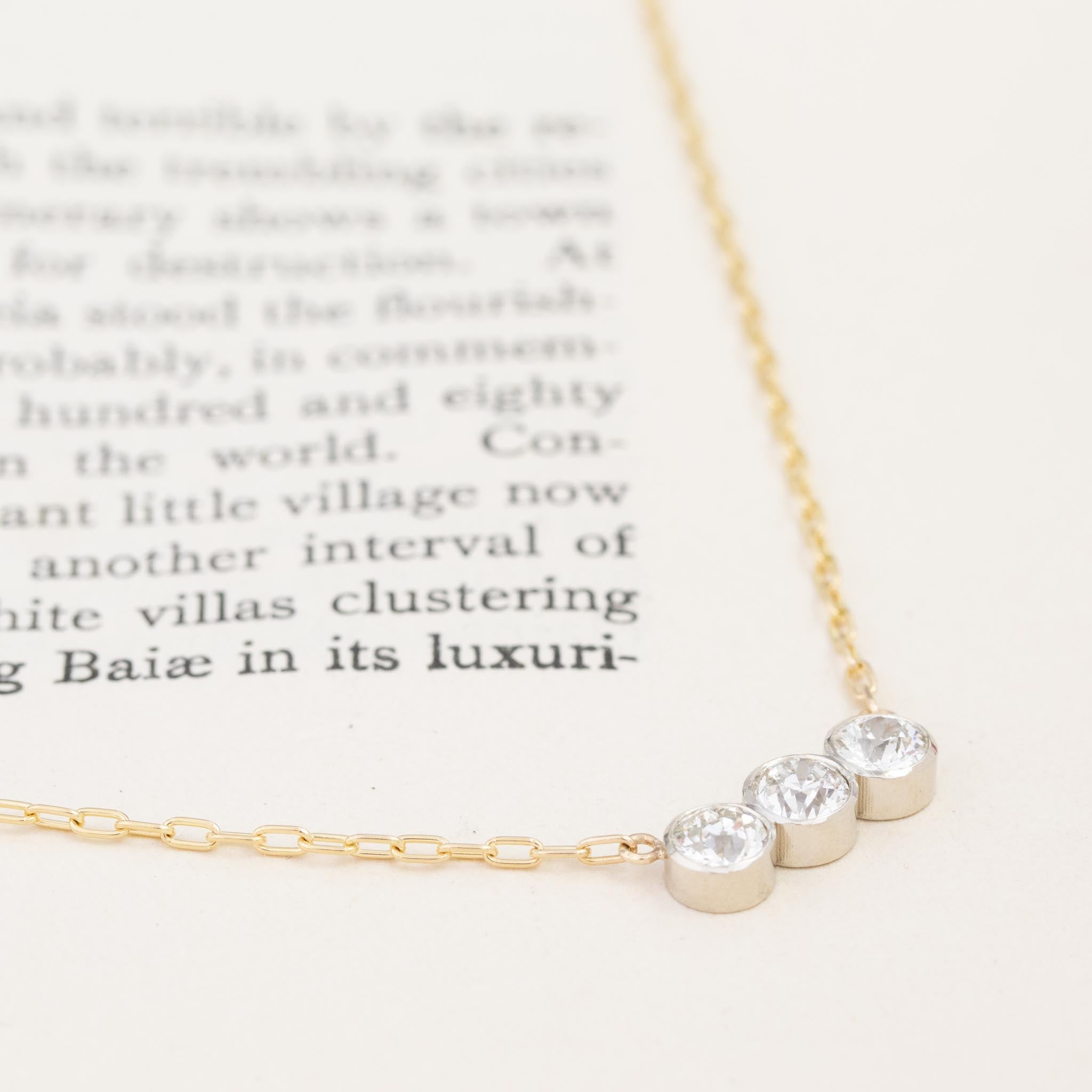 We took 3 gorgeous and beautifully matched diamonds, set them in delicate bezels and strung them on a paper clip chain. The result is a beautiful piece of jewelry that sits beautifully on the decolletage! Bezeled in white gold and strung on a yellow gold paper clip chain, the pendant is all elegance and charn.