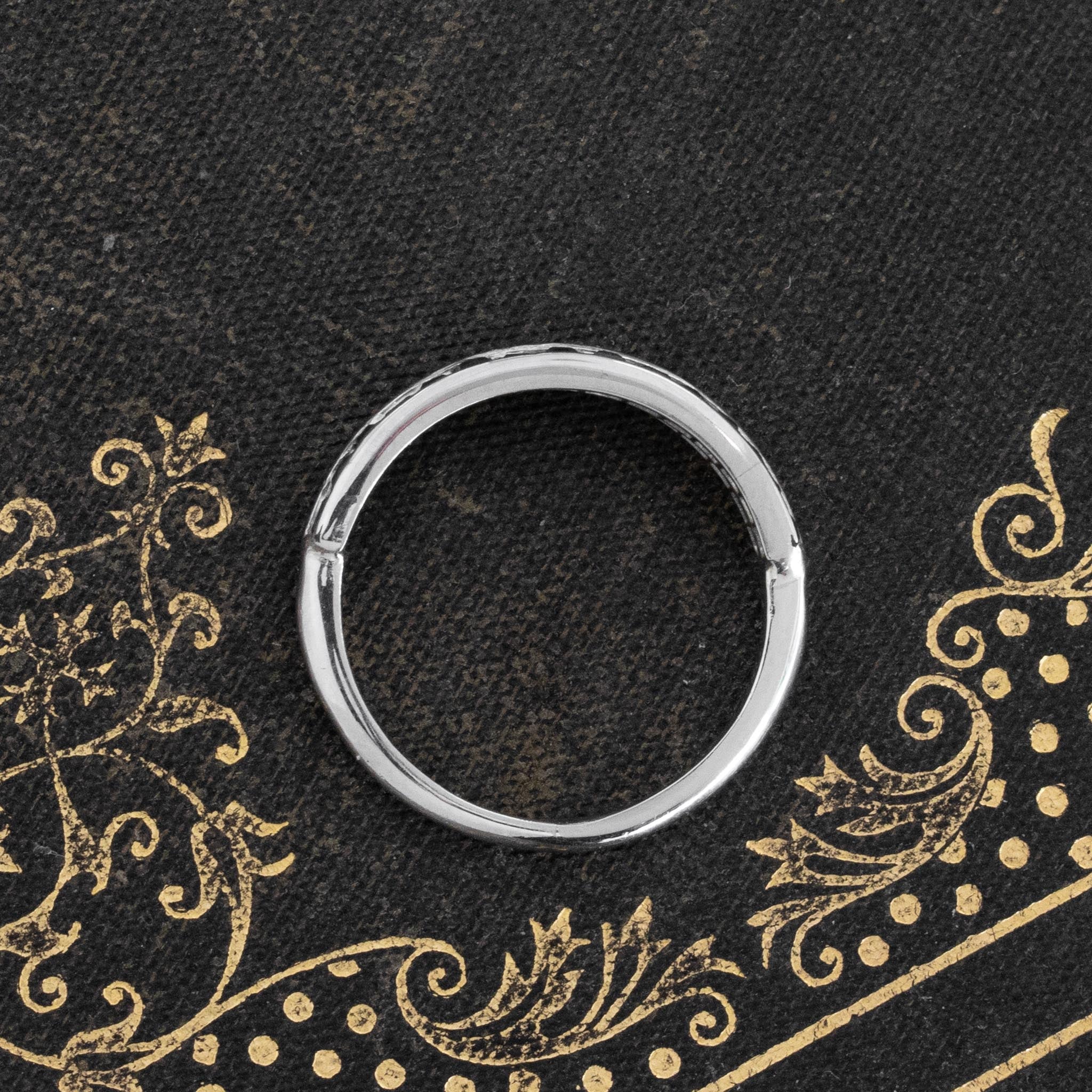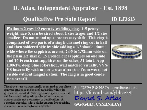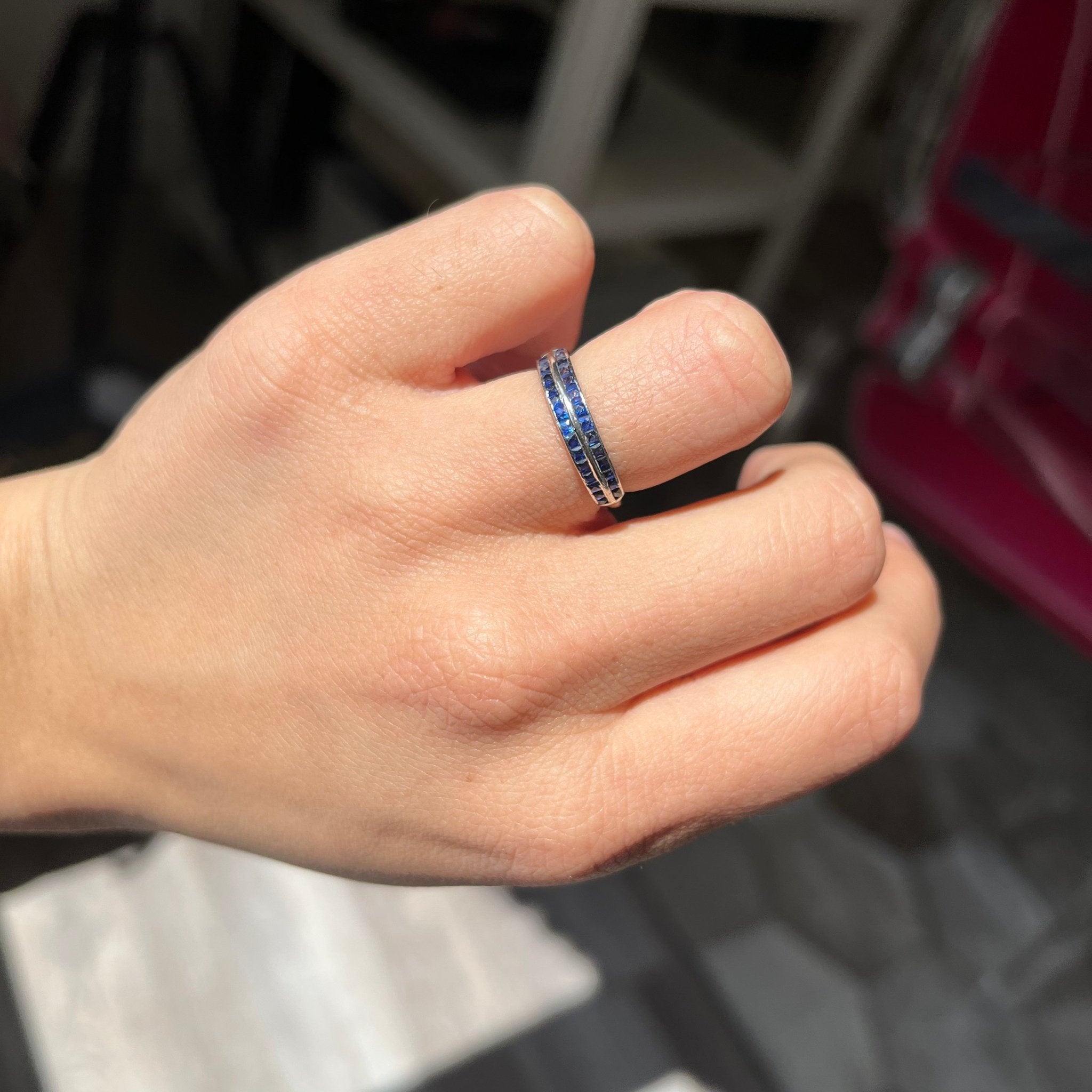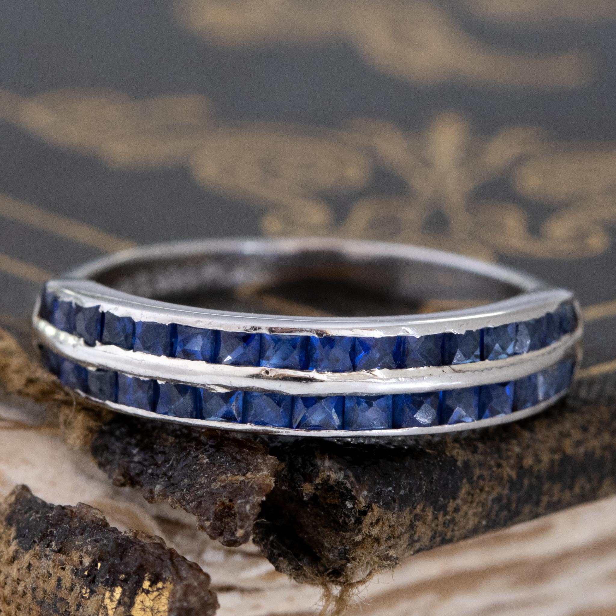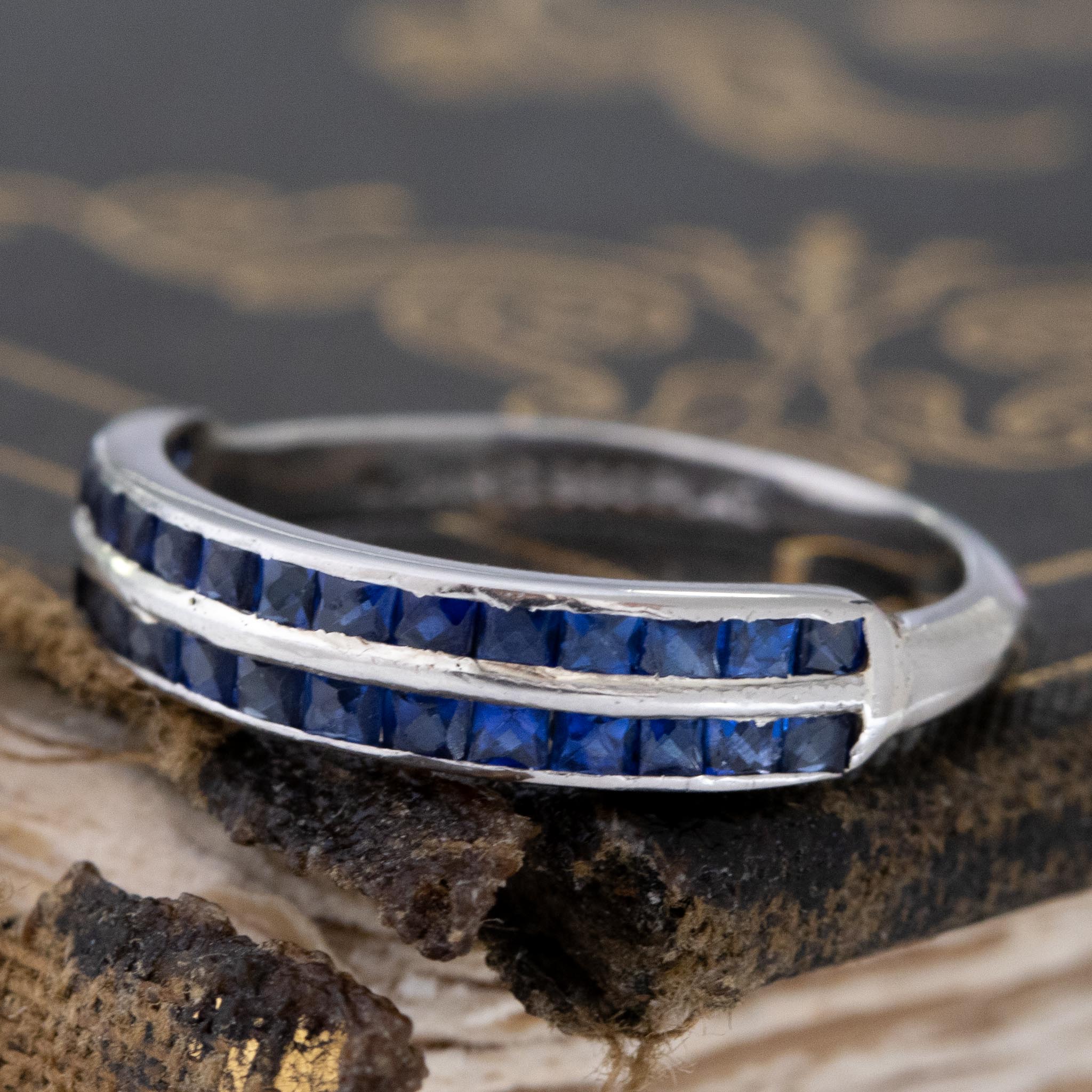 Super unique and unusual half eternity band, with a double row of French cut sapphires - we just ADORE the bright blue color of the gemstones! Perfect to wear on its own, or to stack with an engagement ring.