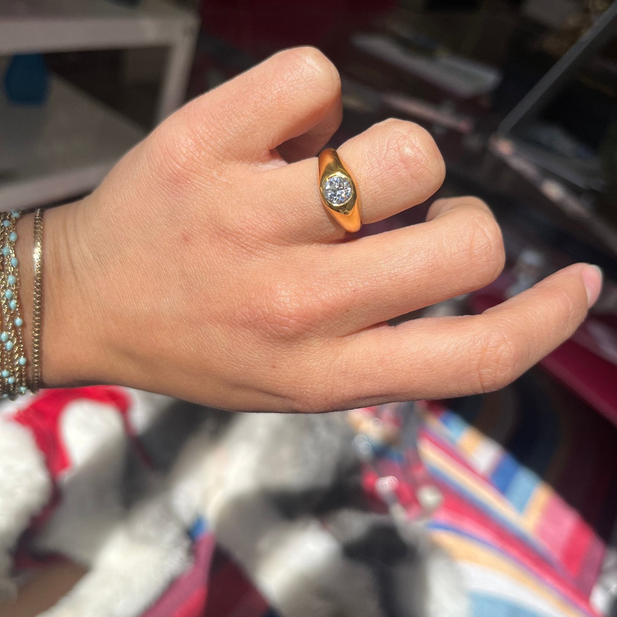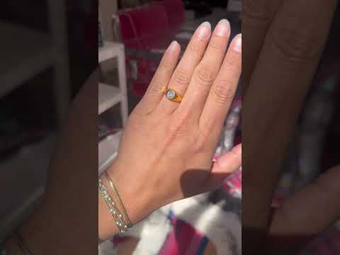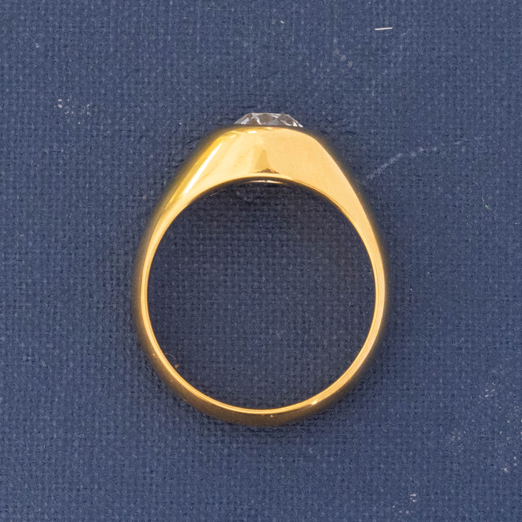 She's chunky, she's bright, and with a rare higher color and clarity to boot! And now, set in our rich and hefty 18ky yellow gold flush set setting, she has truly come alive. Tapers down elegantly as it hugs the base of the finger. Incredibly bright and lively stone in a low profile setting - clean, and fluid with nothing to distract the eyes. Elegant and understated.