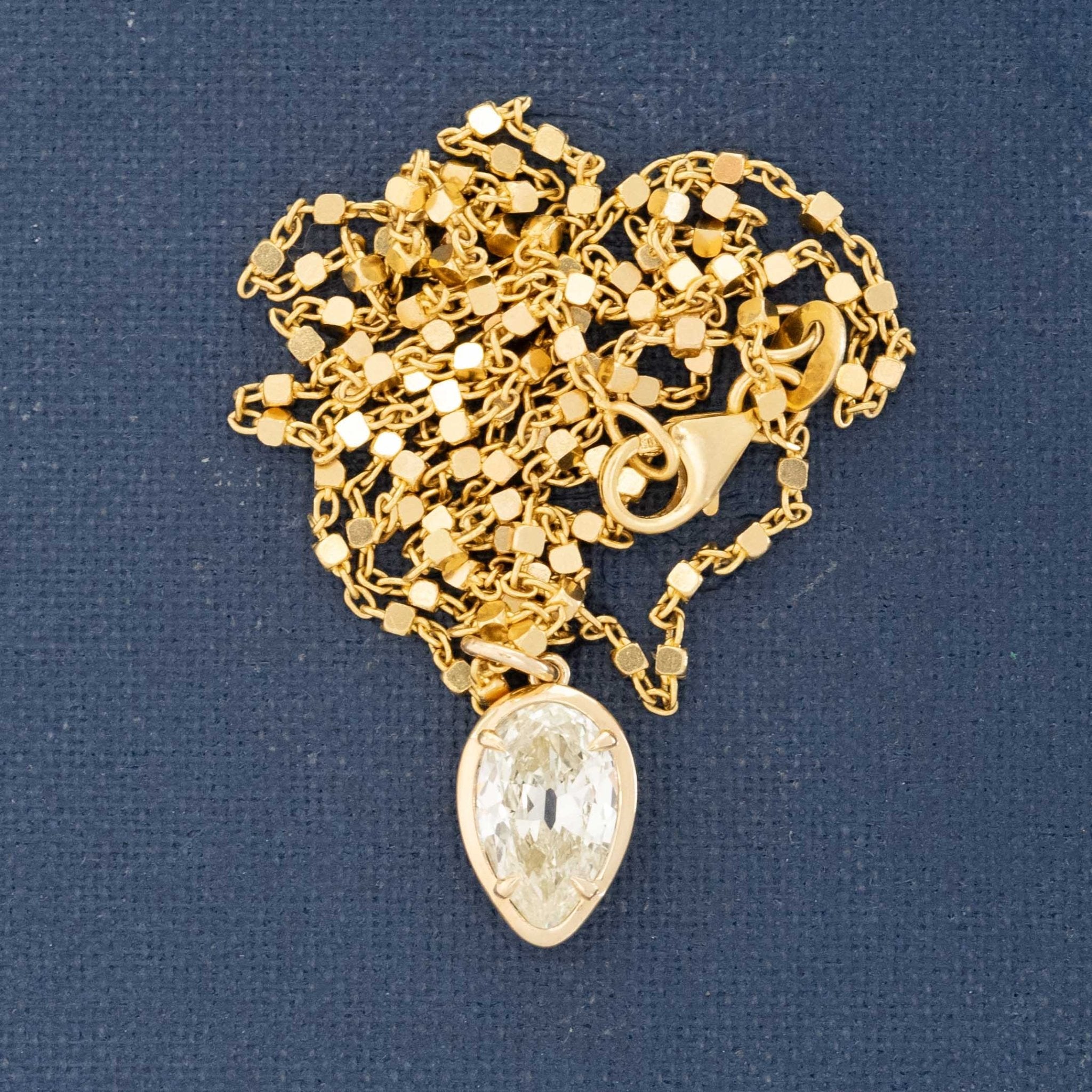 This charming vintage cut pear diamond is set in a gold bezel with four claw prongs, with the bale stationed at the "base" of the pear! We strung her with a contemporary, Italian-made chain, adorned with little gold cubes that reflect sunlight most delightfully. The pear-cut diamond is a bit lower in color, which I'm pretty fond of, surrounded by all this yellow gold! She's sparkly and unique, just like you, boo.