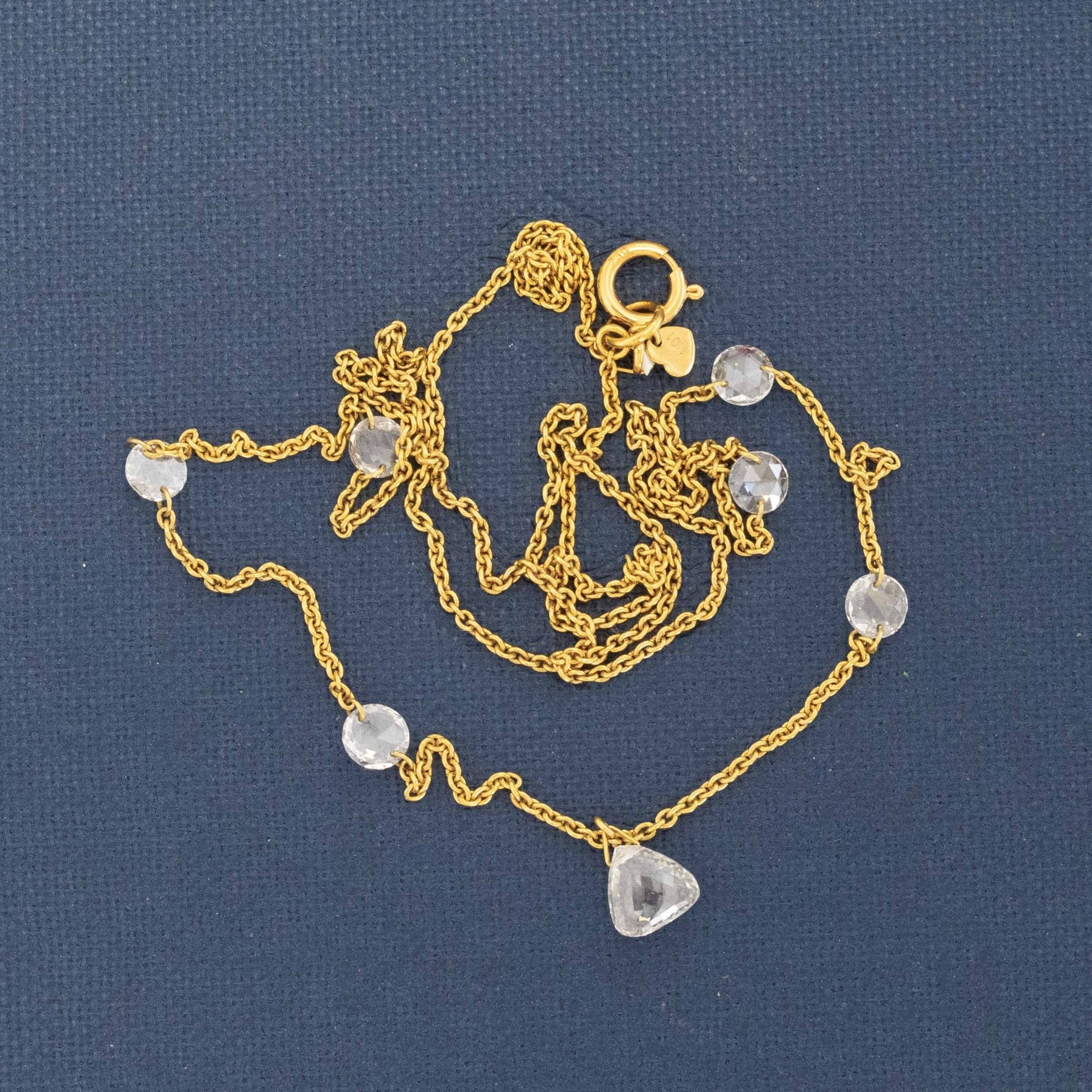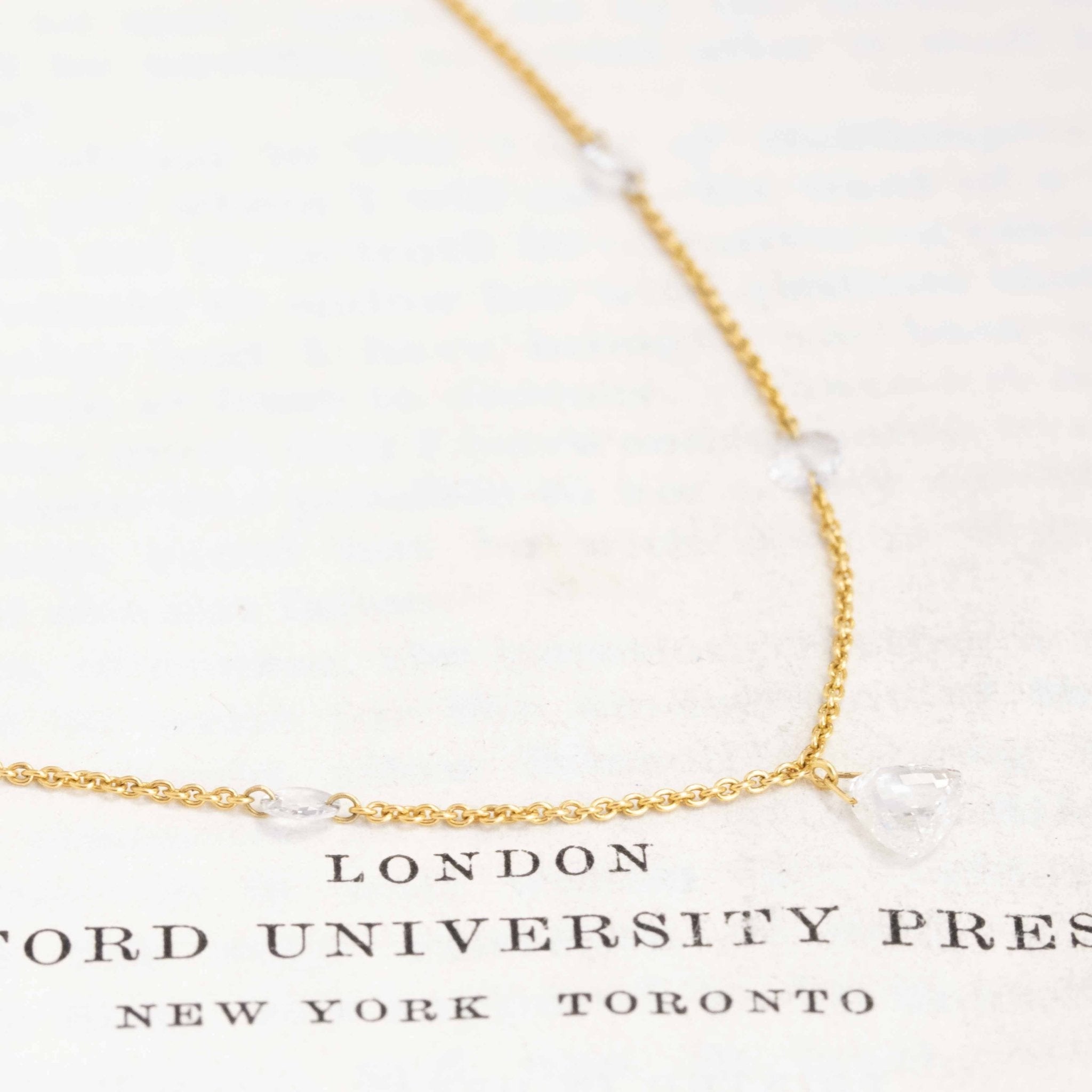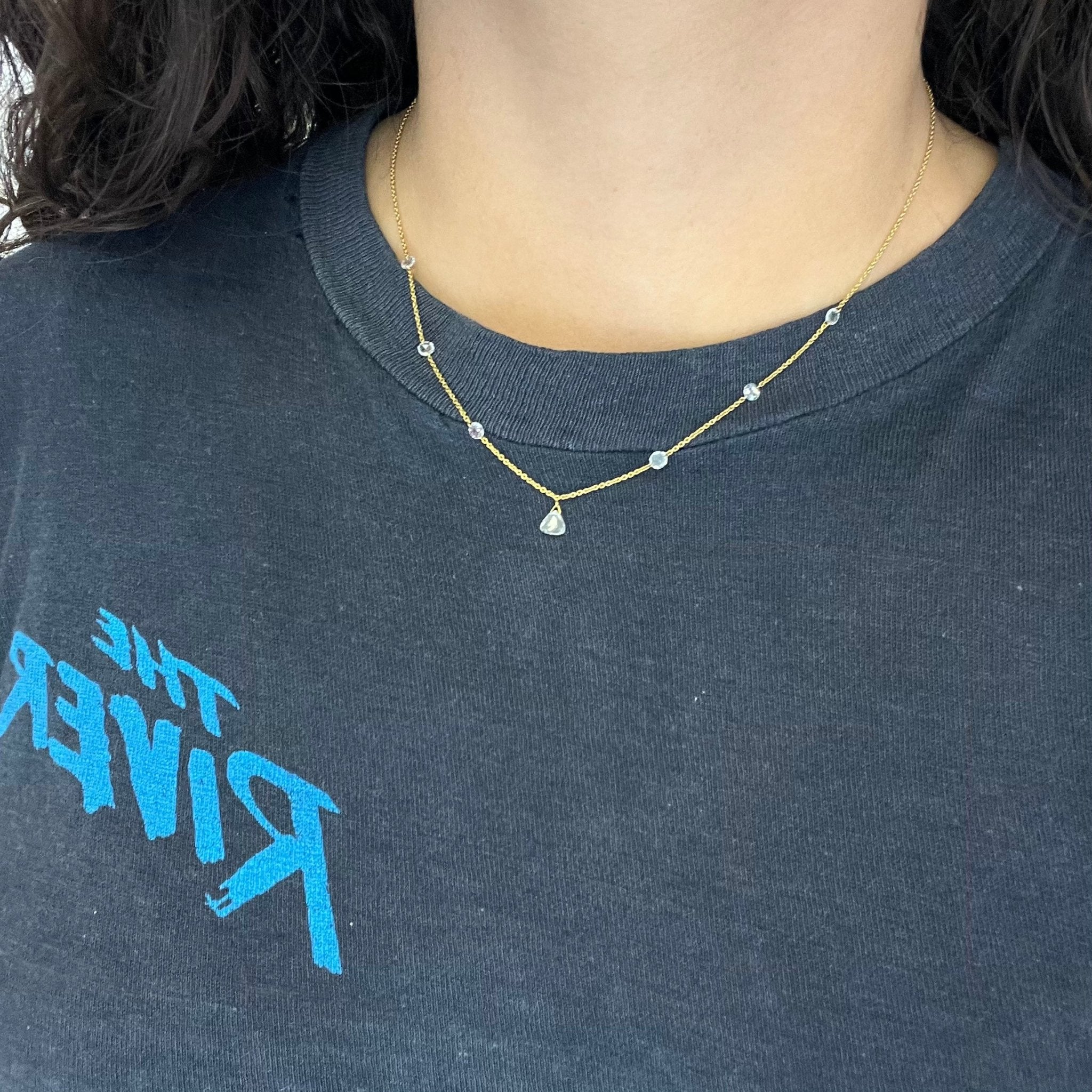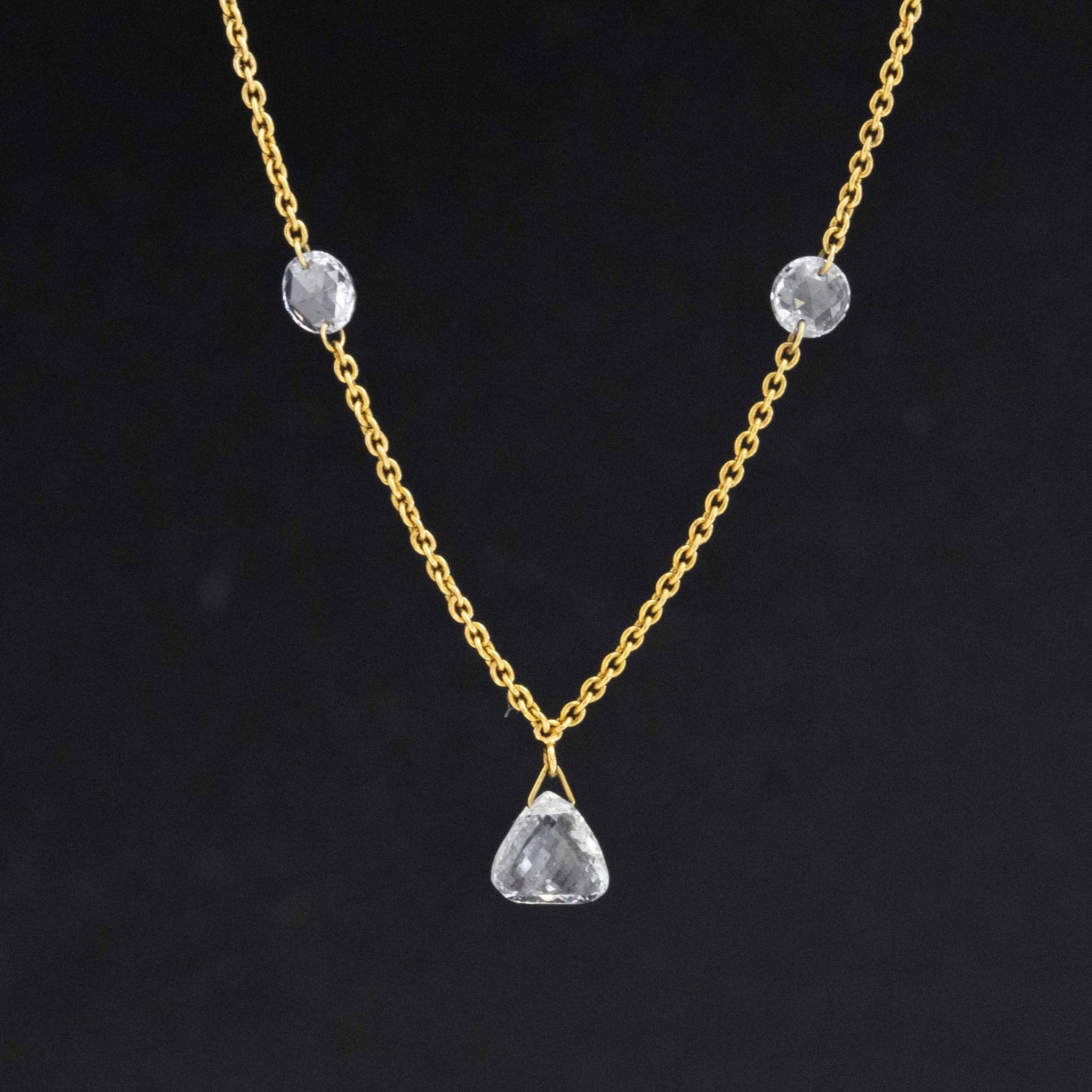 Chic and elegant necklace with 4 pierced round rose cuts flanking a triangular briolette in the center. Delicate and feminine - the perfect go-to for daily wear!
