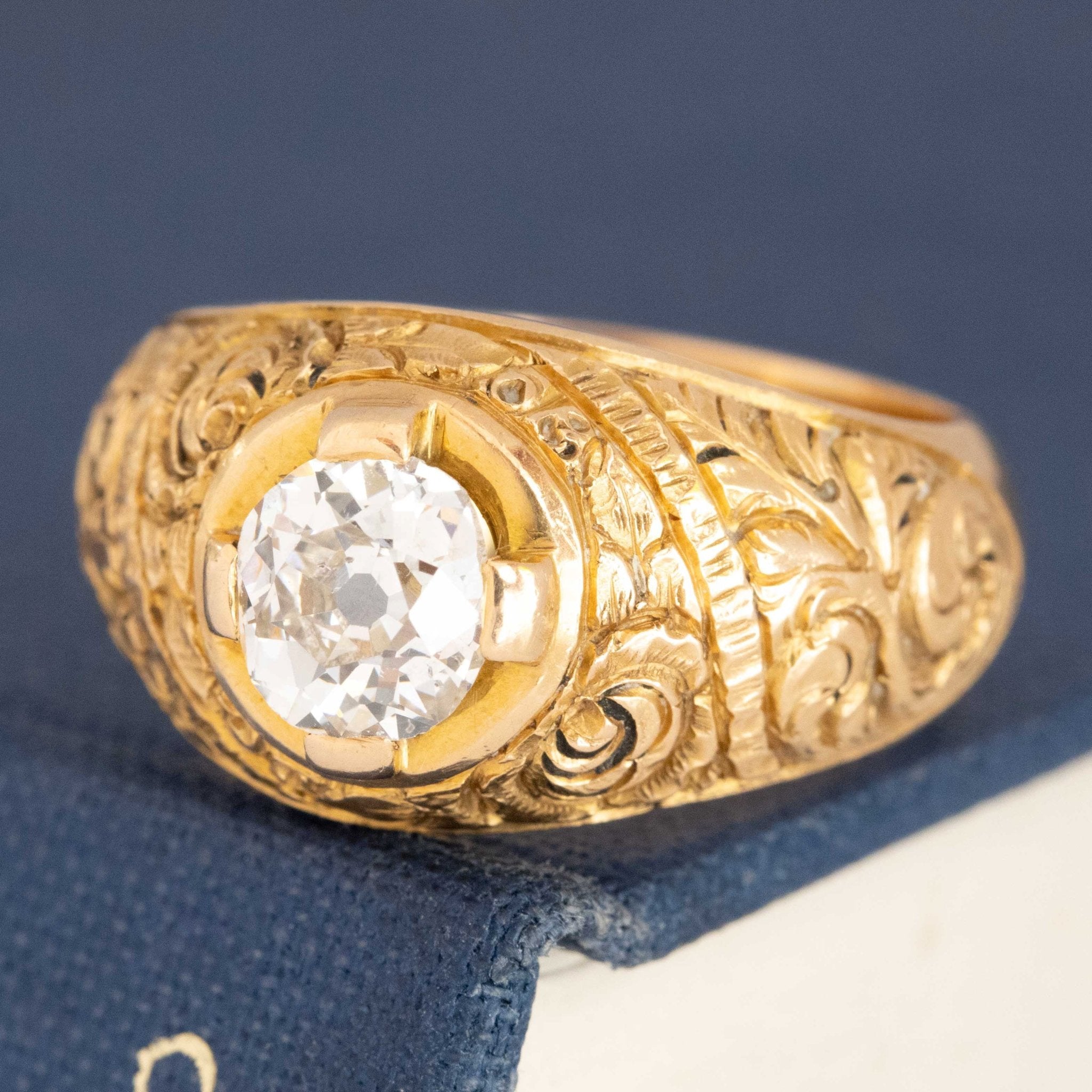 An antique chunky solitaire so chock full of detail, we simply cannot decide what about her we love the most. She's got a rustic and bright old mine cut diamond center with an open culet and sweet shape, held in by four tab prongs along the NSEW points. The chunky gold ring she sits in is engraved with rose motifs and texture like no other - we love her from all her angles, and find this ring to be charming.