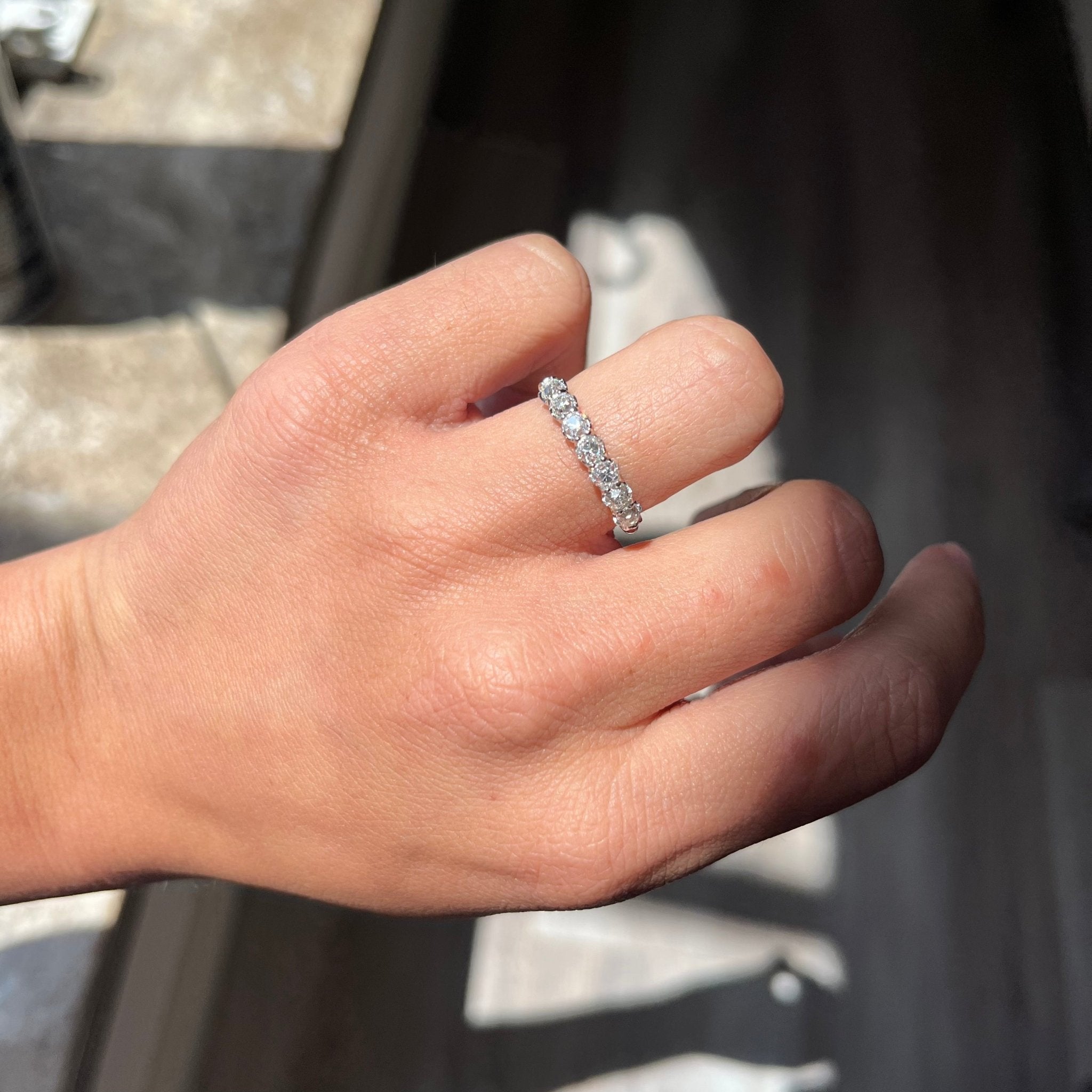 Modeled after antique diamond bands from the Georgian and Victorian eras, this band is set with chunky and charming old mine cut diamonds. The stones are bright and sparkly and just looks so beautiful and elegant on the finger. This is the perfect size for those wanting something smaller and more delicate in scale. With this layout, you get that generous half-eternity look.