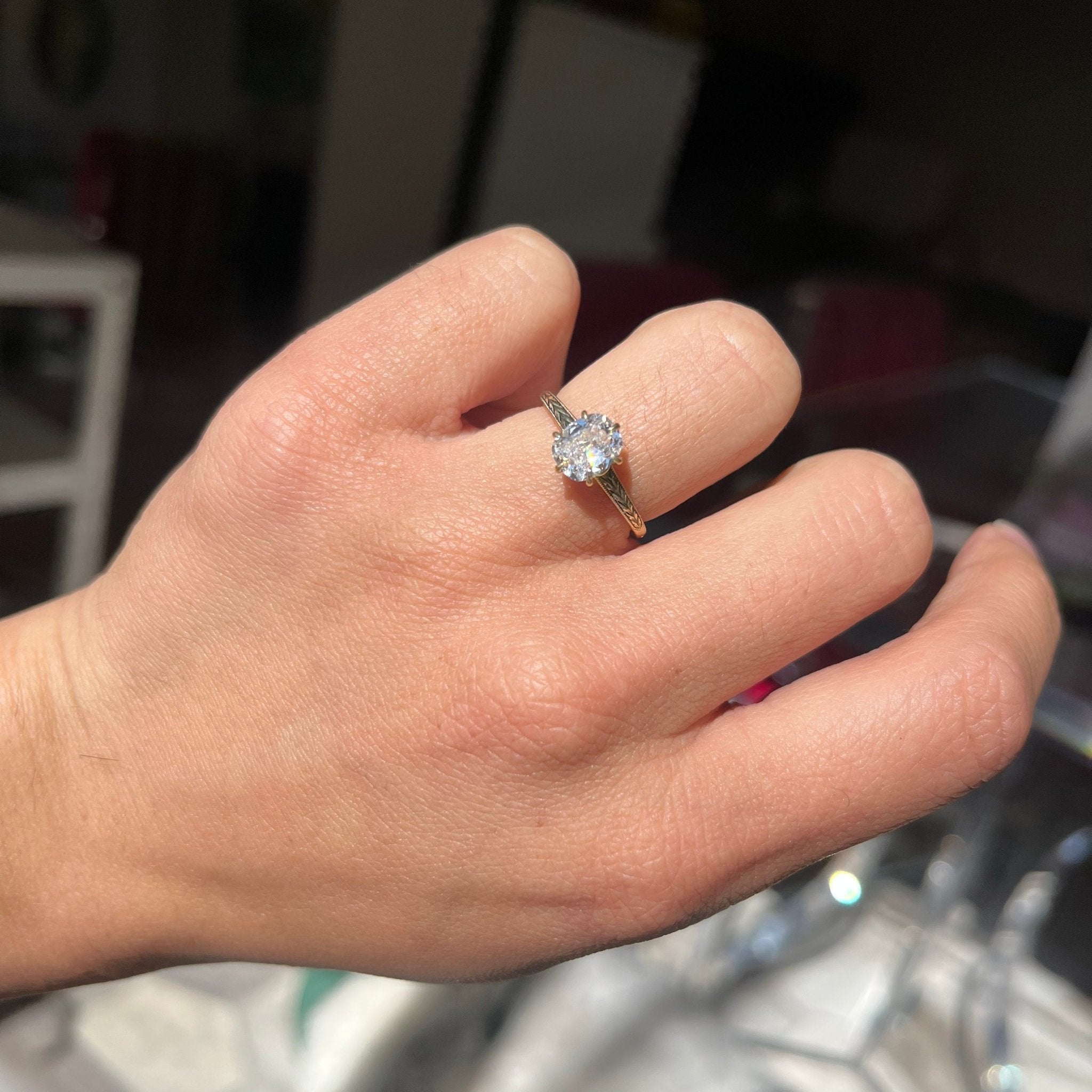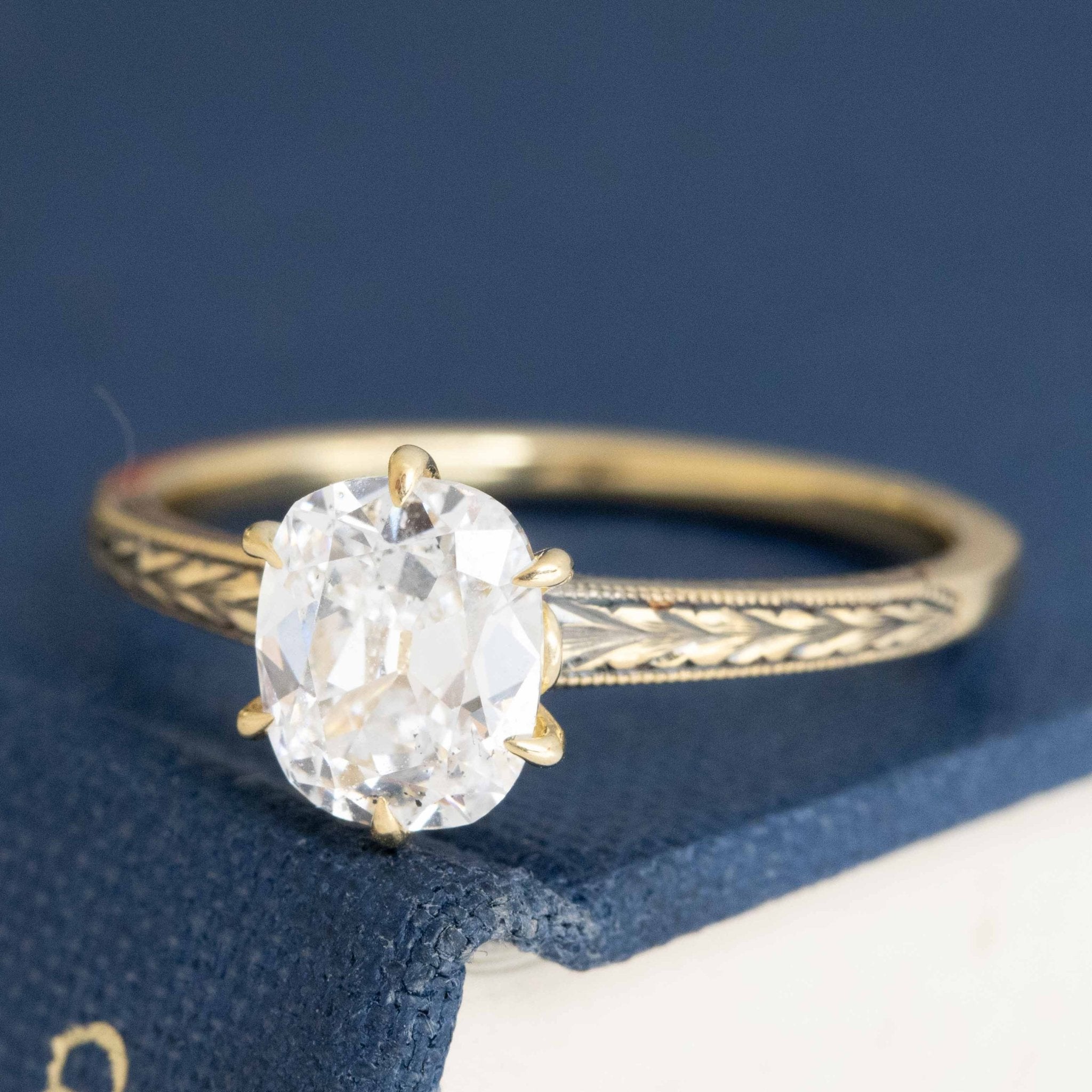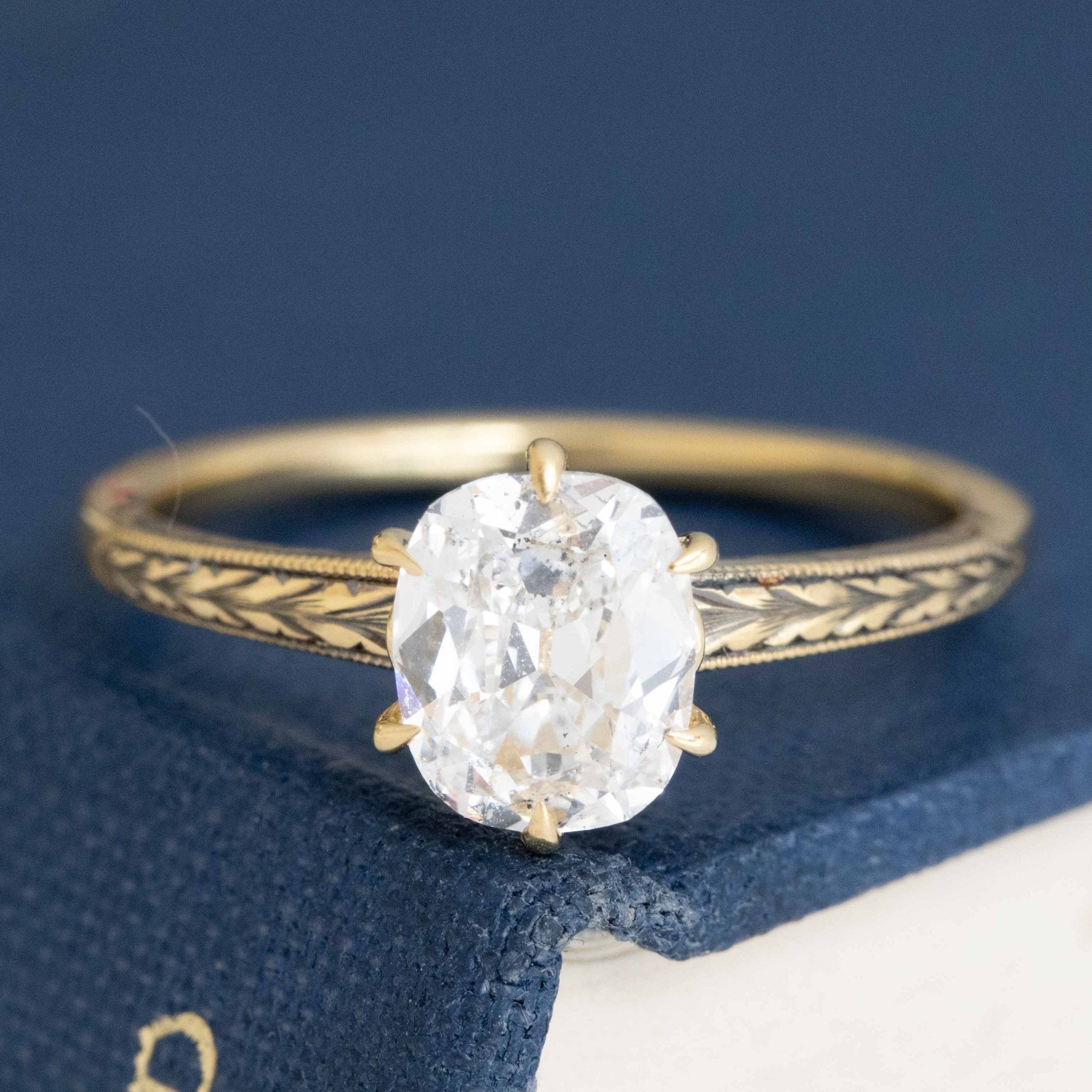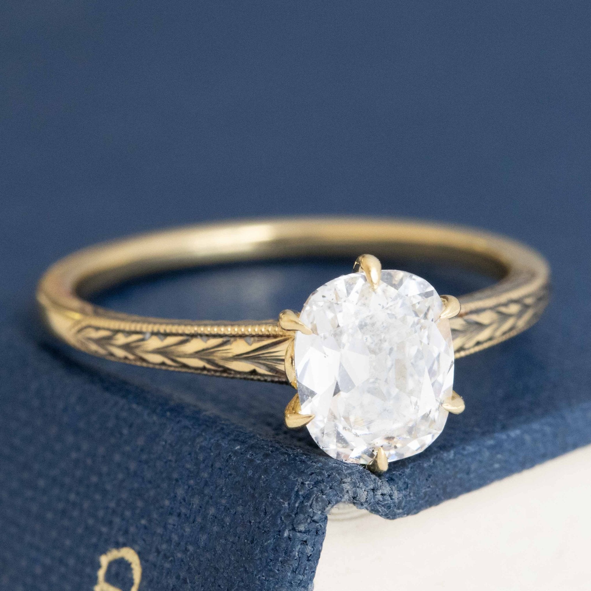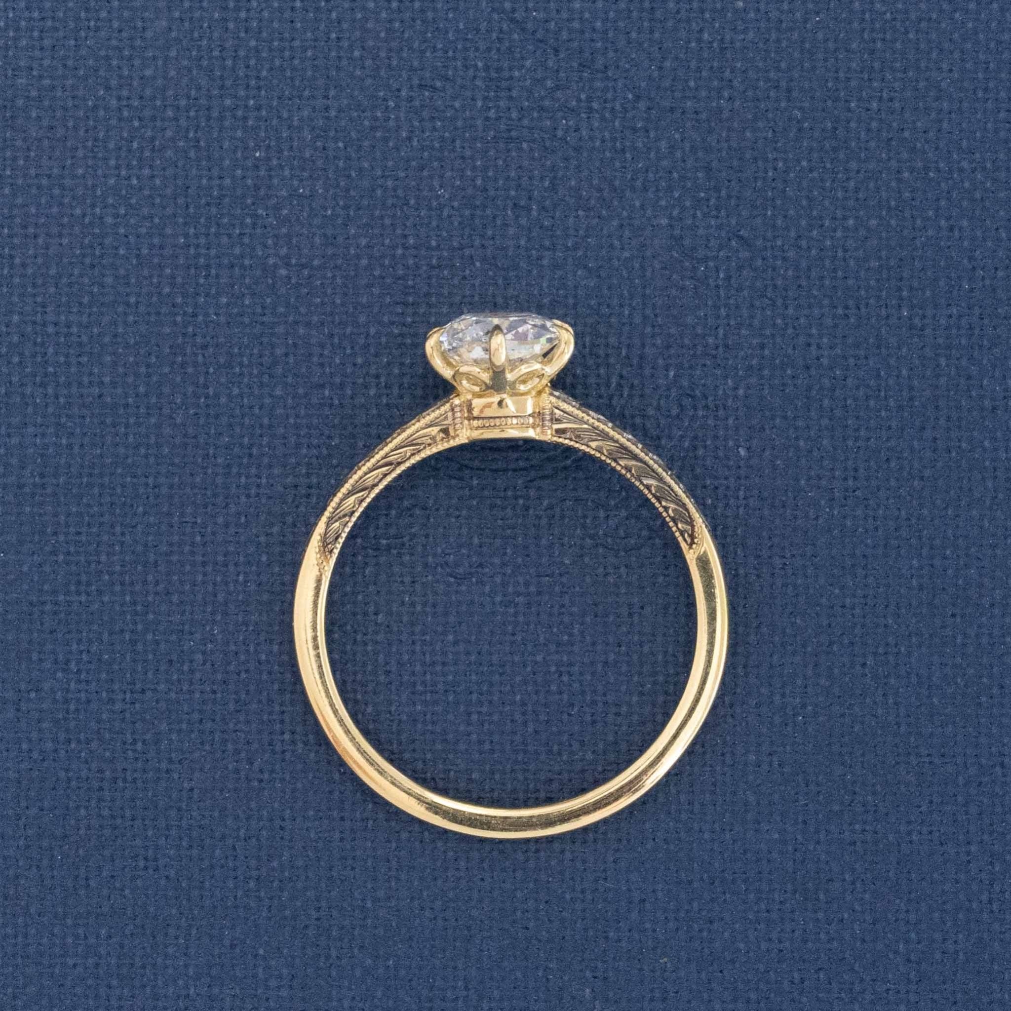 We wanted to create a setting modeled after a true vintage solitaire we once owned, complete with hand engraving and the rich patina of older solitaires. Set with a true antique old mine cut diamond sitting front and center! True to period, and just beyond charming. We love the stark difference between the richly patina'd gold setting against the bright, white diamond. Easy to stack but beautiful when worn solo.