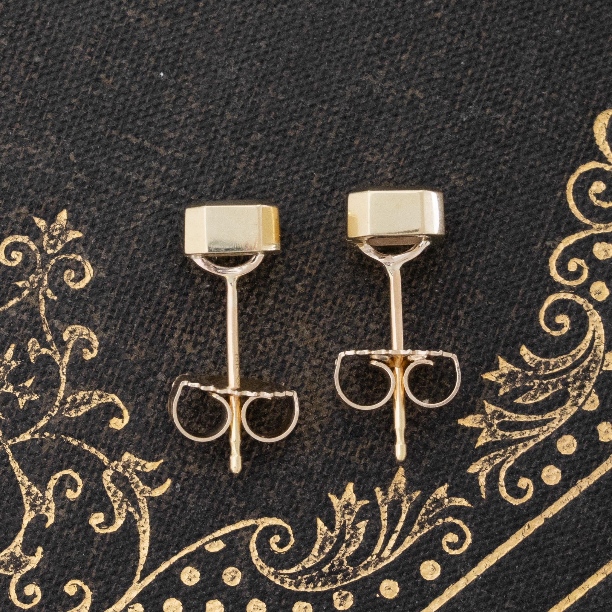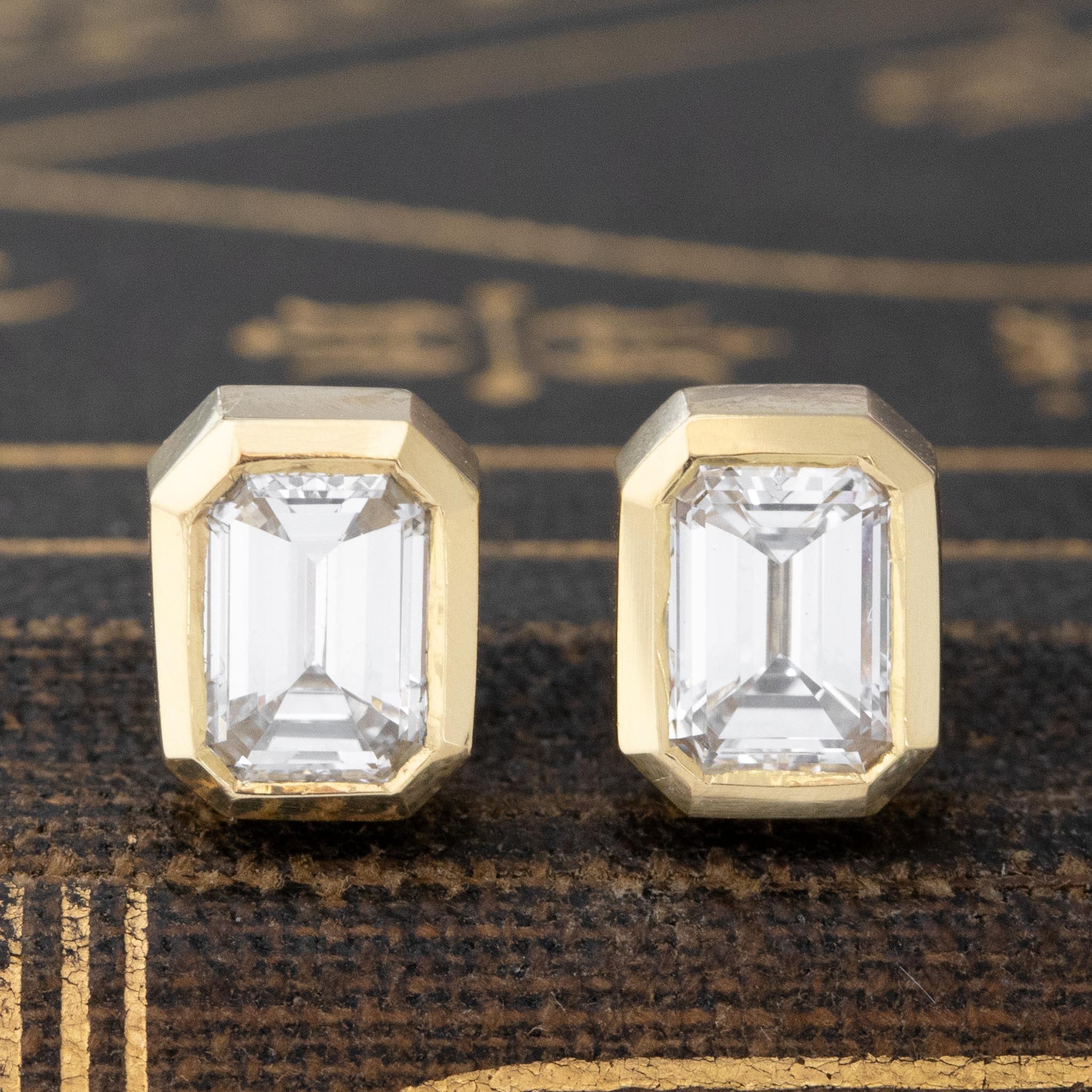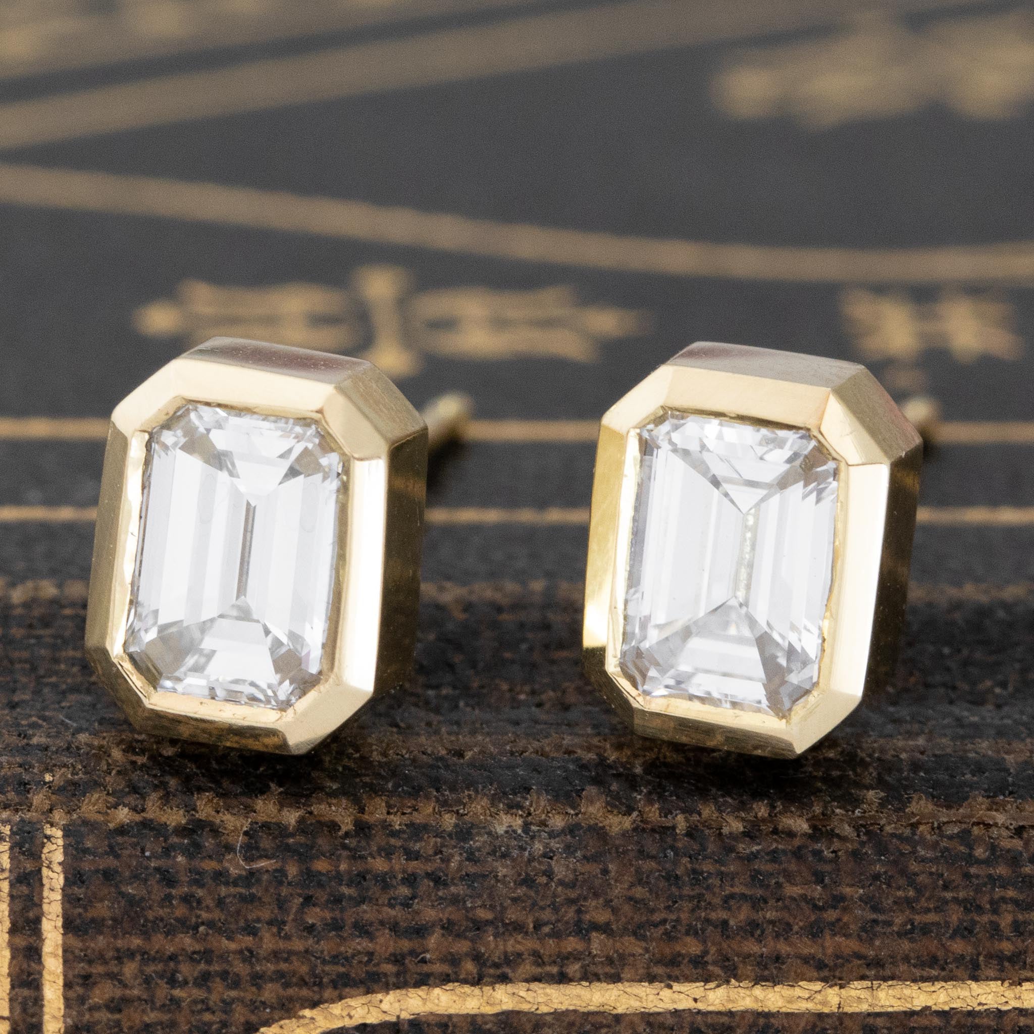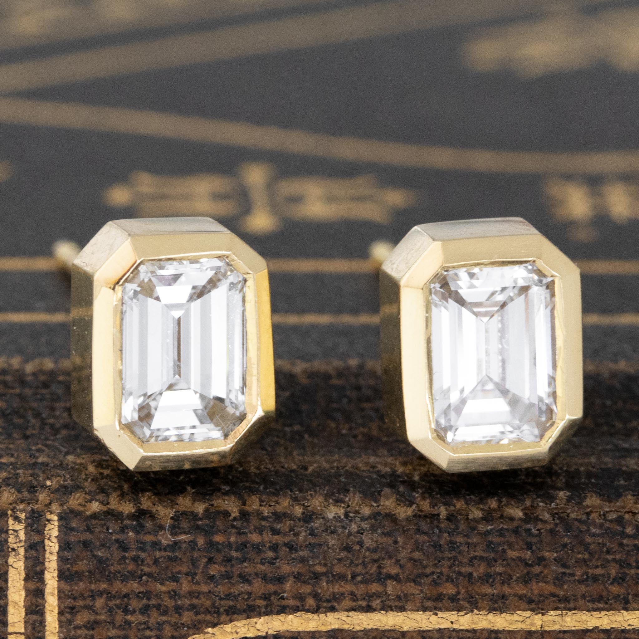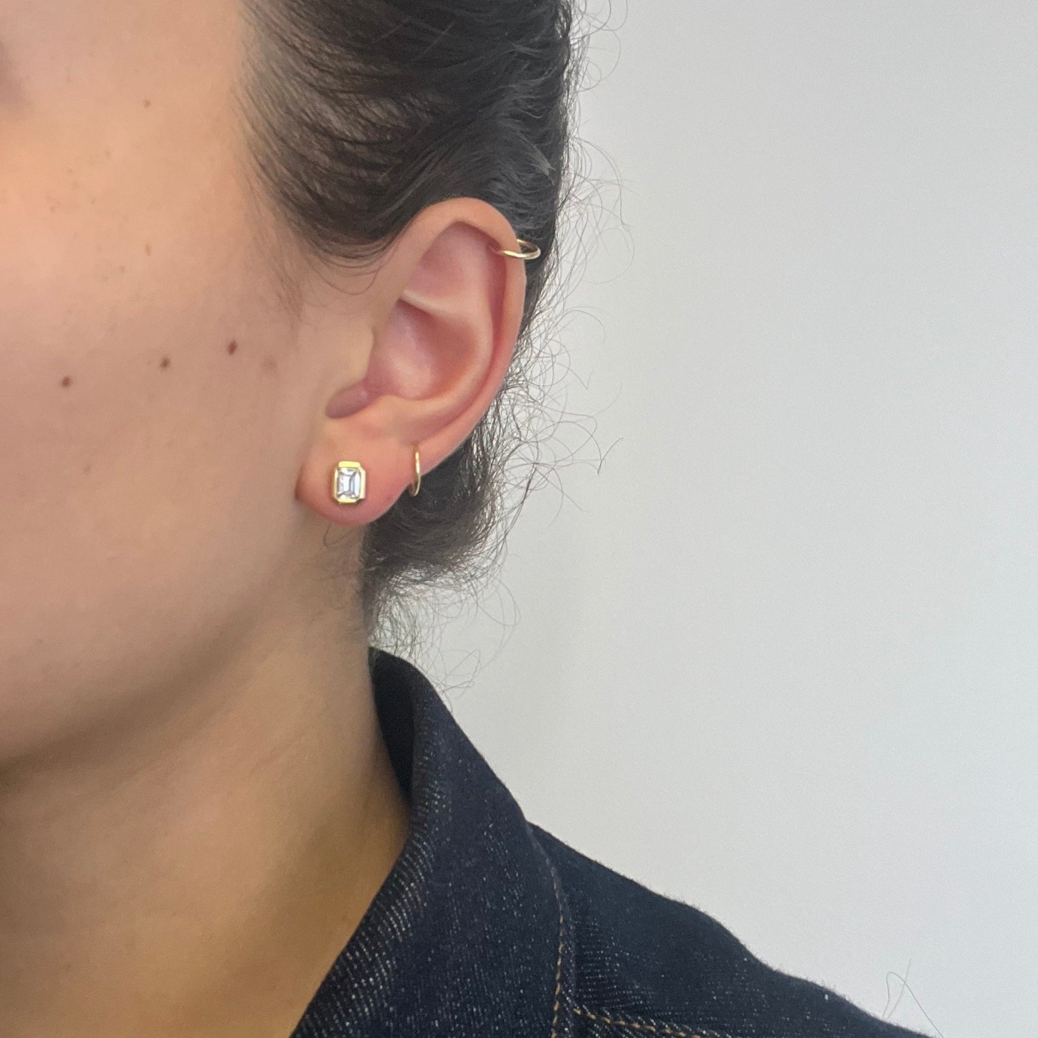 Bezel-set diamond studs are kind of our Achilles heel right now, especially when set in yellow gold! These classic emerald cut diamonds look simply stunning in these chunky gold bezels, which emphasize the geometric form of the stones in the most delicious way. A fun departure from a classic round diamond stud!