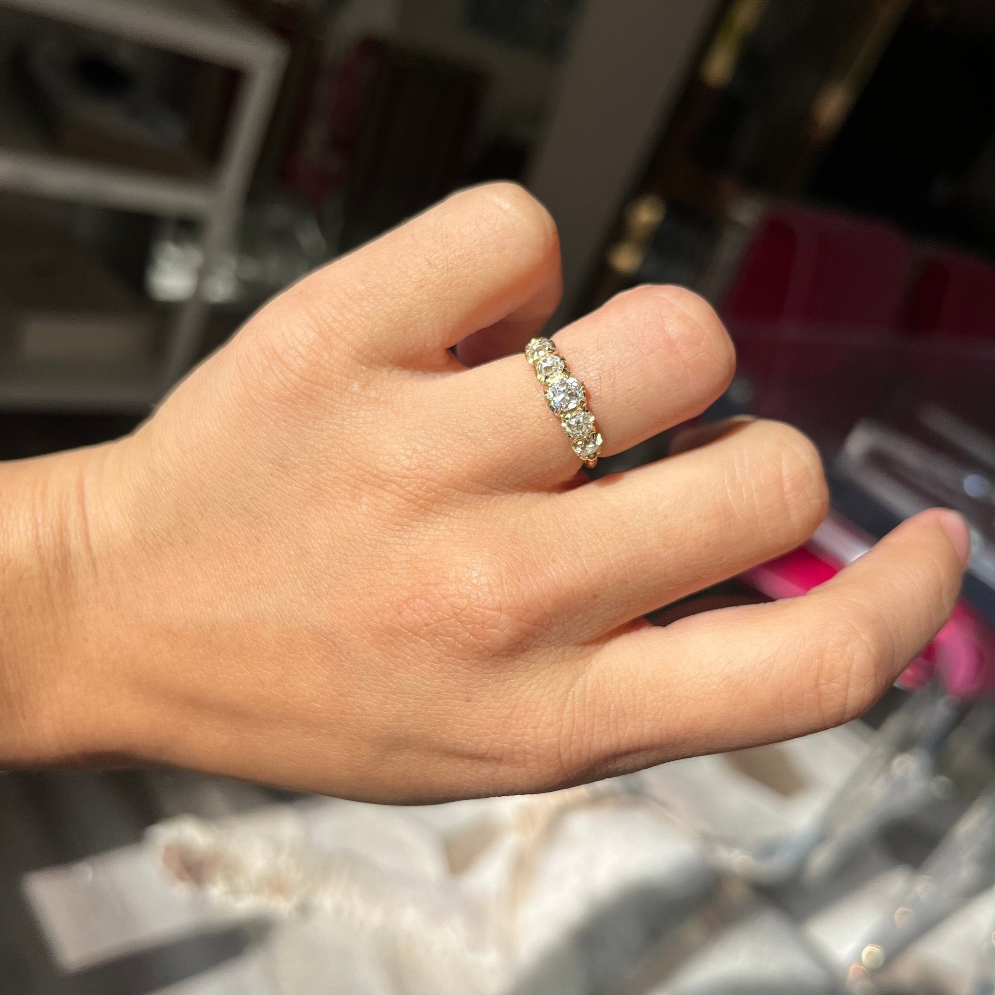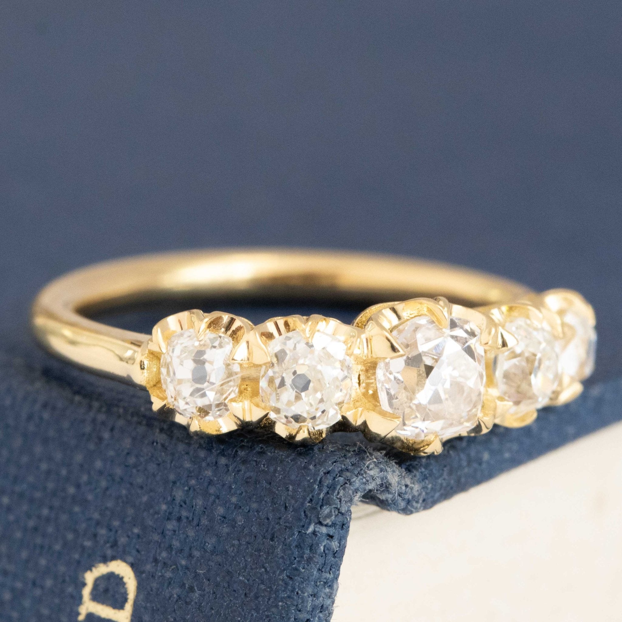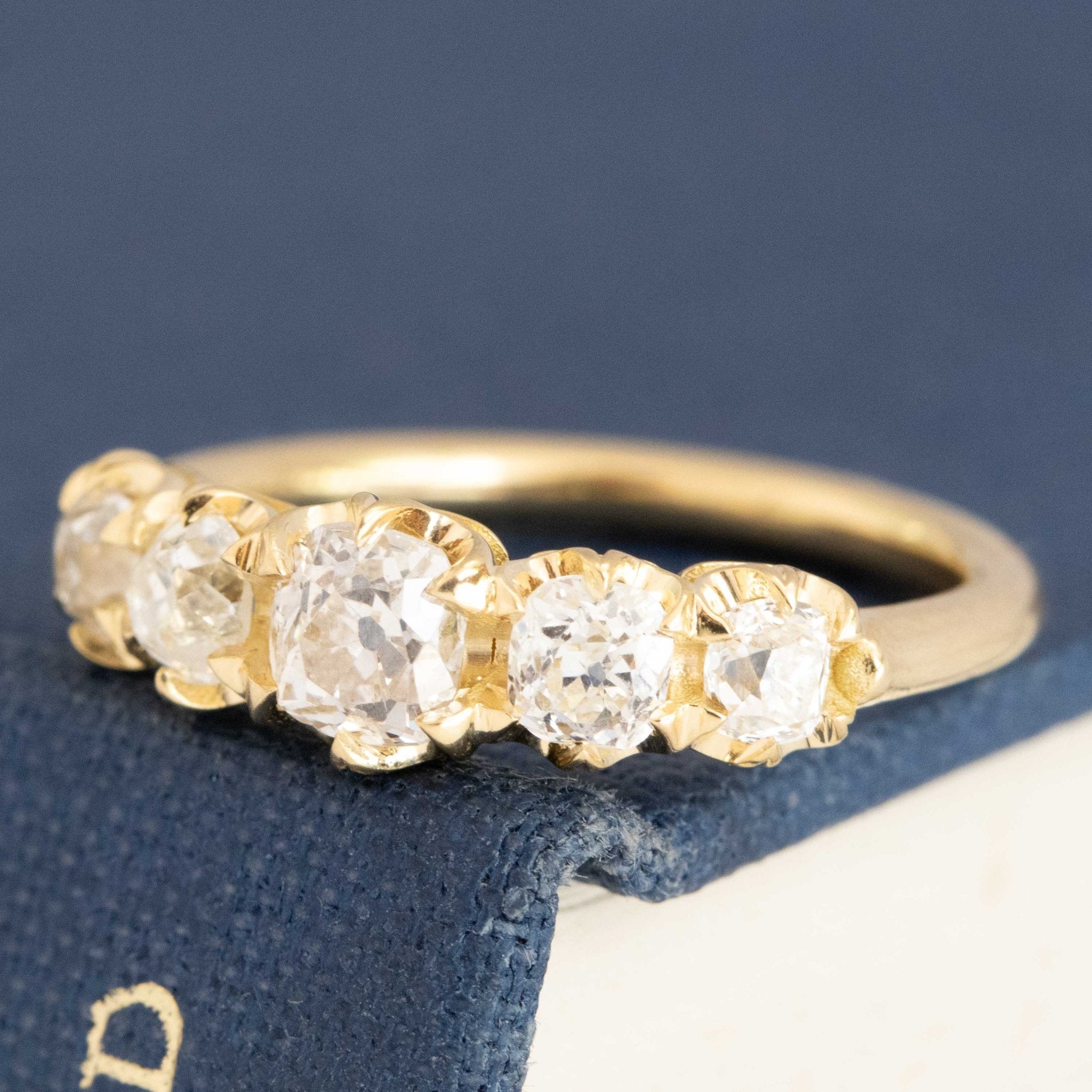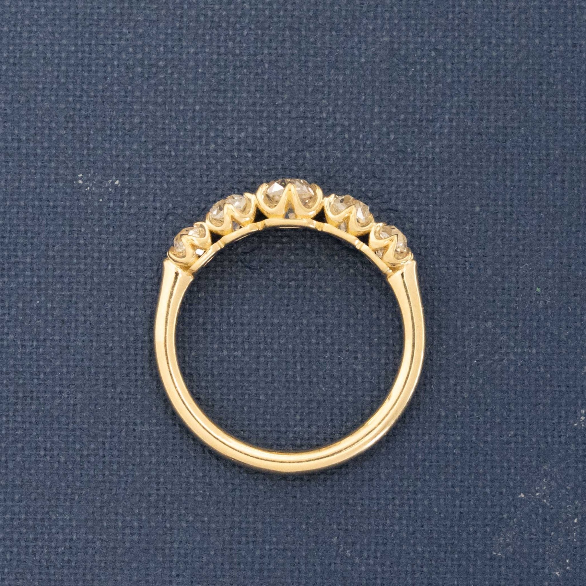 Modeled after antique diamond half-hoop bands from the Georgian and Victorian eras, this 5-stone band is set with chunky and charming old mine cut diamonds in yellow gold! The diamonds are bright, sparkly, twinkly - so elegant on the finger. This particular parcel is graduated in size, which maximizes diamond coverage in a subtle and unique way. We love how they stack with other bands just as much as we love ‘em when worn by themselves.