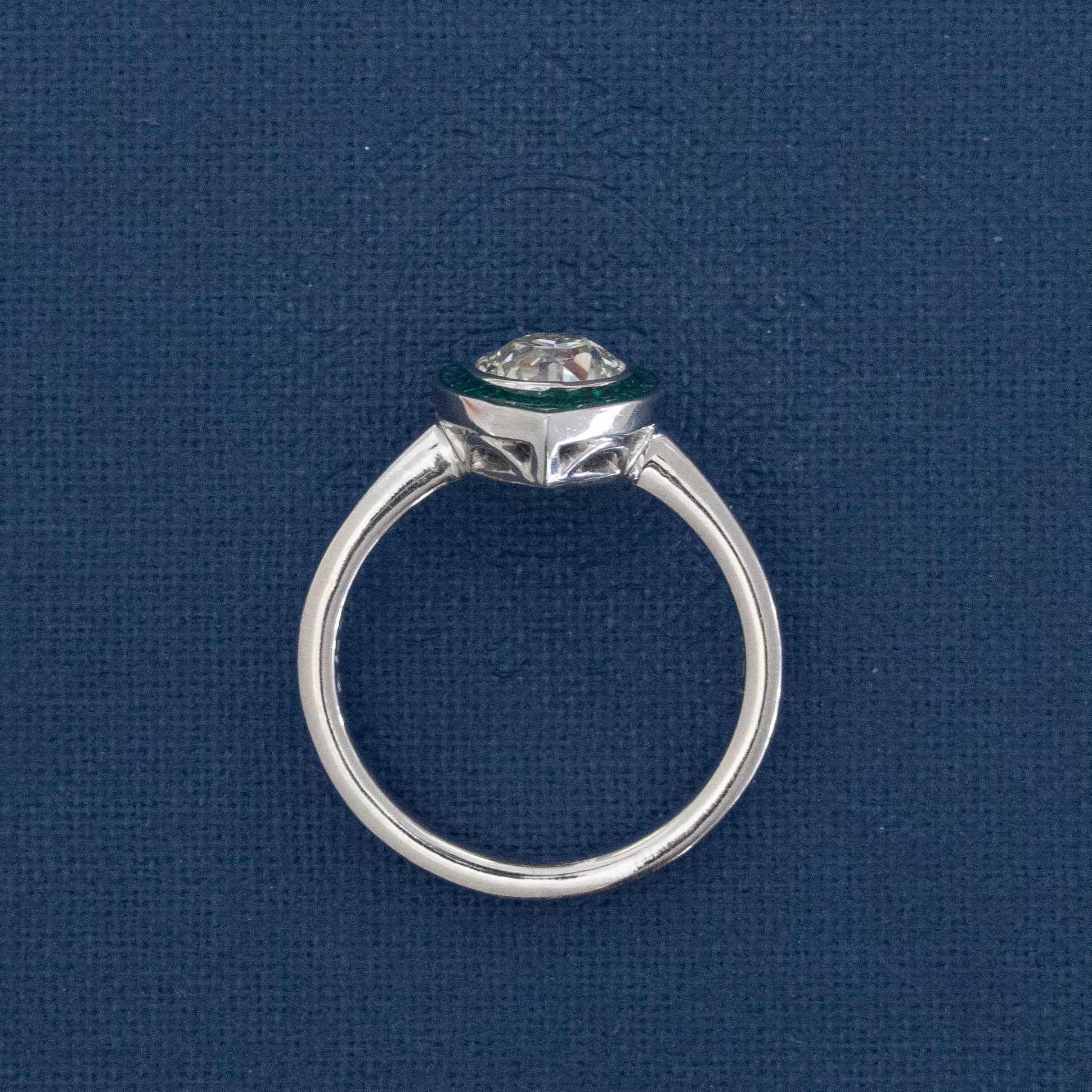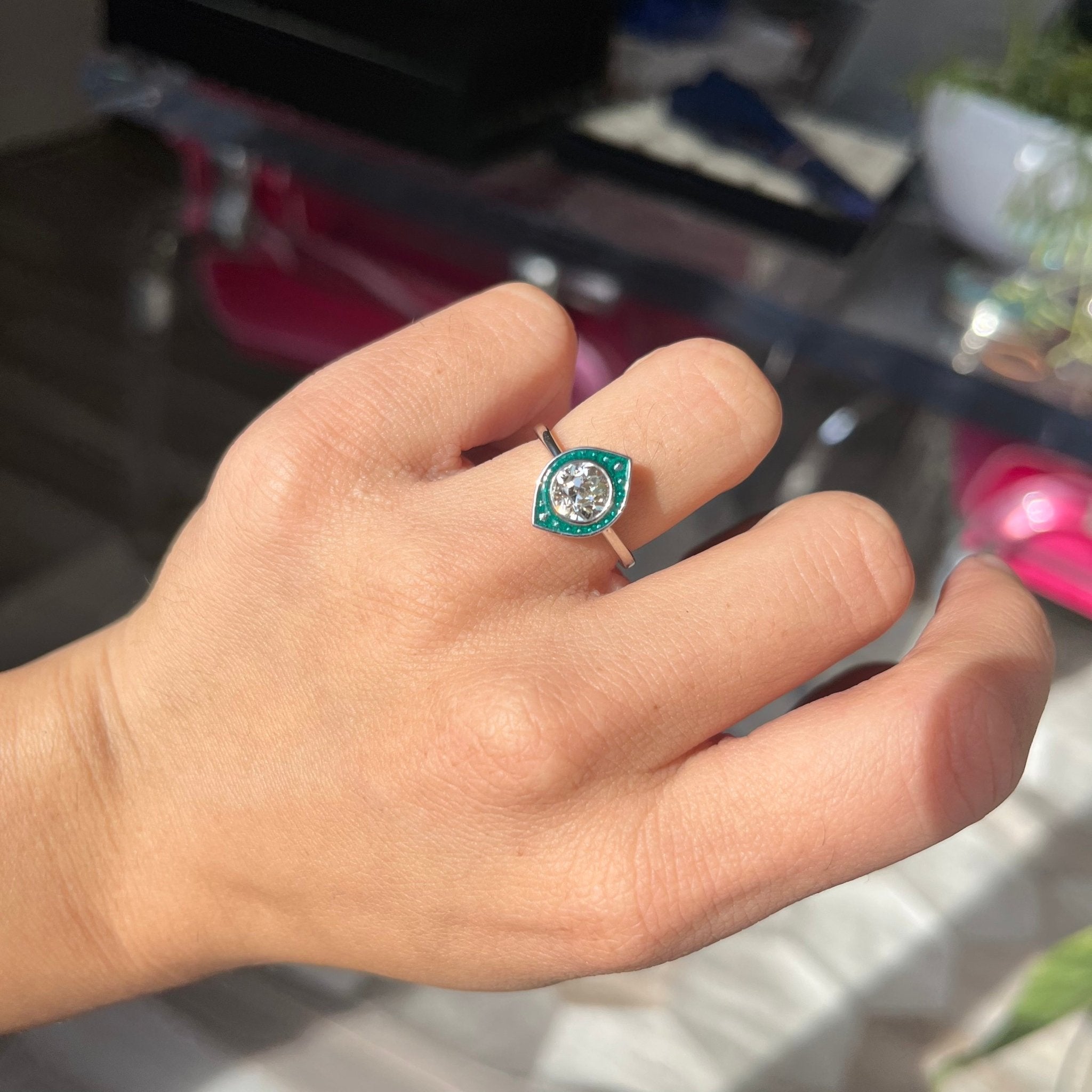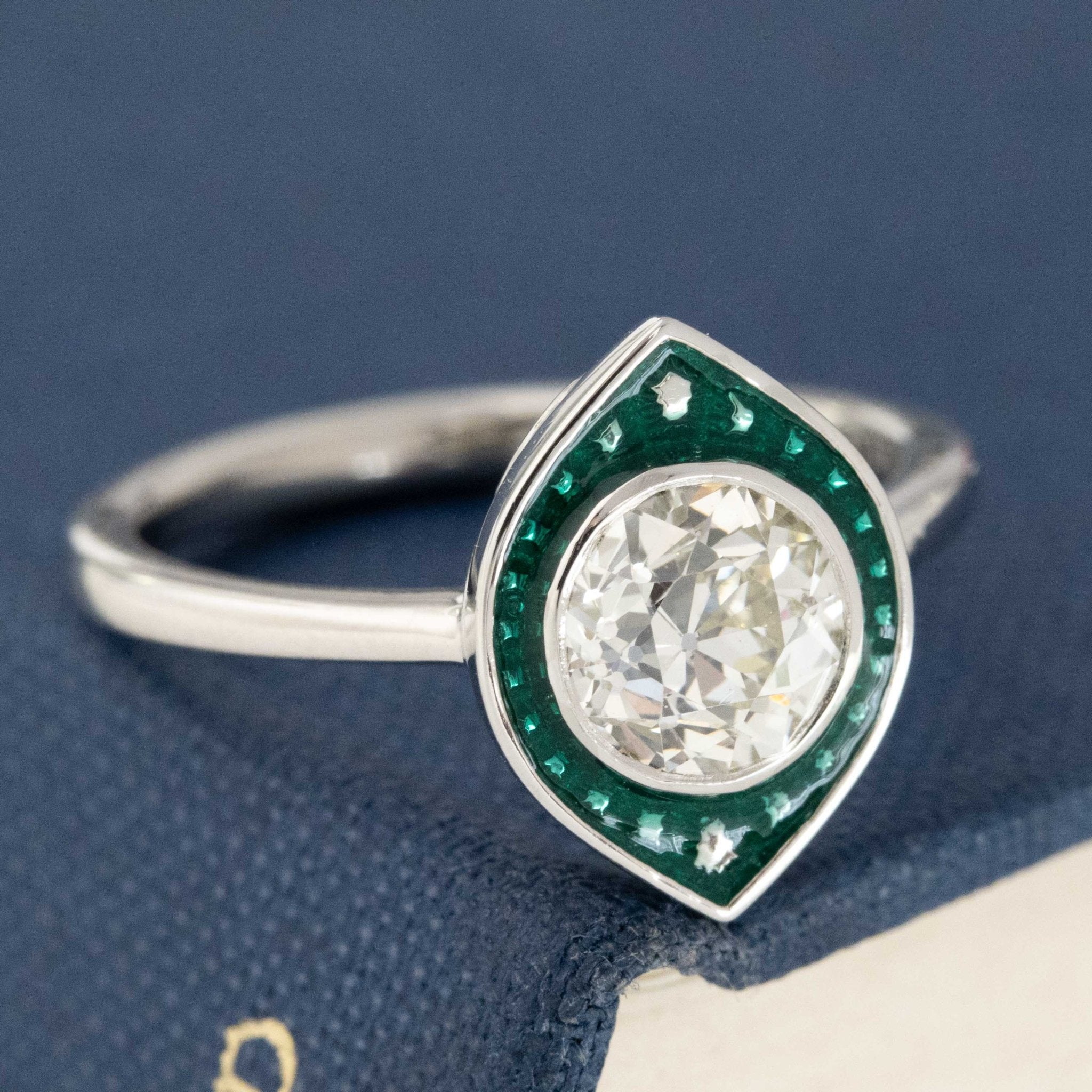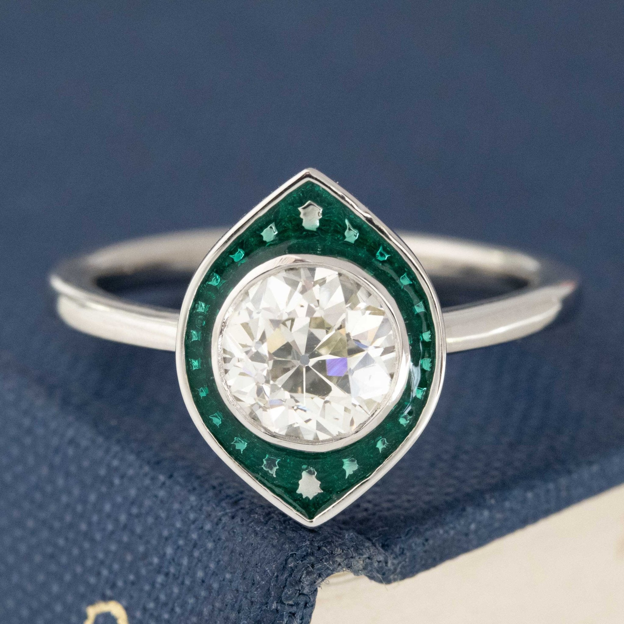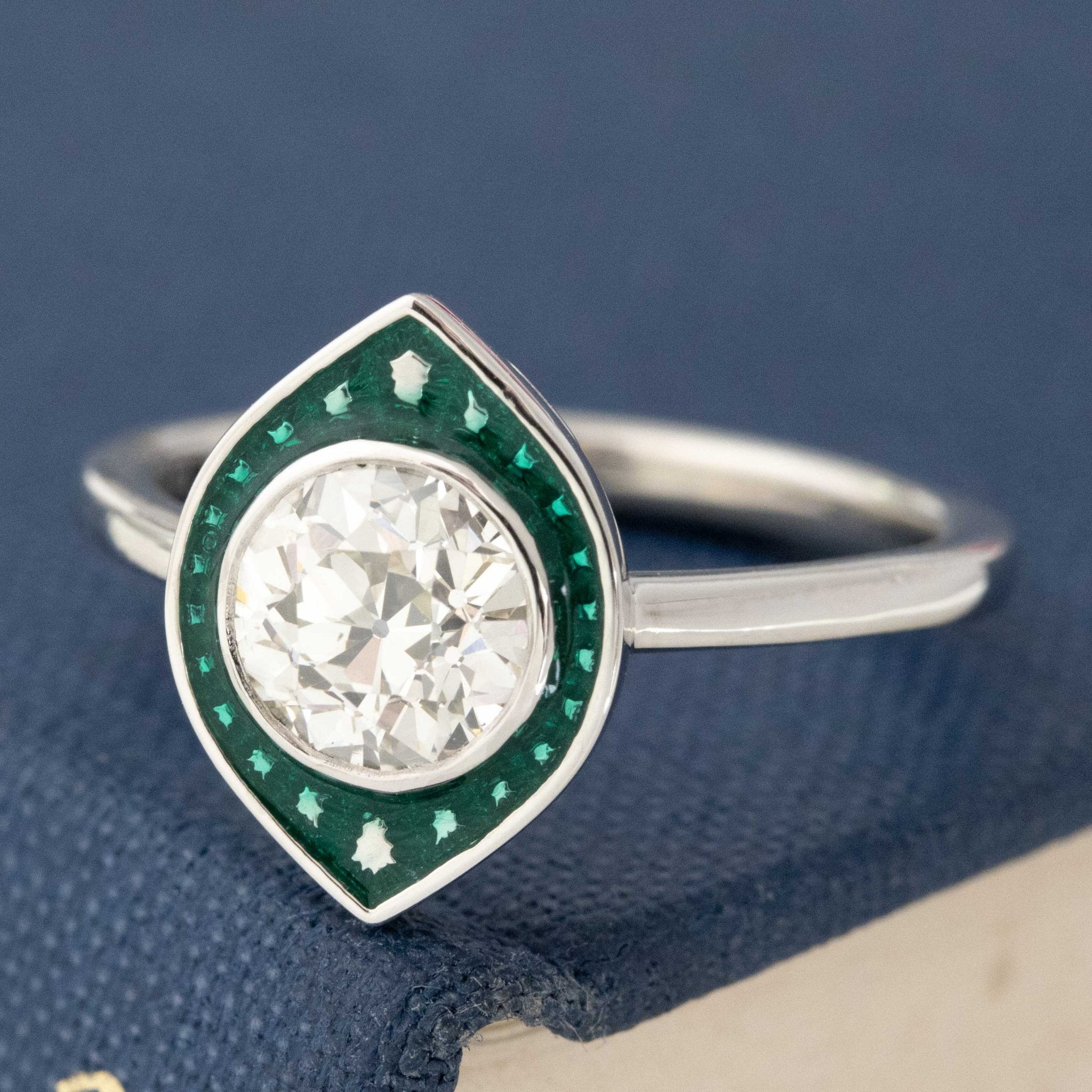 Inspired by the target halos of the Art Deco era, but our fresh take on the style using enamel! We set this chunky and bright antique Old Euro cut diamond in platinum, sitting in a navette-shaped halo of delicious green enamel with superfine milgrain detail throughout. Within that enamel halo are little mounds of platinum to help mimic faceting, giving the ring a really unique and special look. Spready on the finger and a bright, prismatic face up to boot!