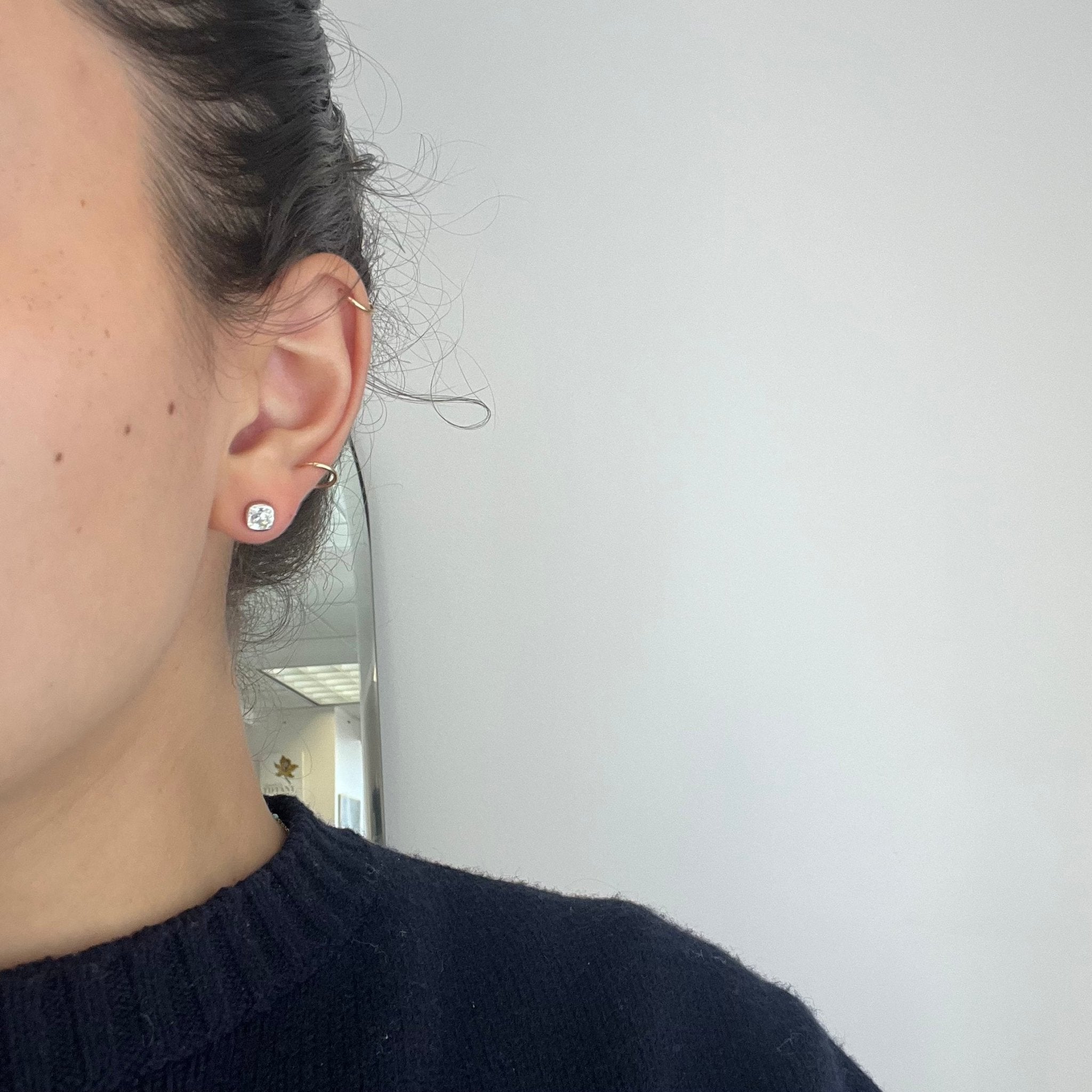 Chunky, bright, and most def unique! Bright and fiery old mine cut diamonds bezel set in 14kt white gold is classic and timeless, and just the perfect size on the lobes. A daily staple, for sure!