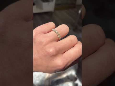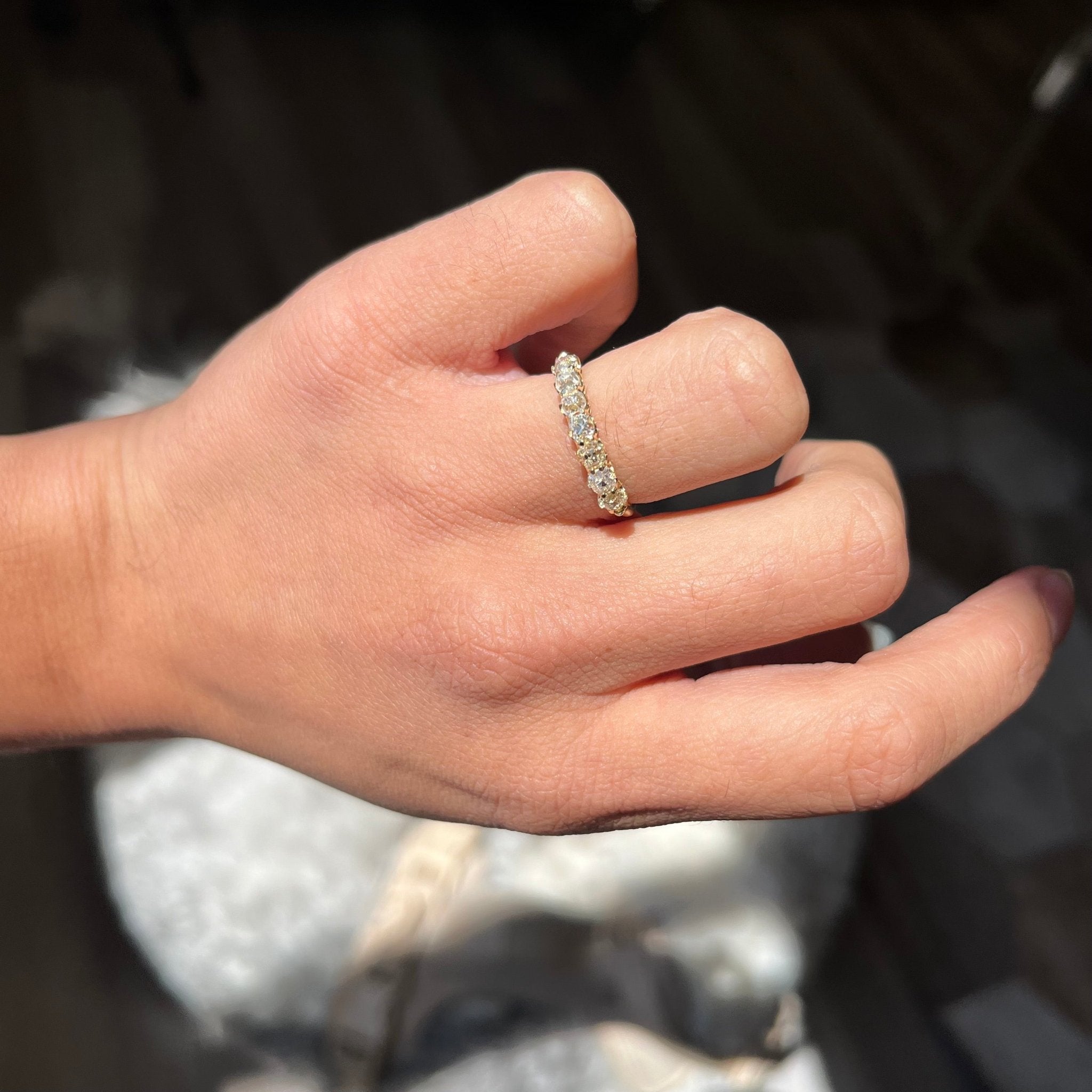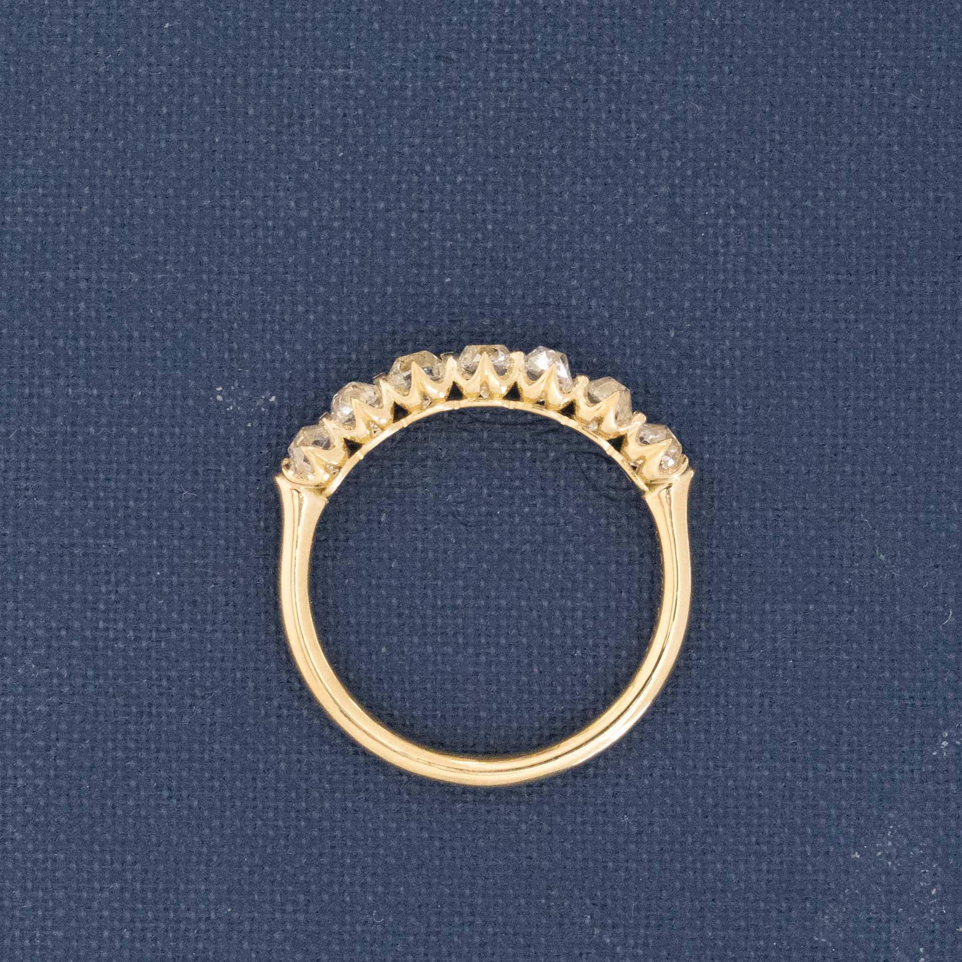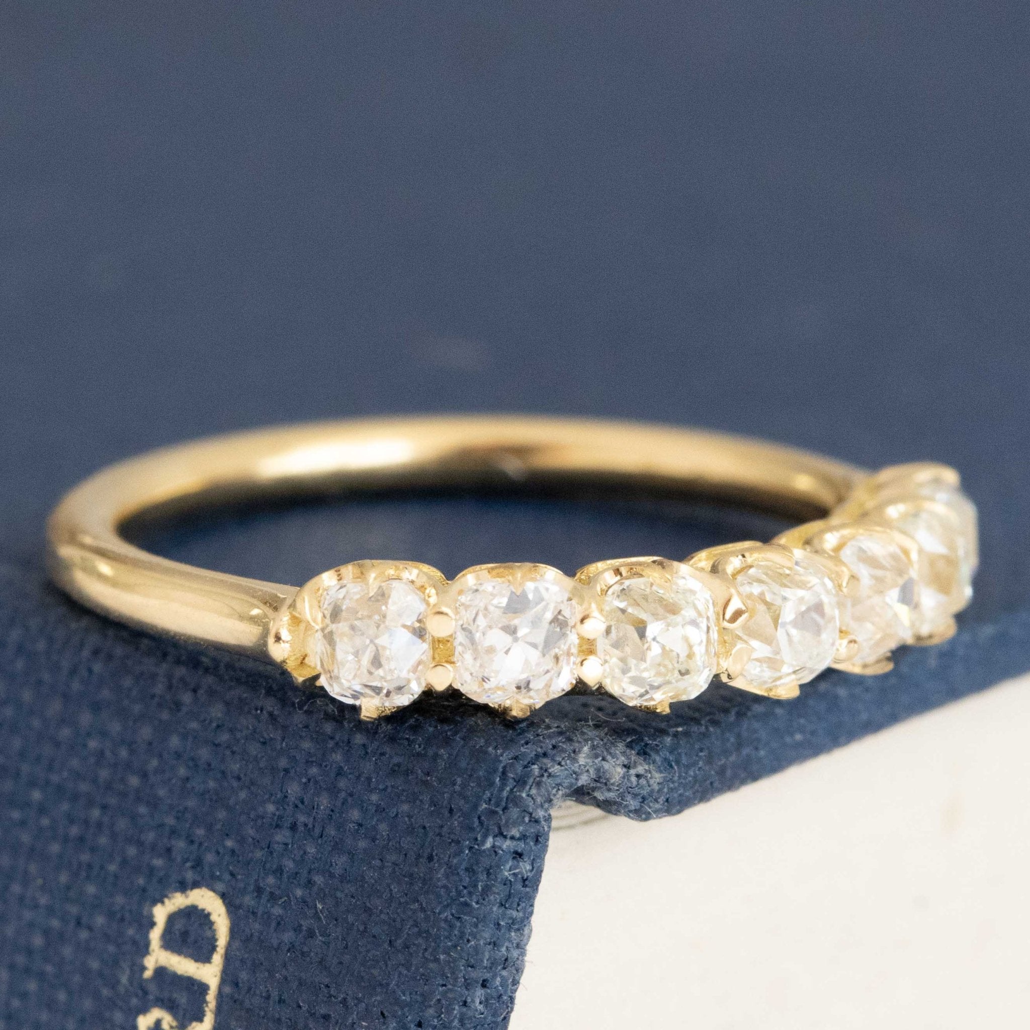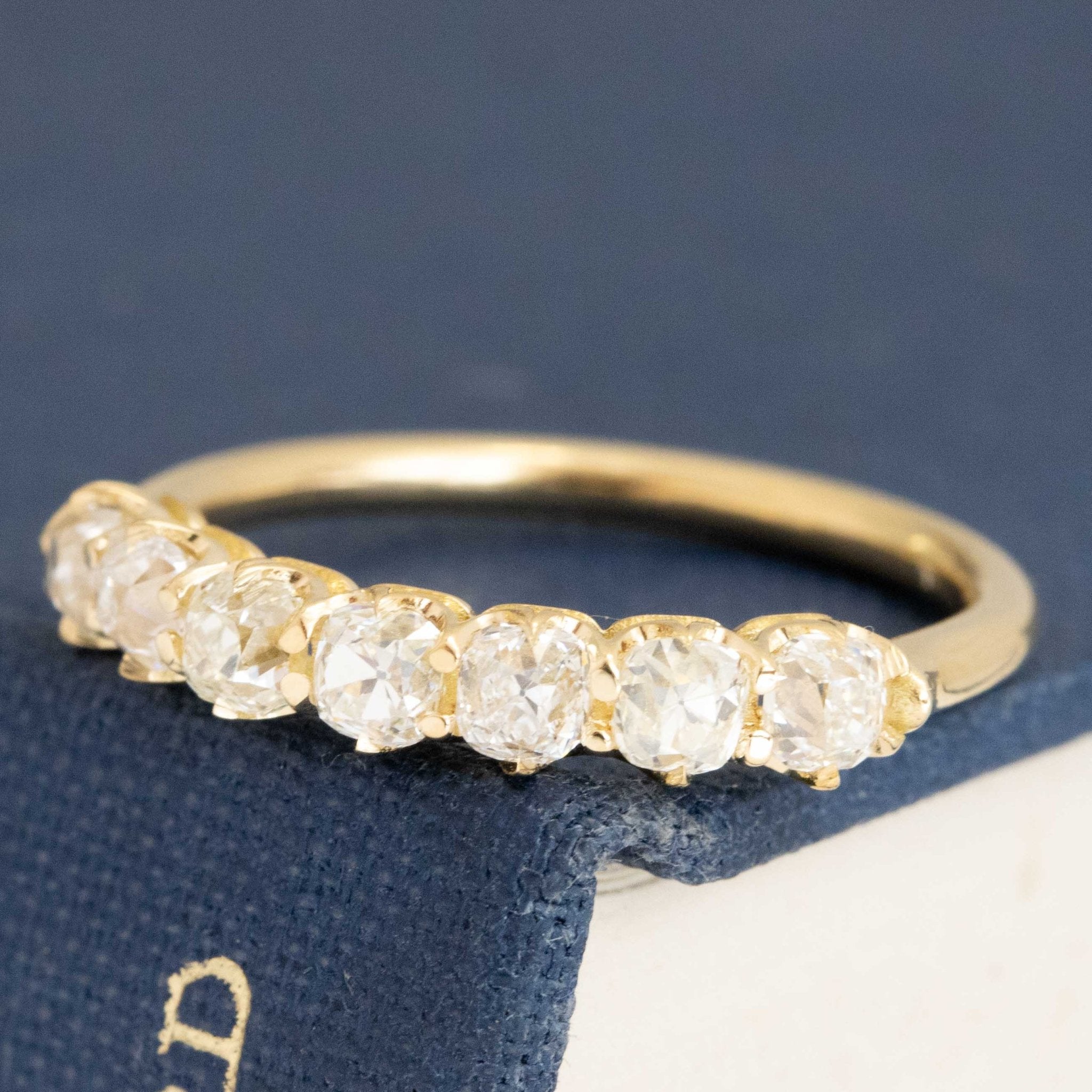 Modeled after antique diamond half-hoop bands from the Georgian and Victorian eras, this 7-stone band is set with chunky and charming old mine cut diamonds in 18kt yellow gold! The diamonds are bright and sparkly, twinkly and sparking brightly - so beautiful and elegant on the finger. This is the perfect size for those wanting something smaller and more delicate in scale.