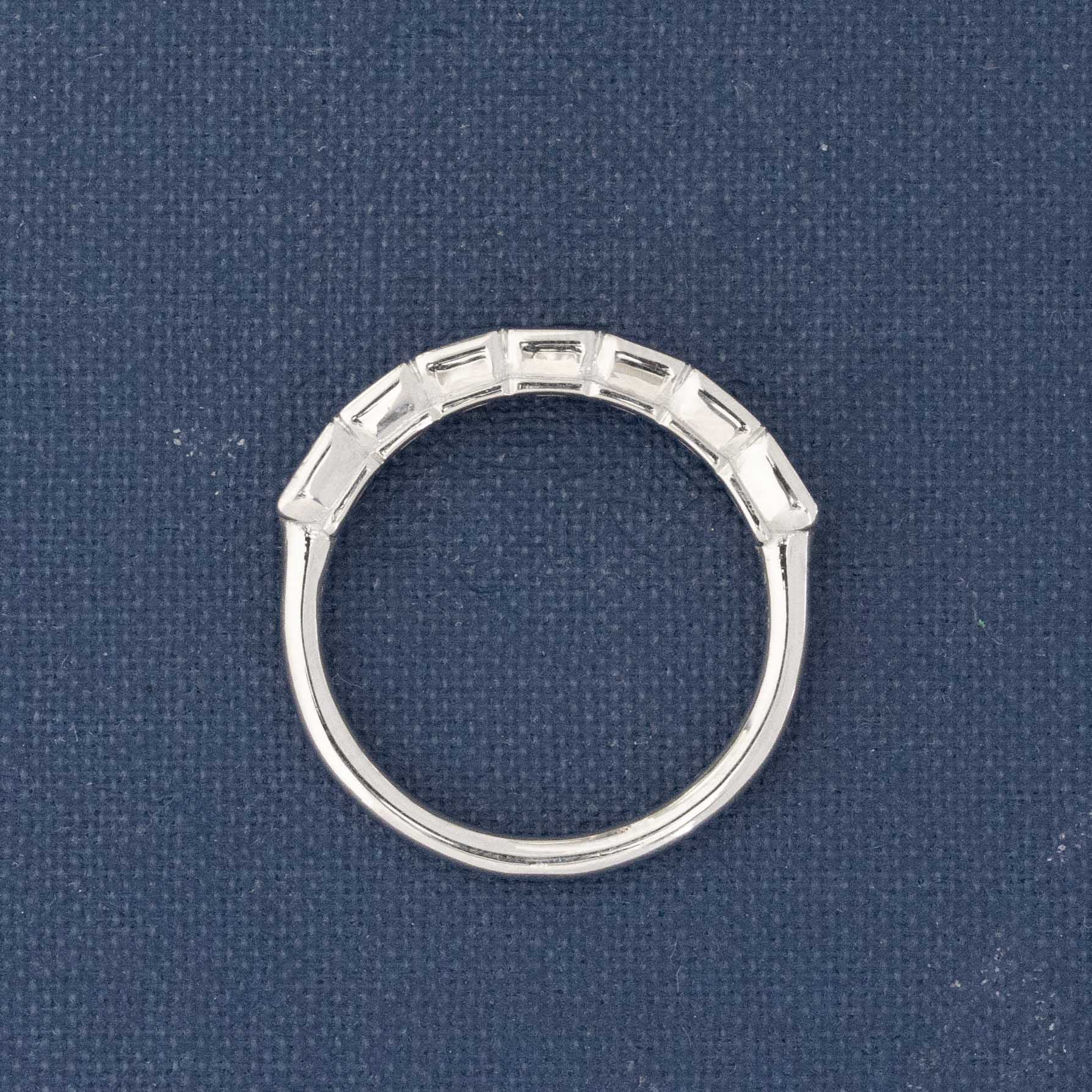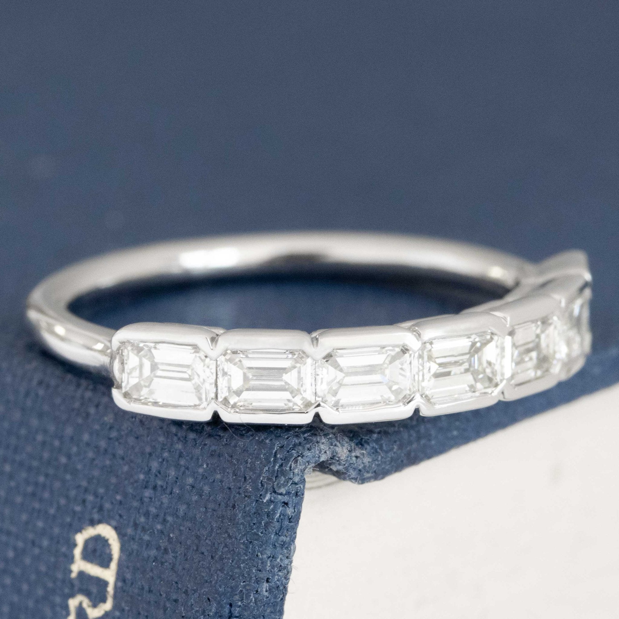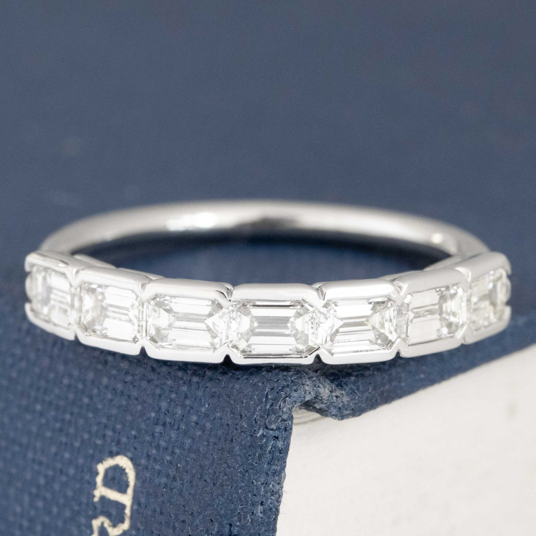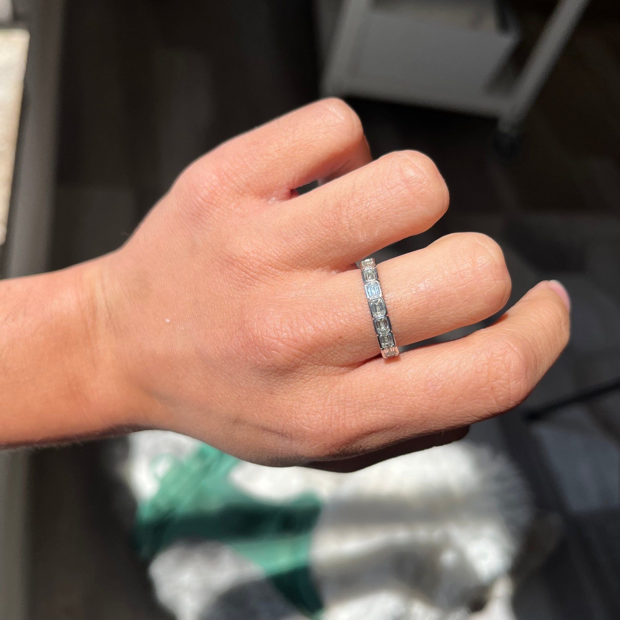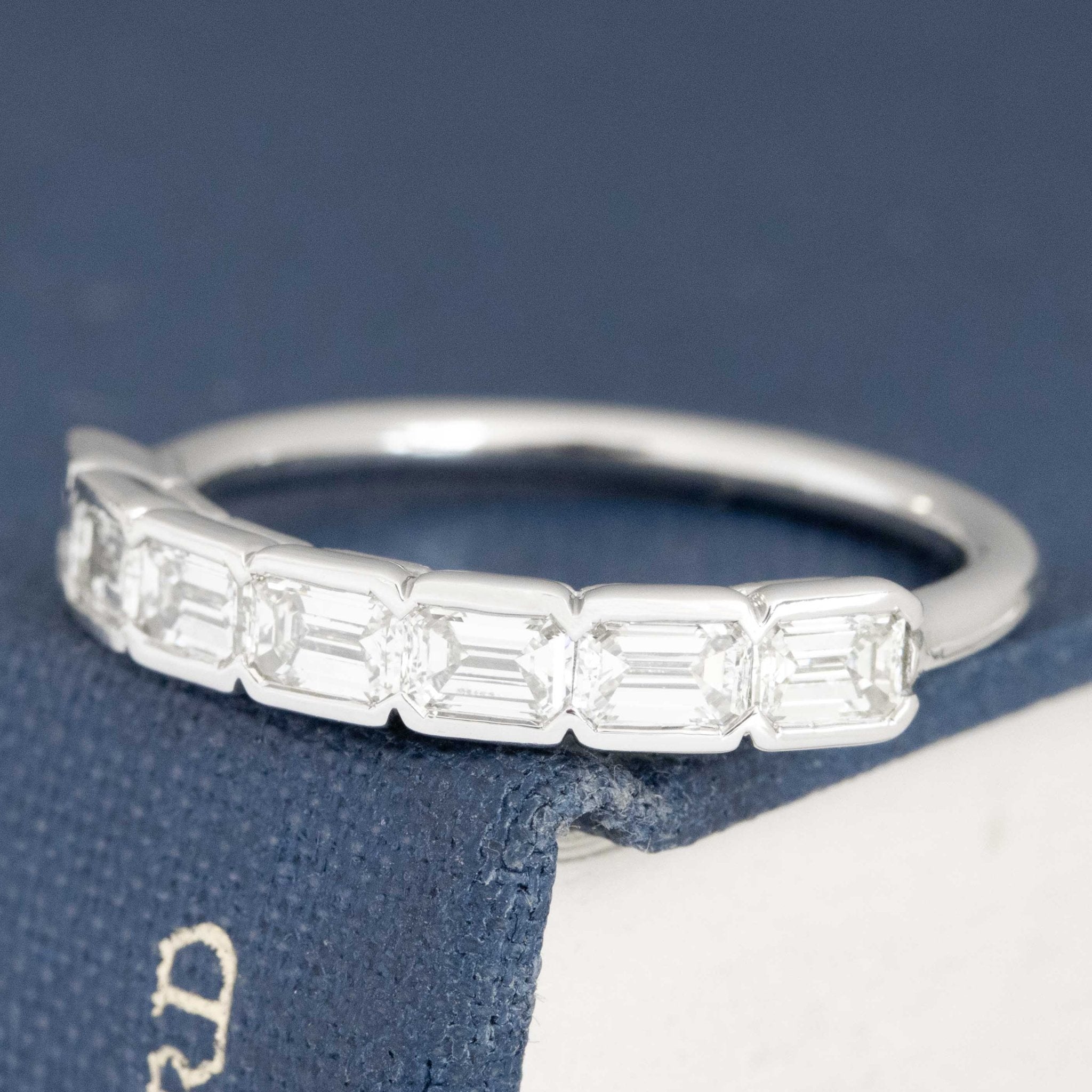 Fresh from our latest drop of half-hoop bands, this time with emerald cut diamonds set in half bezels! The stones span across the top of the finger beautifully, giving you total diamond coverage at a great value.