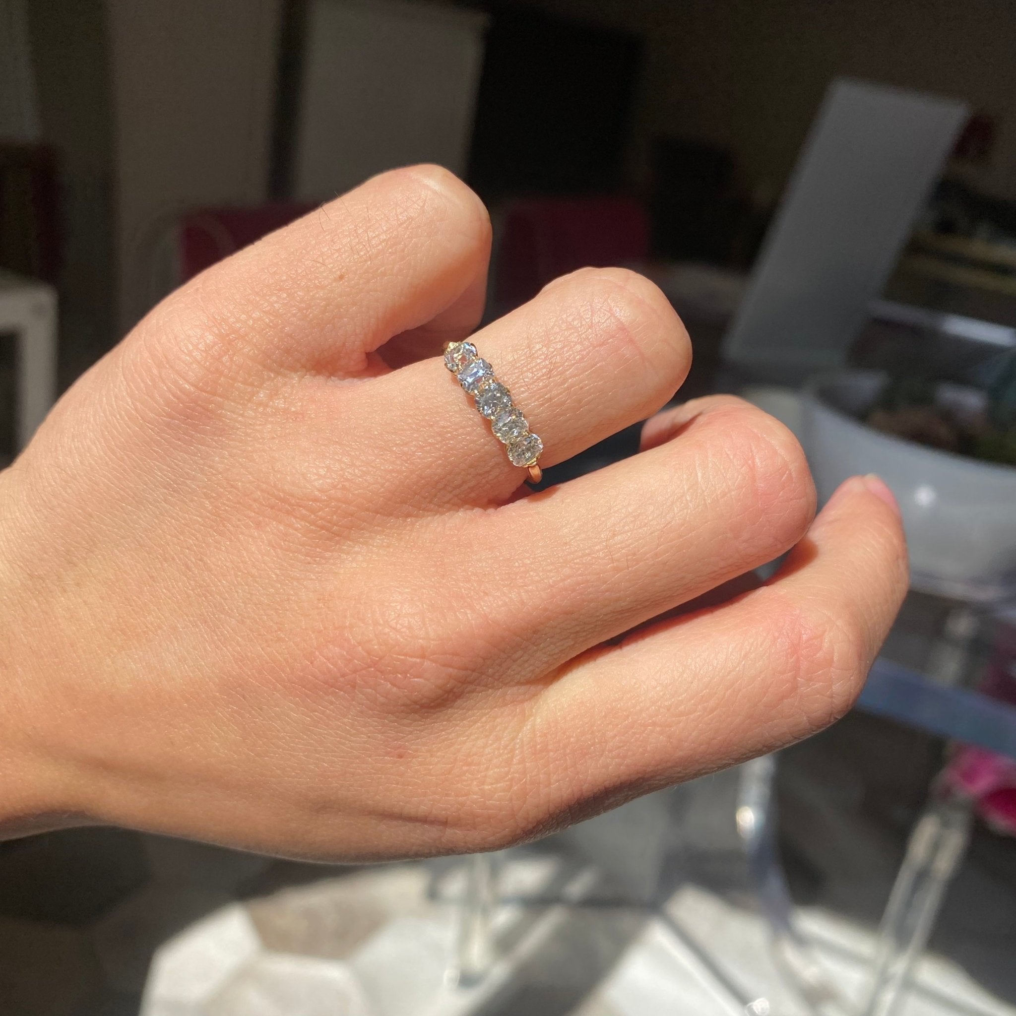 Modeled after antique diamond bands from the Georgian and Victorian eras, this 5-stone band is set with 5 chunky and charming old mine cut diamonds in 18kt yellow gold! The diamonds are bright and sparkly and just looks so beautiful and elegant on the finger.