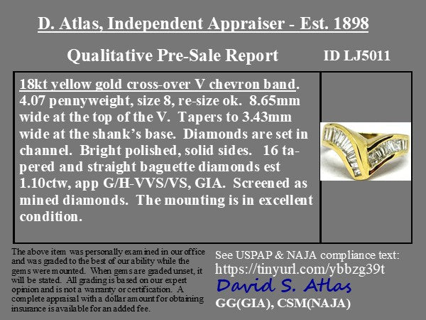 A channel-set baguette diamond band and a chevron motif meet in a bar - the result is this fabulous vintage ring with lots of presence and character! We love the combination of the two common styles and think it would make an excellent wedding band or pointer finger ring. The style, made popular in the 80s, should also allow it to sit nice and flush next to an engagement ring.