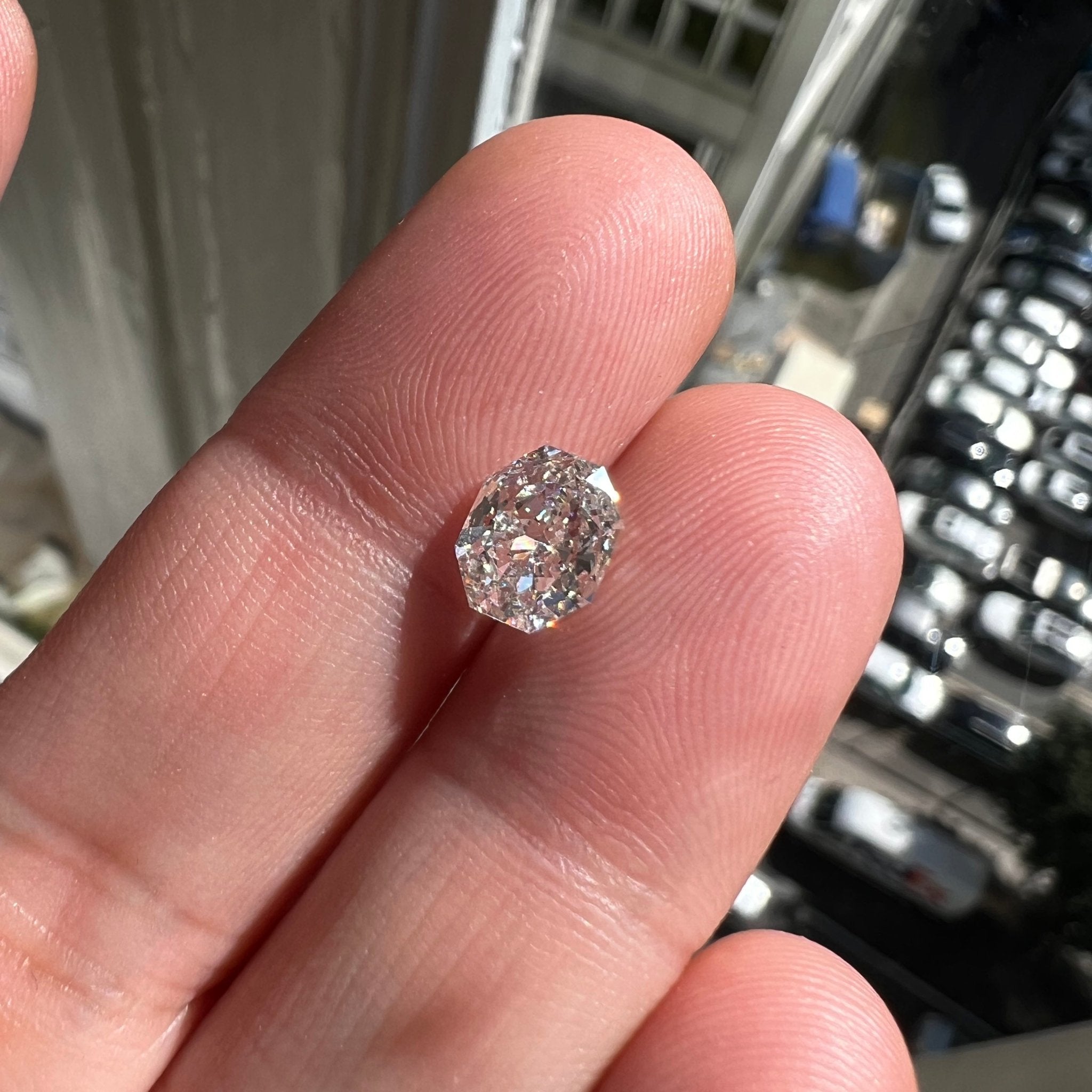 One of my fave diamond shapes - an octagonal cut with deeply clipped corners! This diamond is super bright and lively - what a stunning ring or pendant this diamond would make.