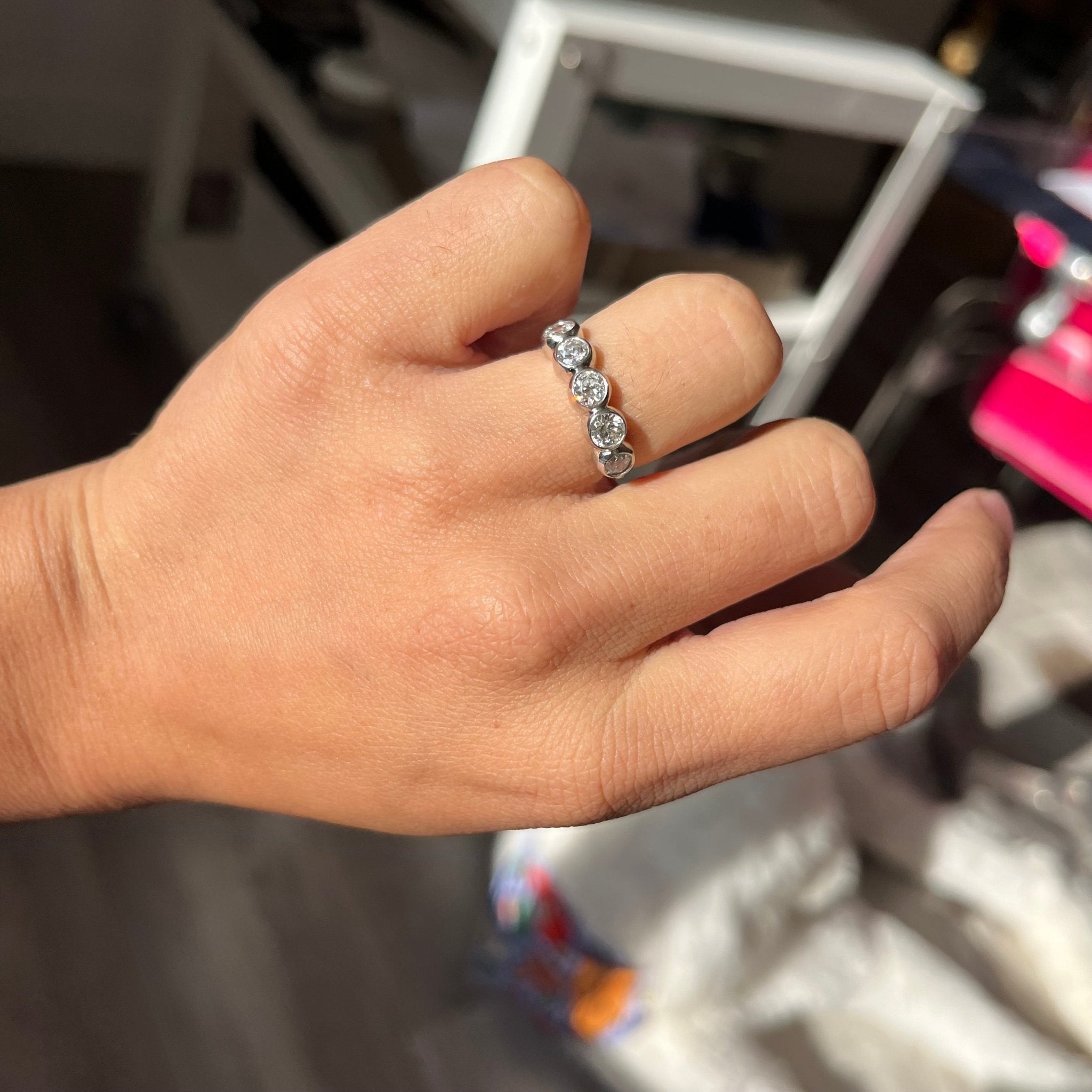 Using our meticulously matched upcycled Old European cut diamonds, we put together this suite of 5 beautifully matched OECs to create this bezel band. Low set on the finger and packing a big visual punch, the band will stack beautifully with other bands, and/or rings.