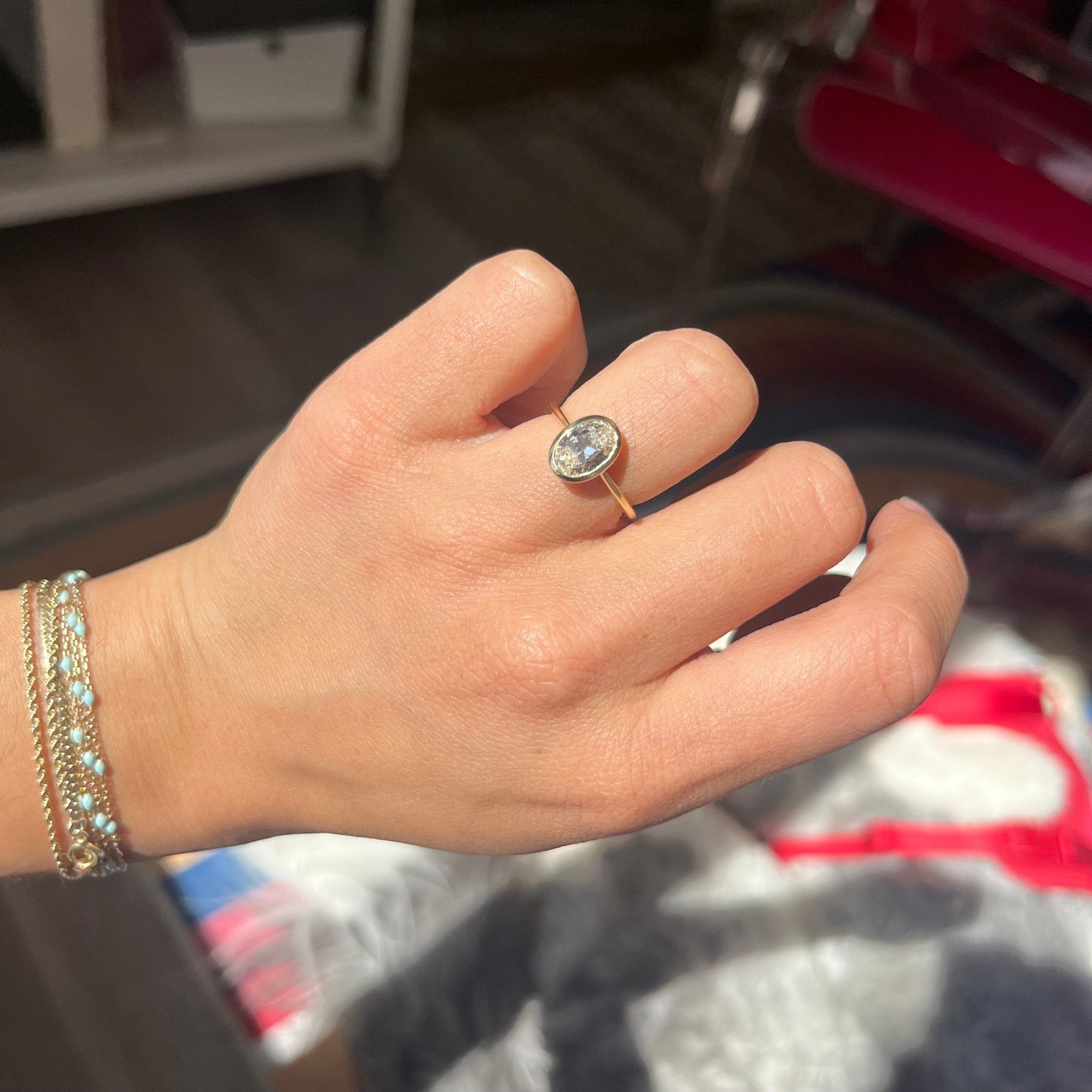 A rare find in the market - the antique oval shaped diamond! This beauty is everything we love in the cut - elegant shape, chunky and broad facets, and best of all - super sparkly! We set this beautiful stone in a simple bezel, allowing the stone to literally shine in all its glory. I just love how simple and elegant this ring is!