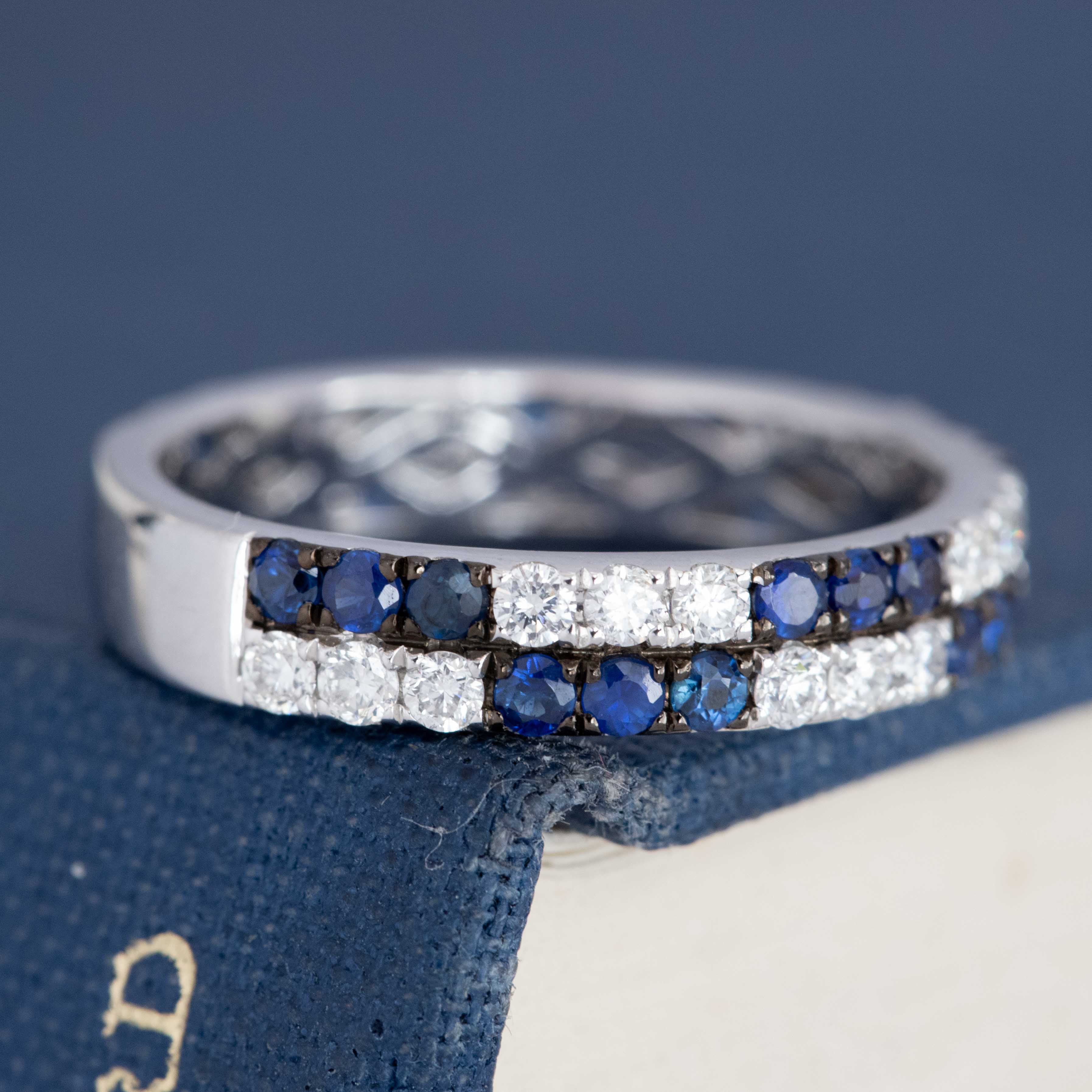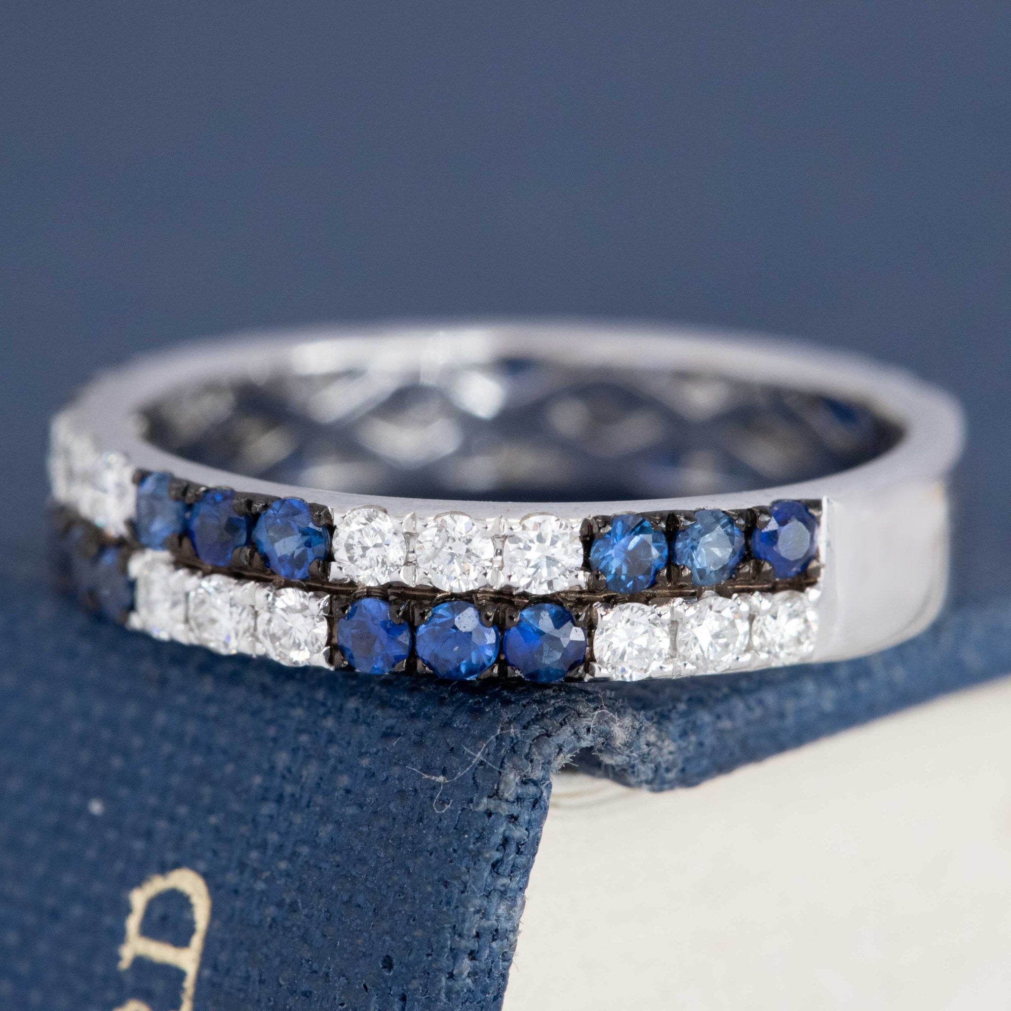 I love whenever checkerboard patterns are applied in jewelry - diamonds and sapphires really take the cake! This band is slim but the color contrast still comes through and reads in a lovely way. Perfect for stacking, perhaps with a white metal engagement ring or a chunky gold band.