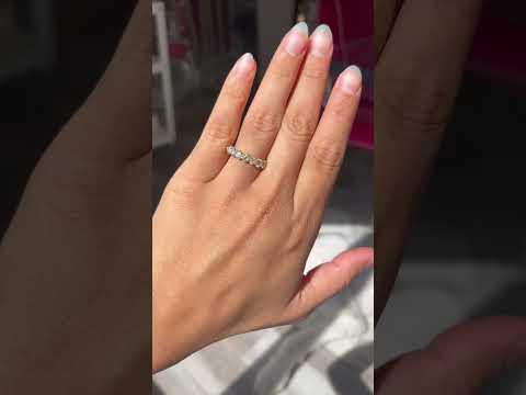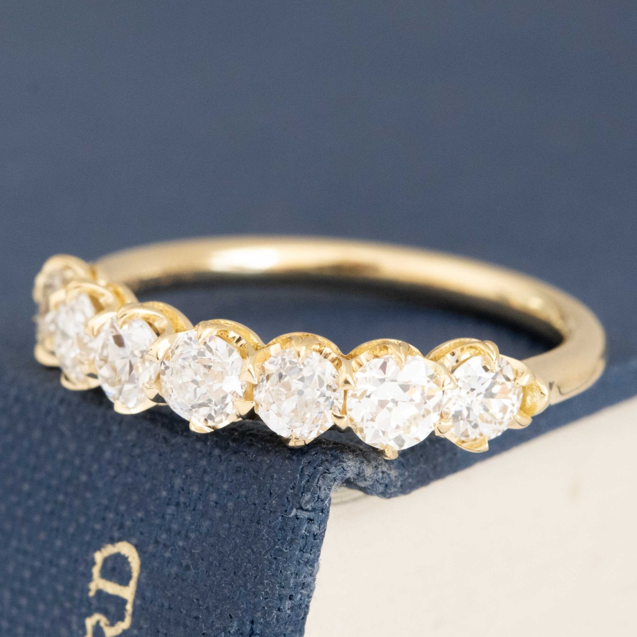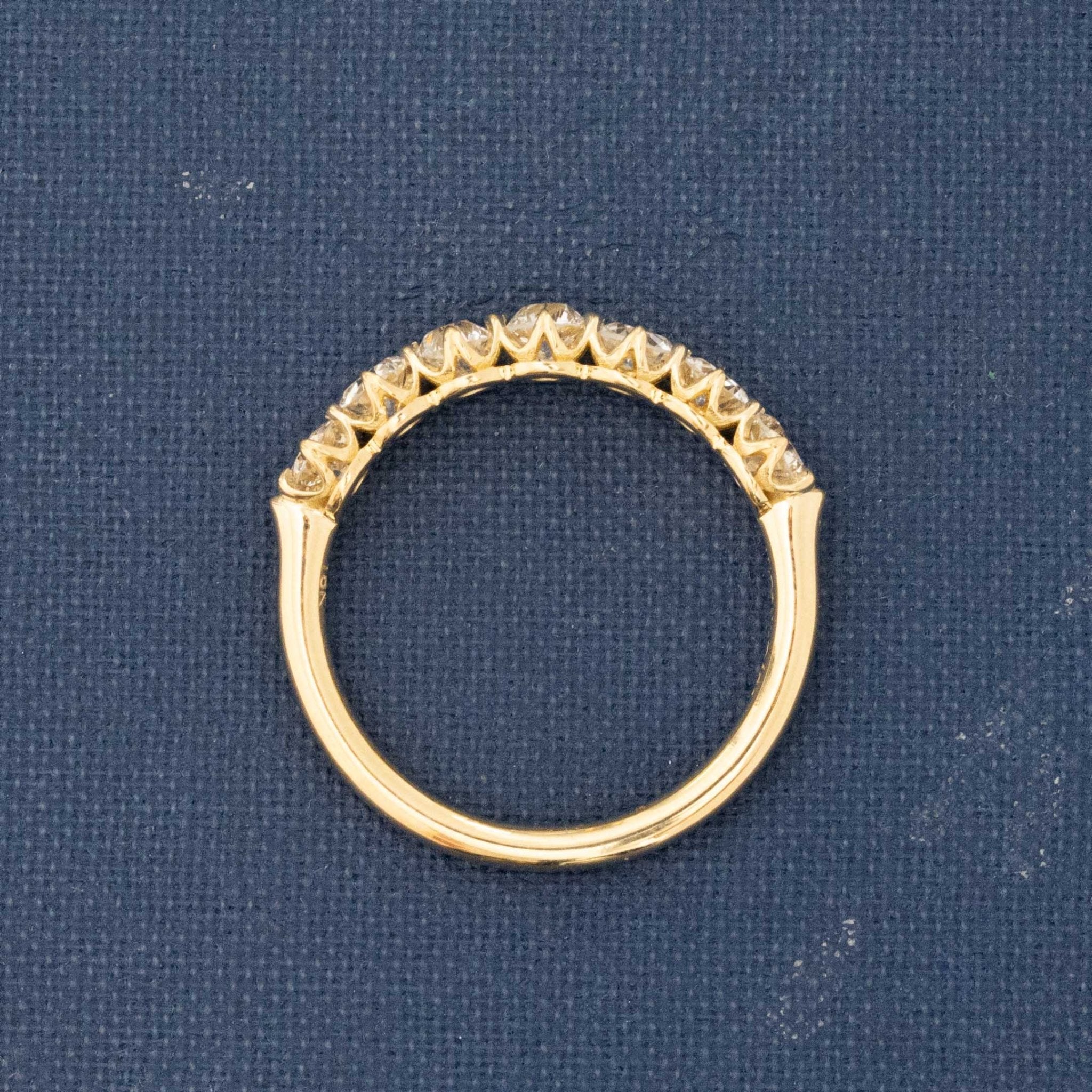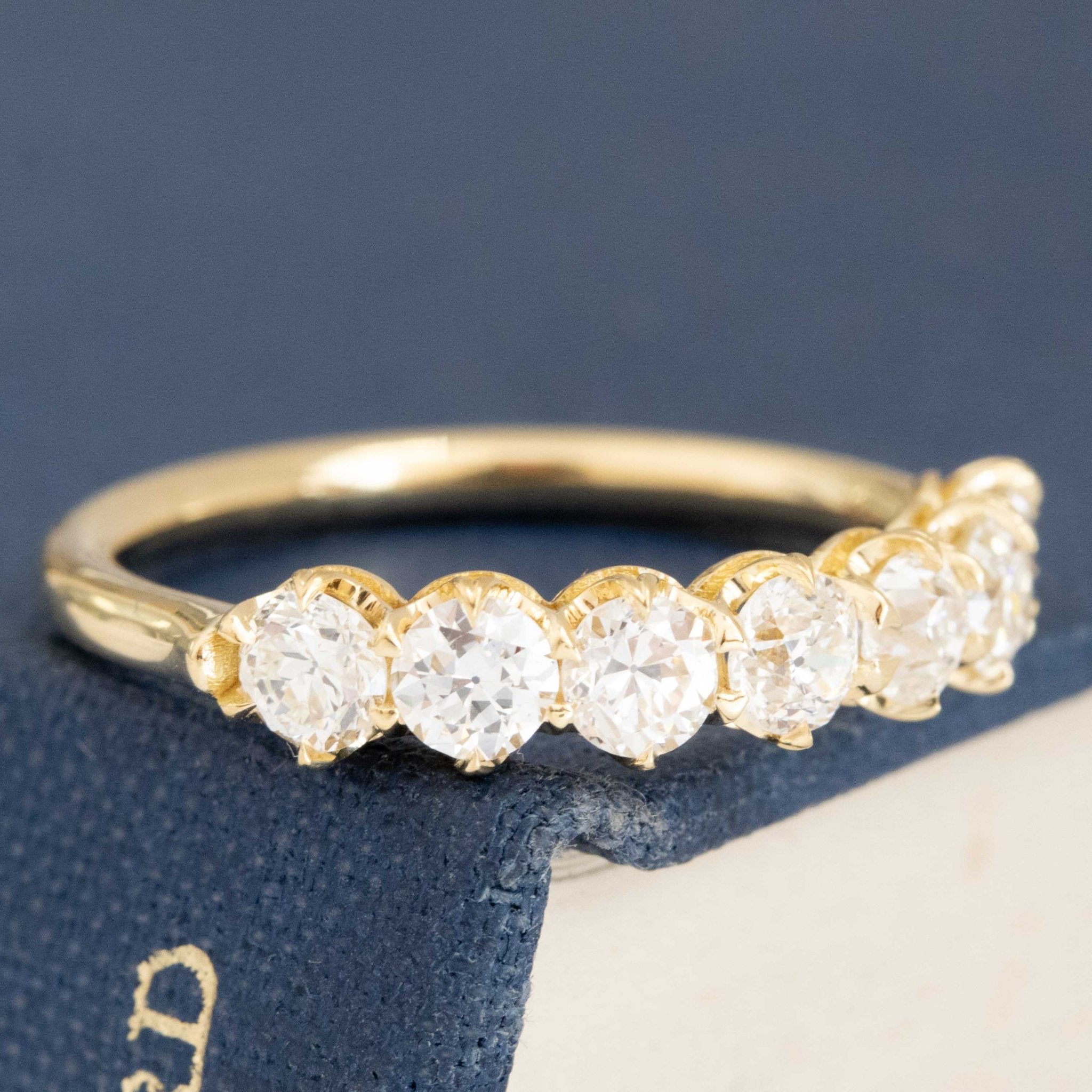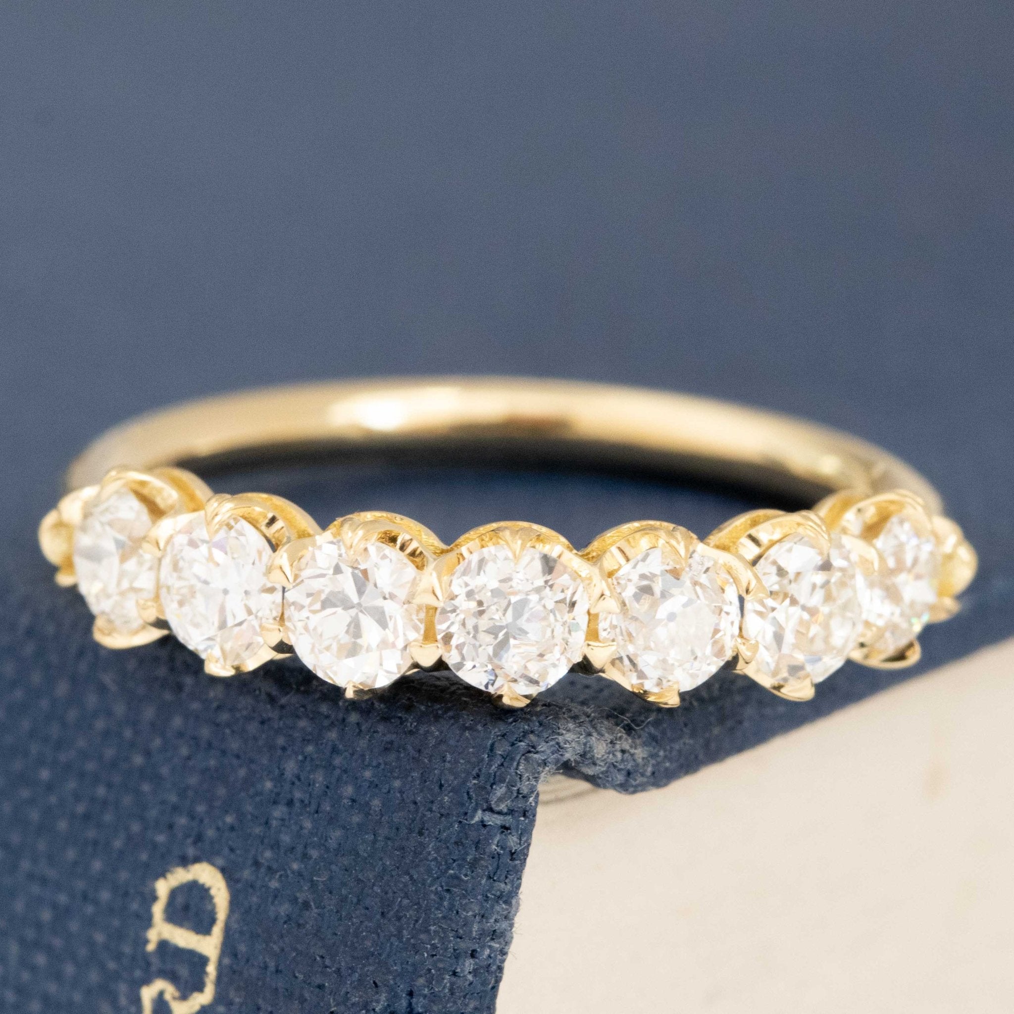 We recently acquired a big parcel of re-purposed (and beautiful!) Old European cut diamonds, and we are beyond thrilled to be making jewels with them! Modeled after antique diamond bands from the Georgian and Victorian eras, this 7-stone band is set with chunky and charming Old Euro cut diamonds in buttery yellow gold. The diamonds are bright, sparkly and just looks so beautiful and elegant on the finger. This particular band is set with diamonds in a smaller scale for a more delicate look that still packs plenty of sparkly punch.