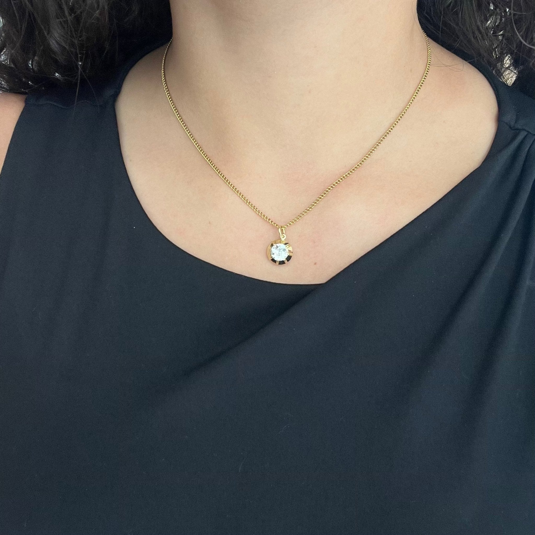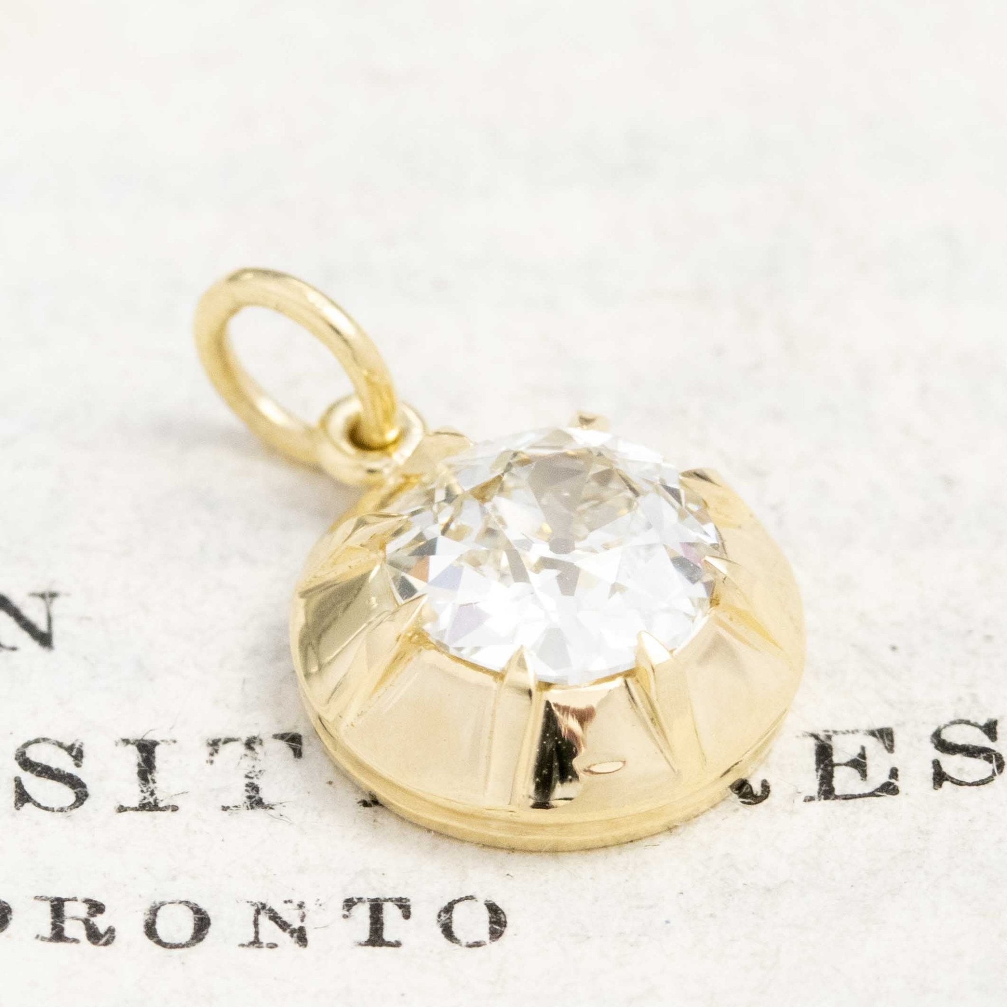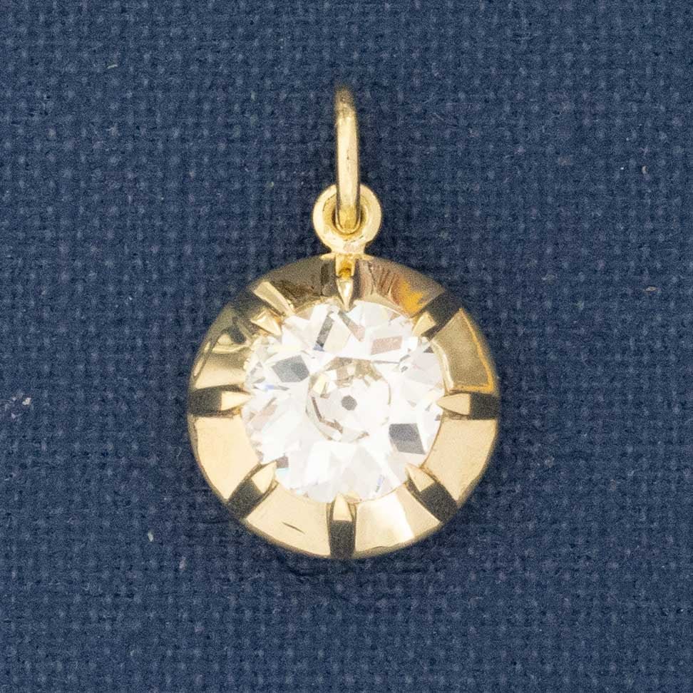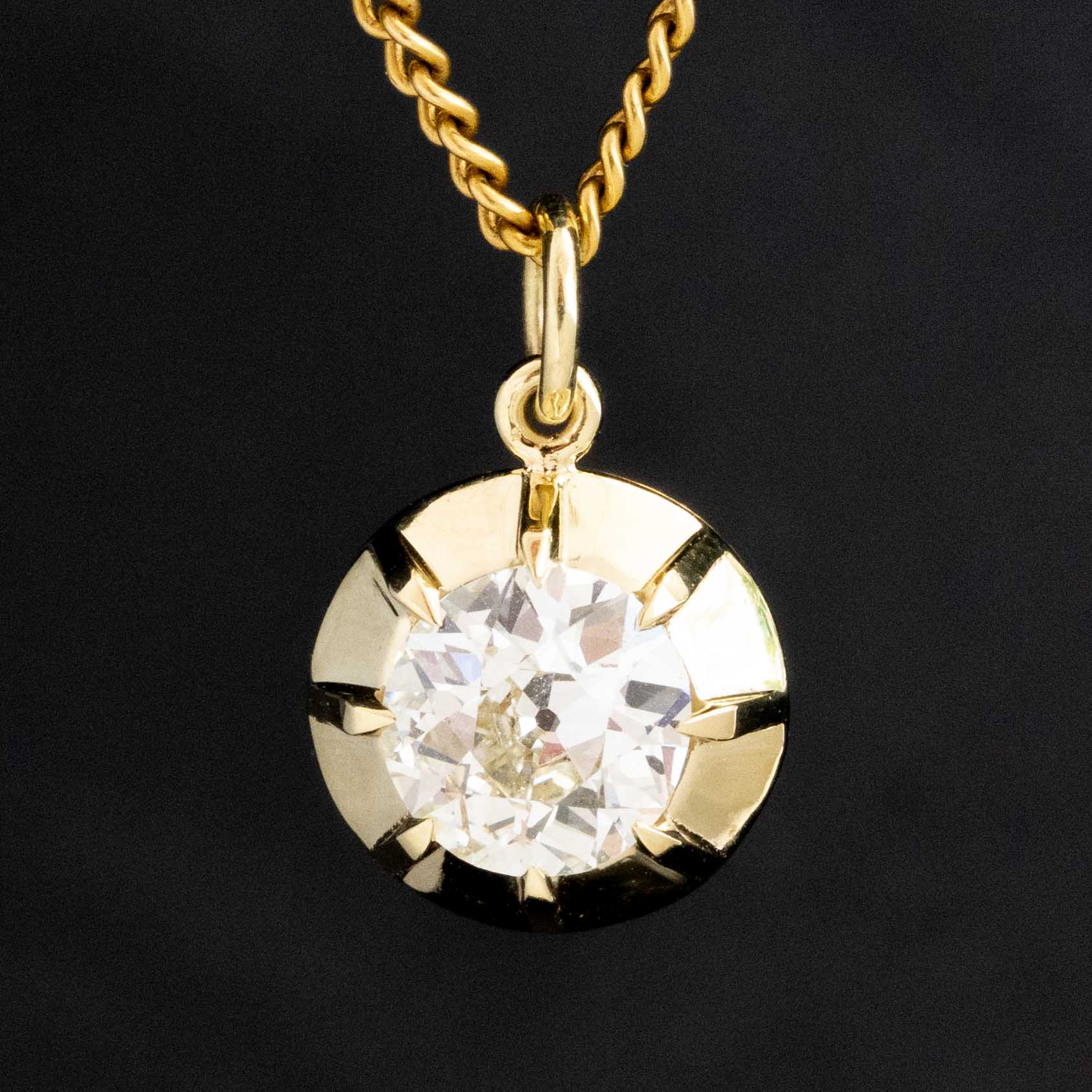 A rather sizable diamond pendant, showcasing a chunky old European cut diamond in a 18kt yellow gold collet setting. Perfect worn solo on a slightly chunkier chain either solo or a part of a stack!
