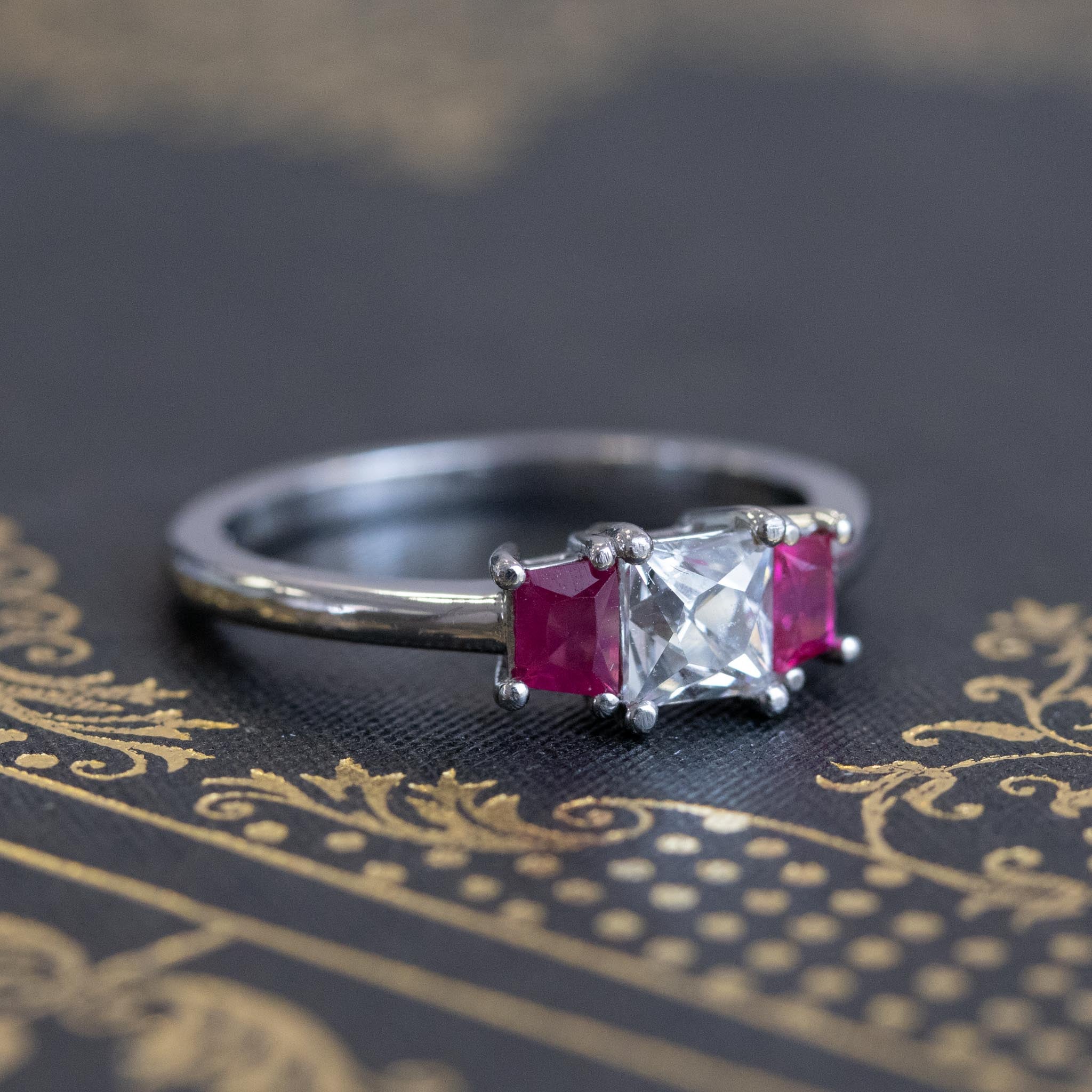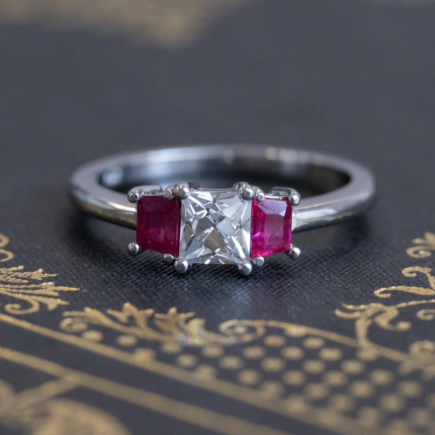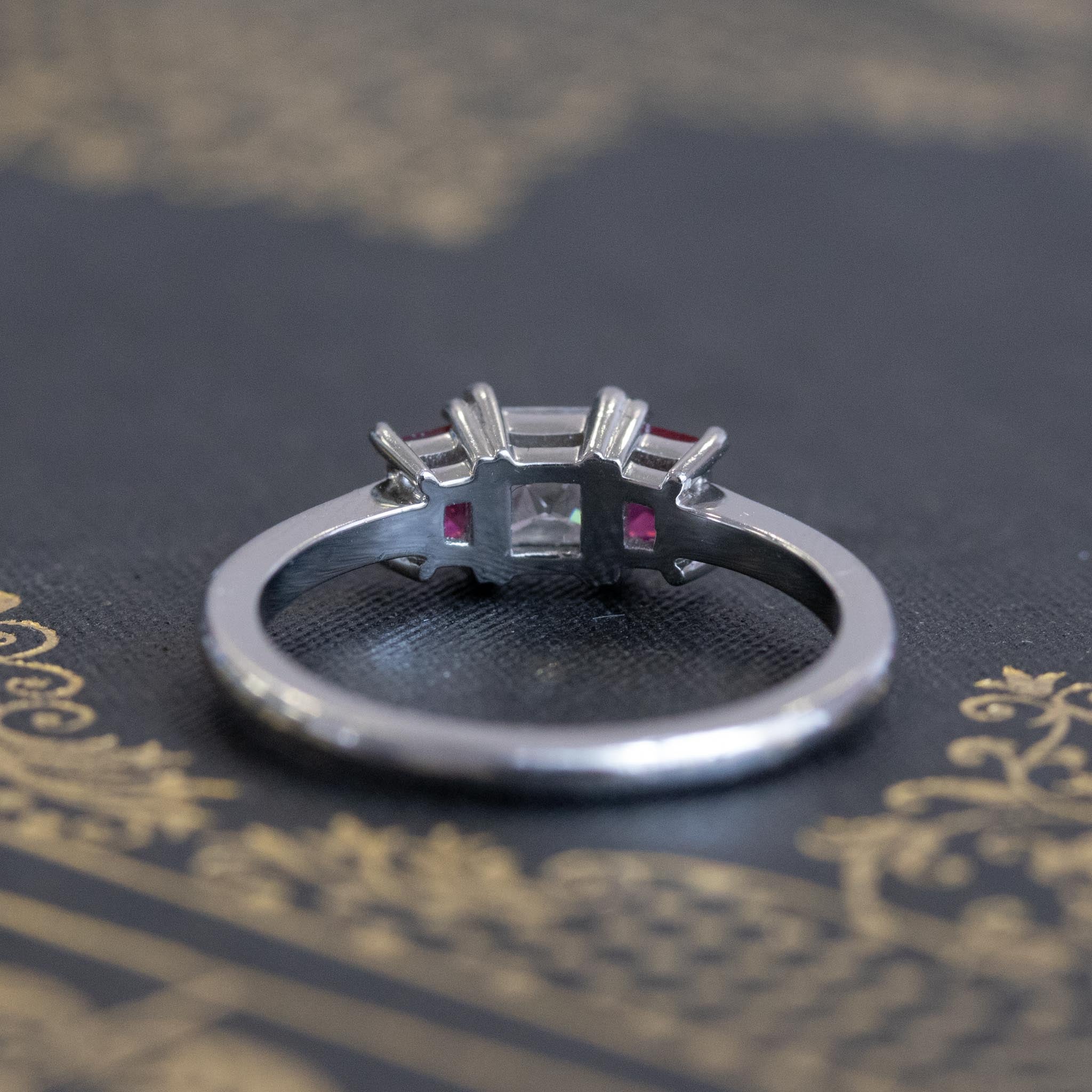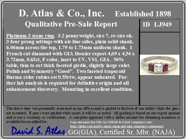 Sleek and simple, yet packed with so much personality! The icy-white central French cut diamond is set off perfectly by a pair or custom cut trapezoid Burma rubies. On the finger, the ring is low set and is just elegance personified. The French cut diamond is a great size, and certainly not easy to find in this size range.