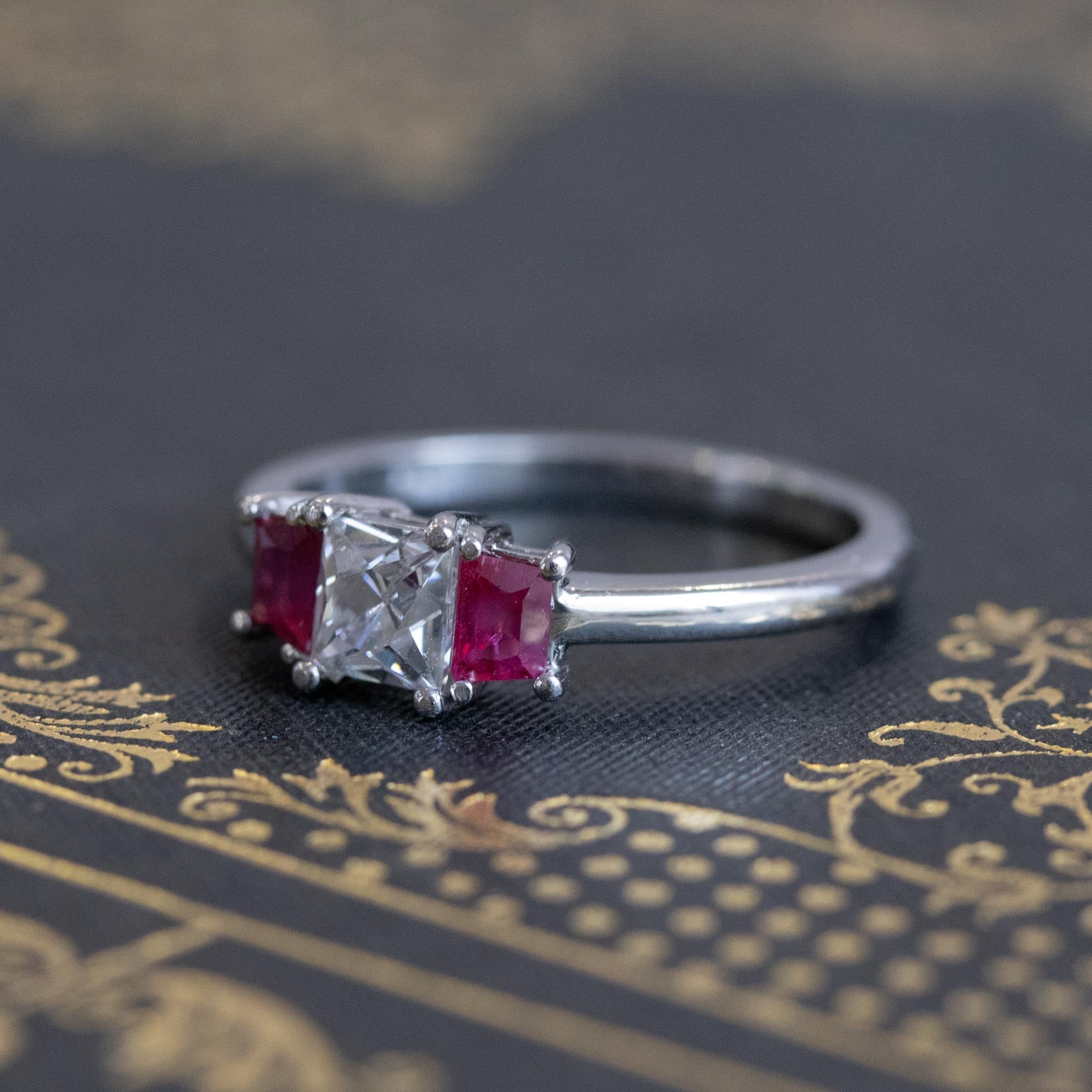 1.18ctw French Cut Diamond and Burmese Ruby Trilogy Ring, GIA F VS1