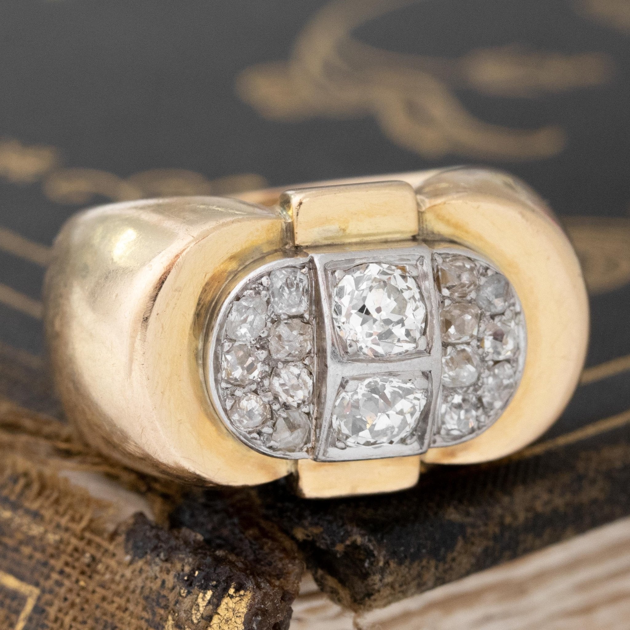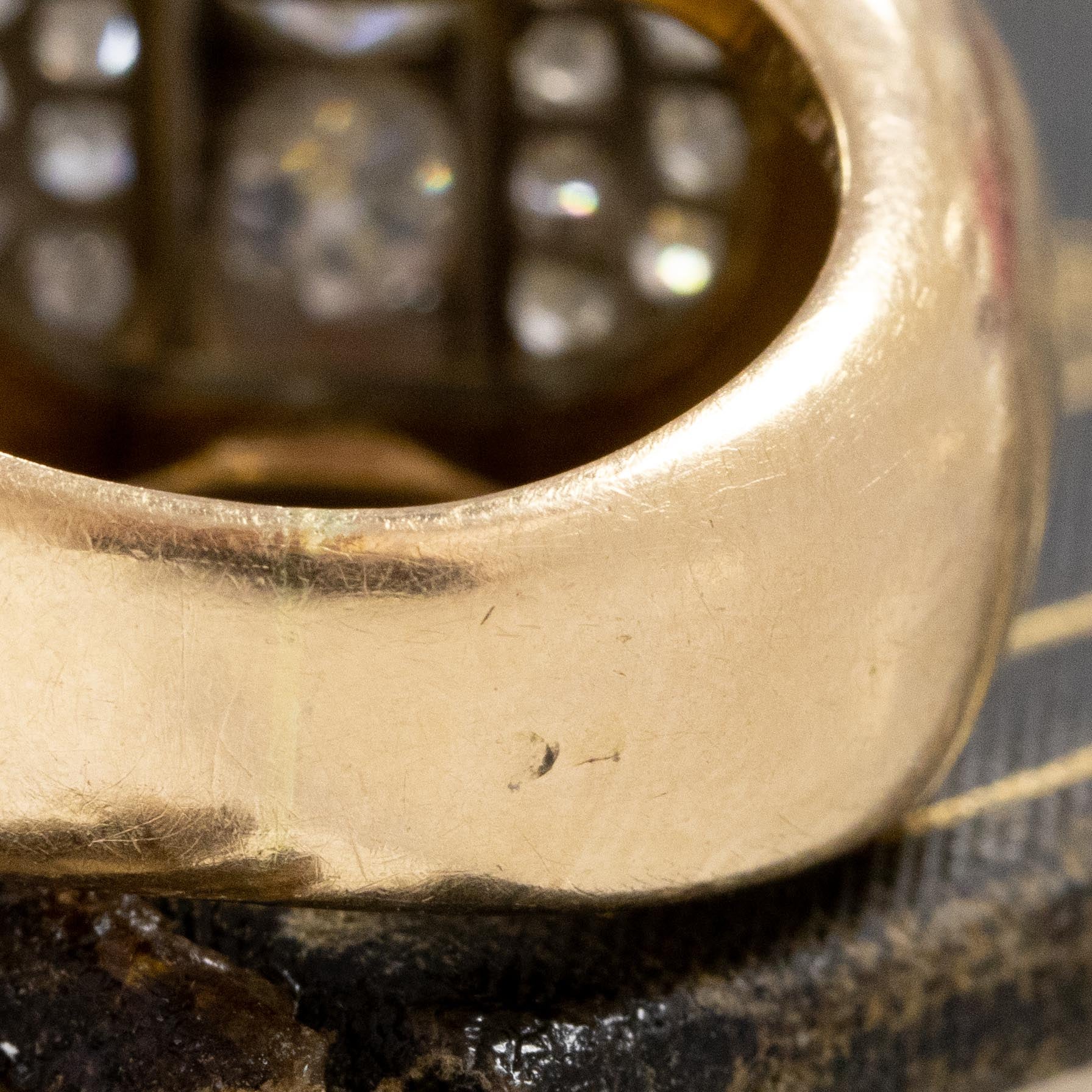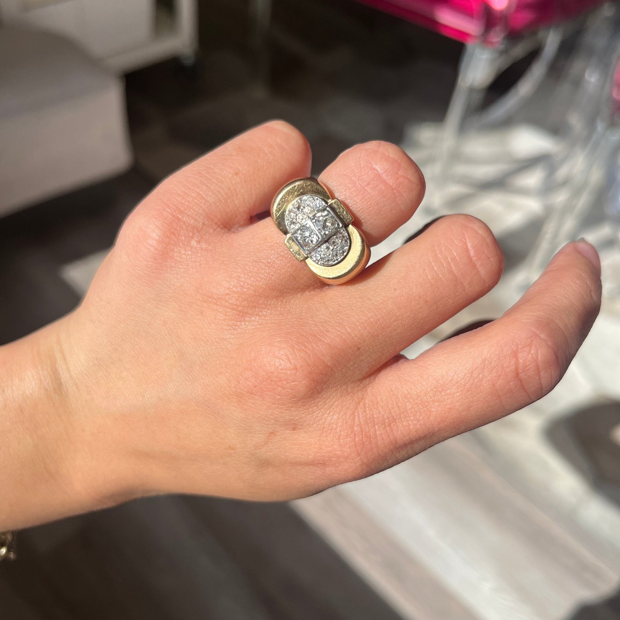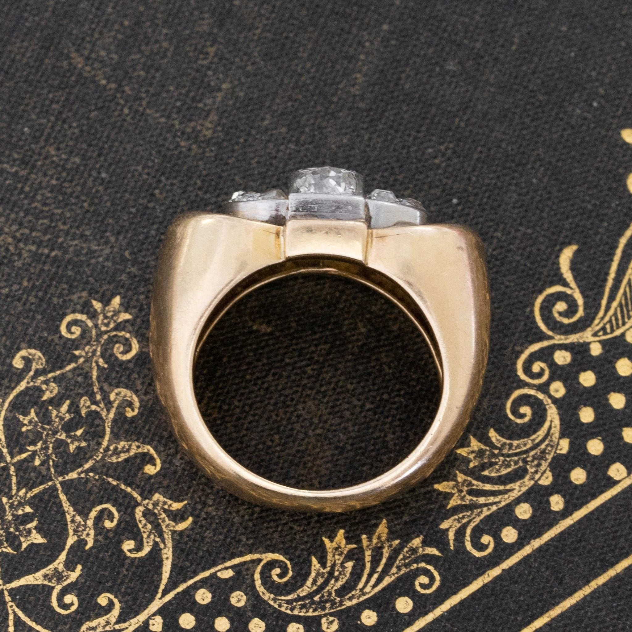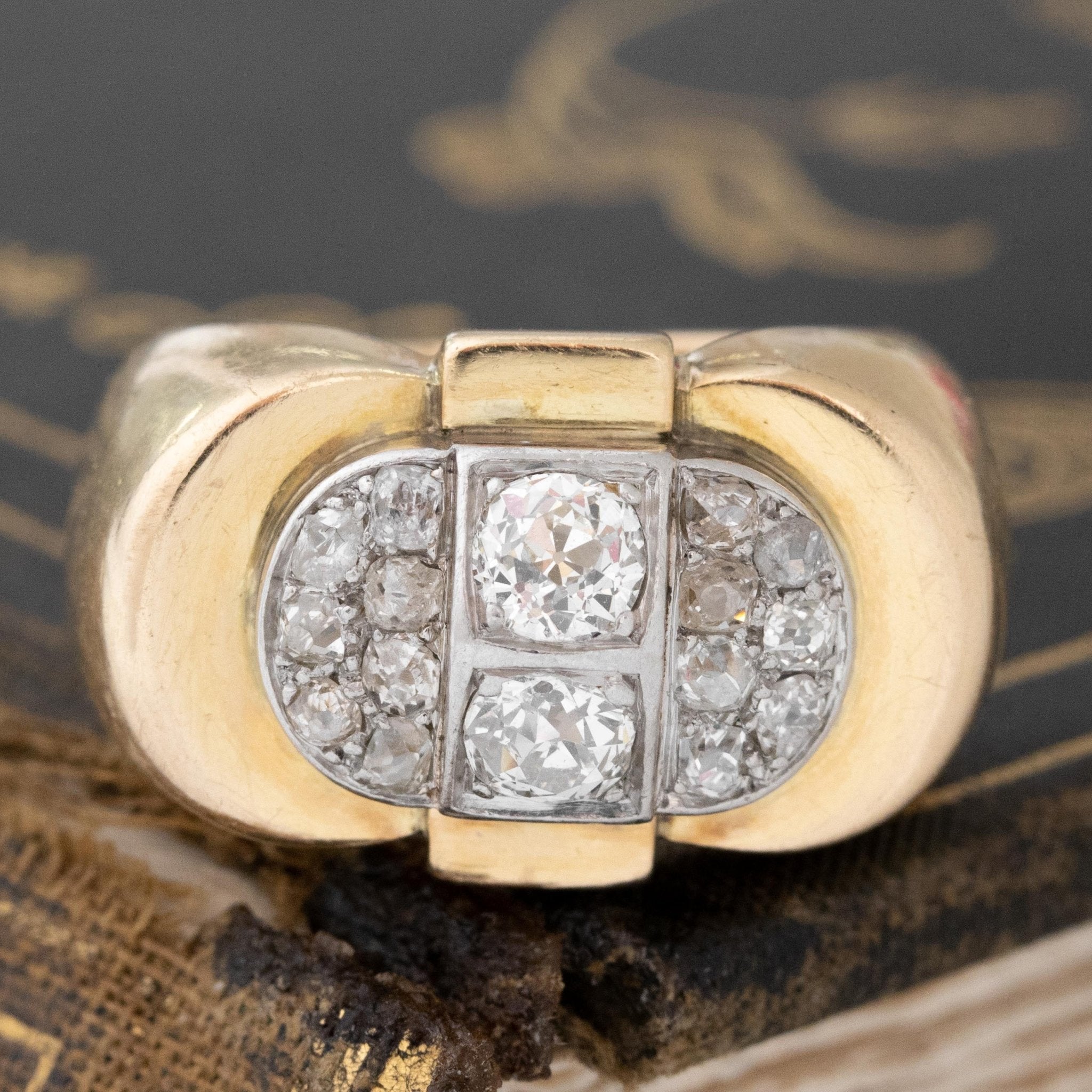 An antique tank ring so bold and elegant, it can only be French in origin! Two stunning old mine cuts sit front and center with clusters on the shoulders - that bold, swoopy gold border ties things together just beautifully.