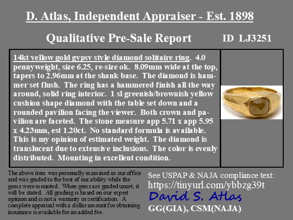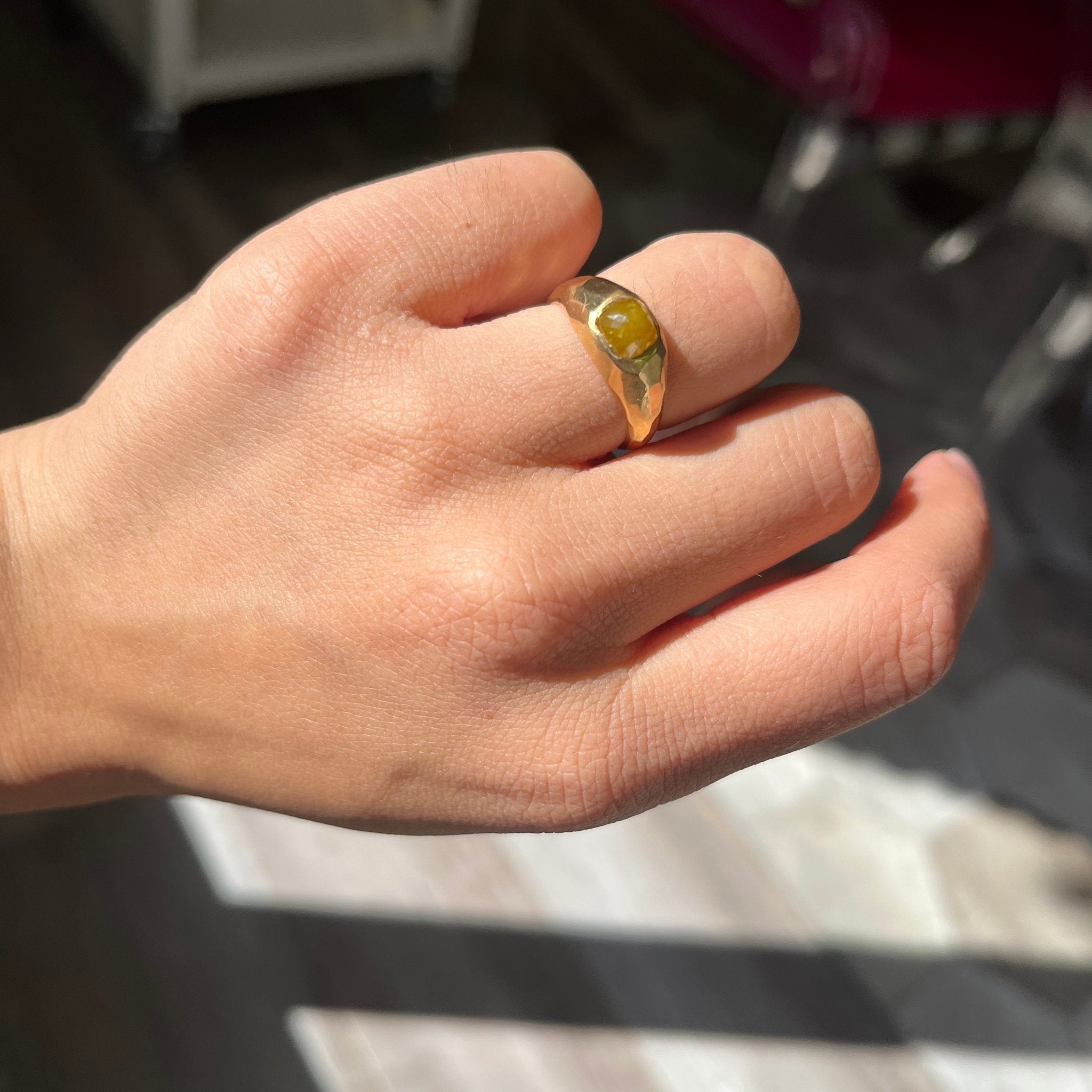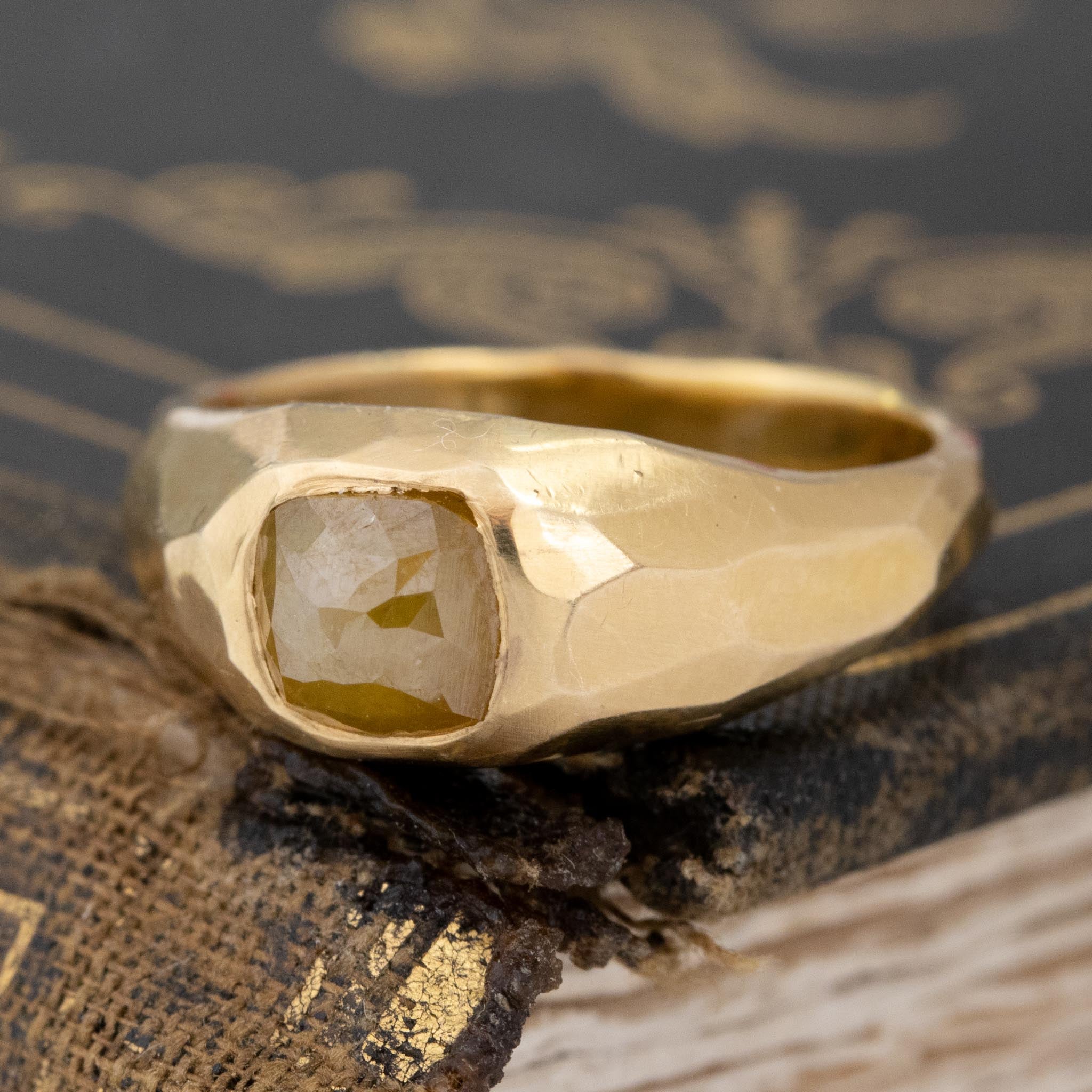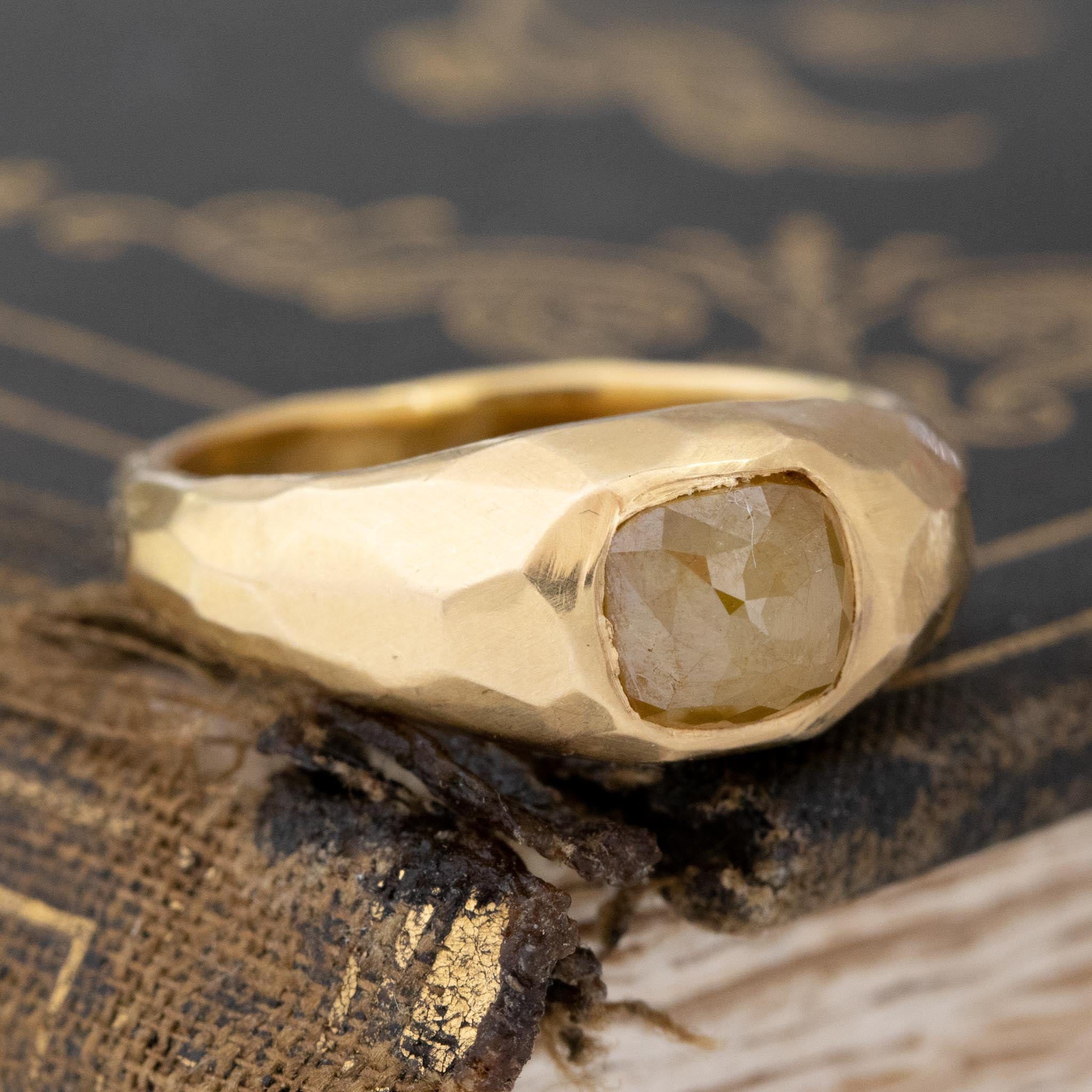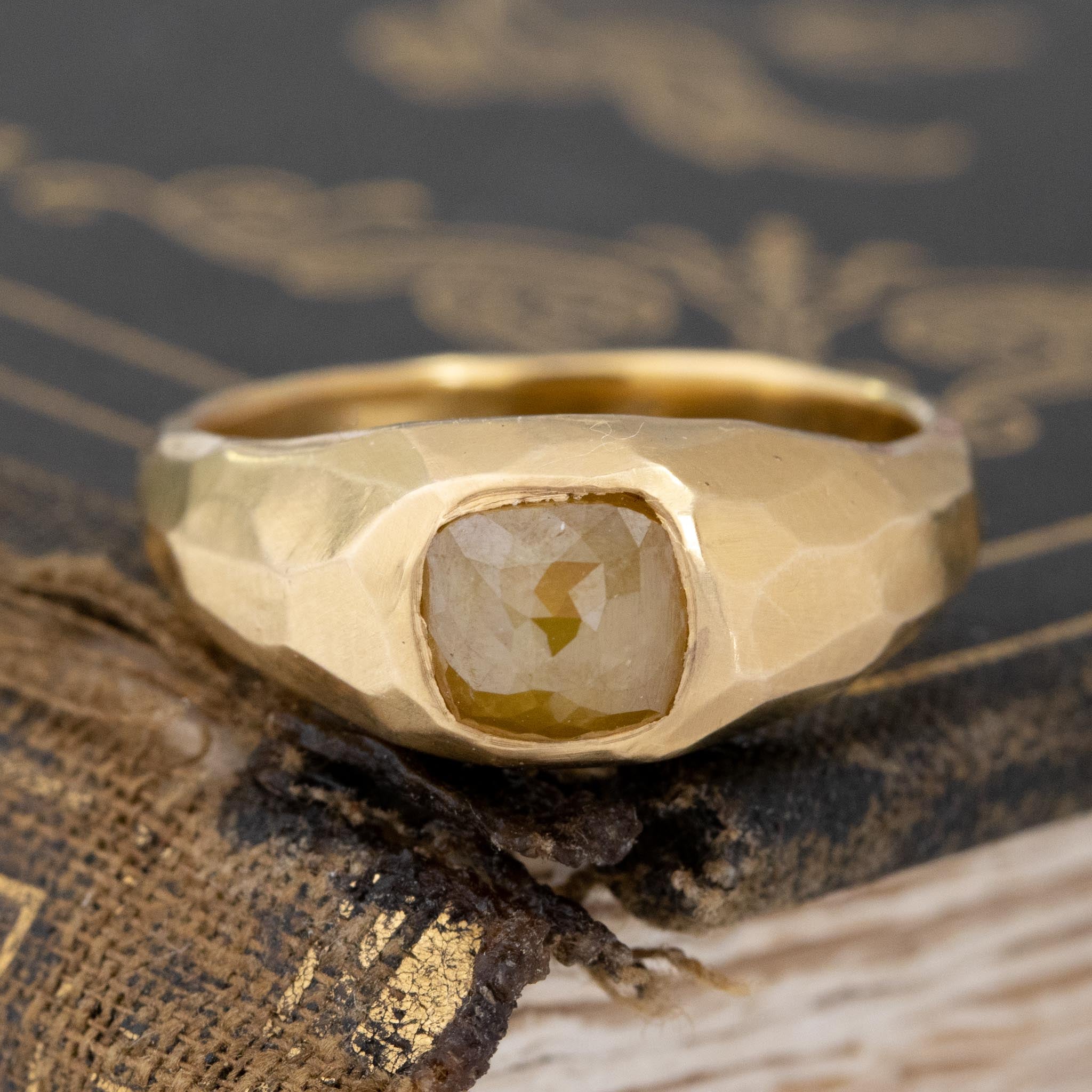 One of the most unique rings we have in our collection! A charming rustic rose cut diamond with the prettiest amber/peachy diamond is set in high karat gold, with a rustic, almost artisanal vibe to it. Beautiful and super flattering on the finger too, with a really lovely heft to it. What a unique engagement ring it would make!