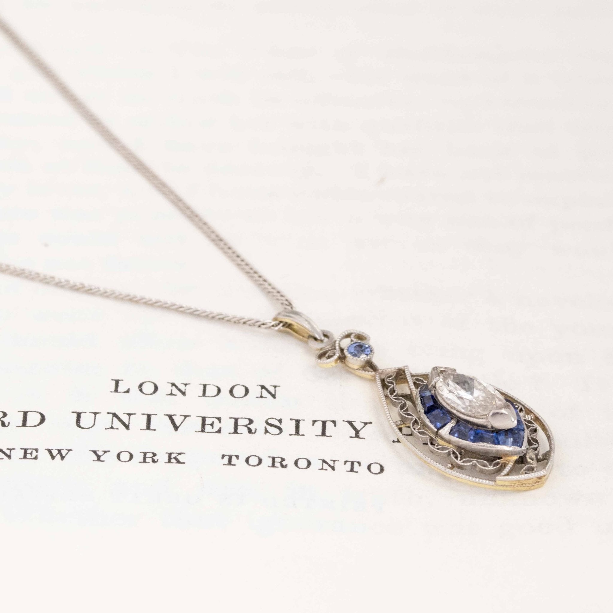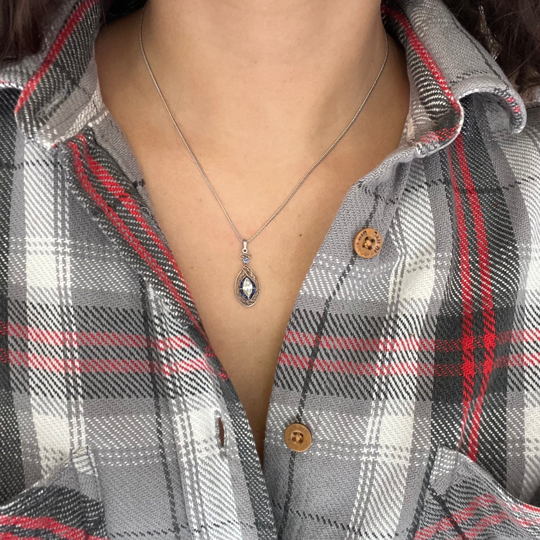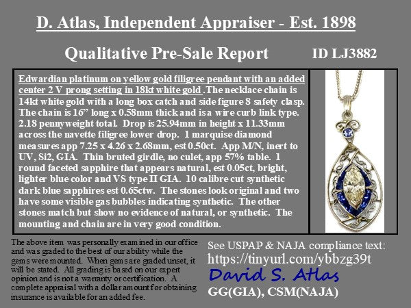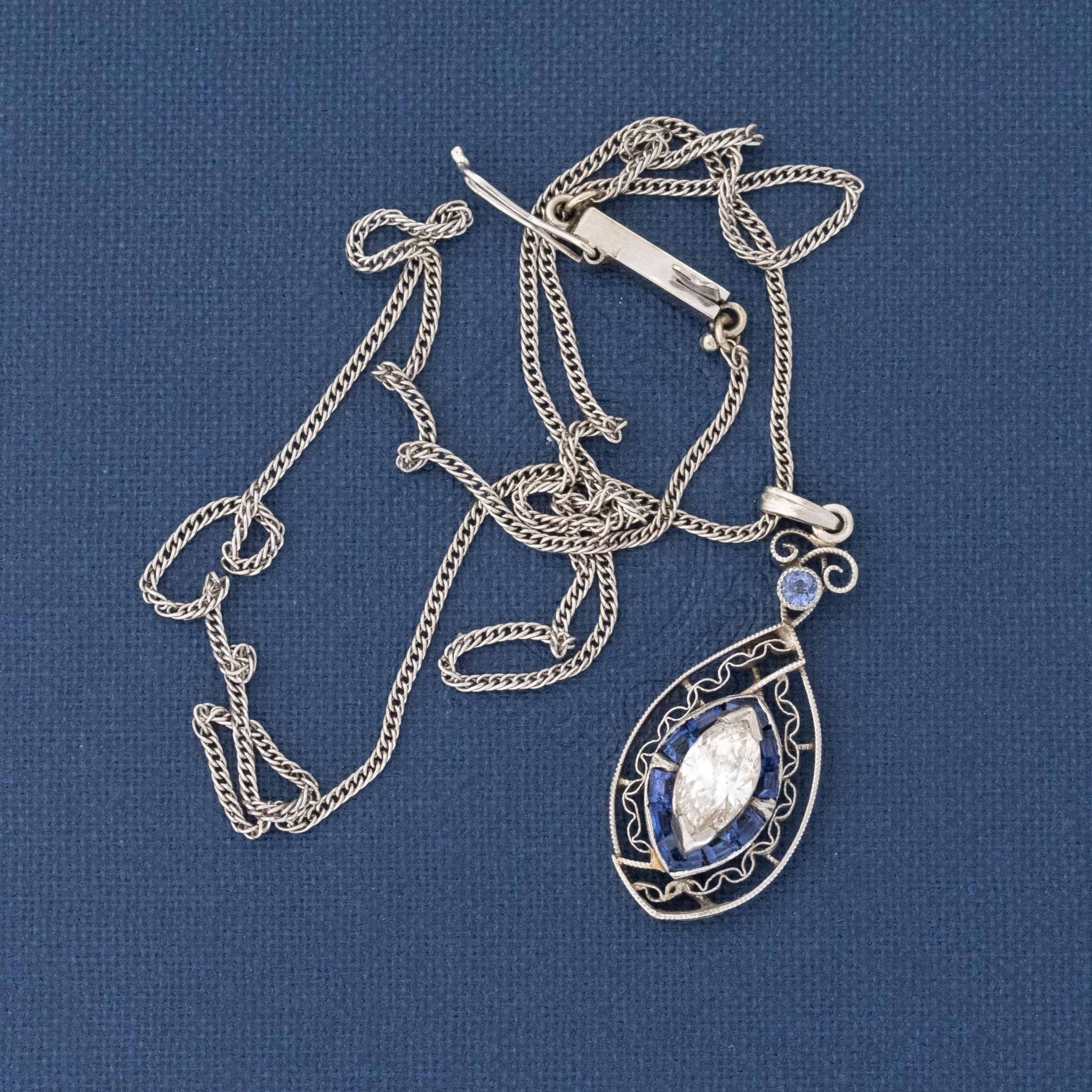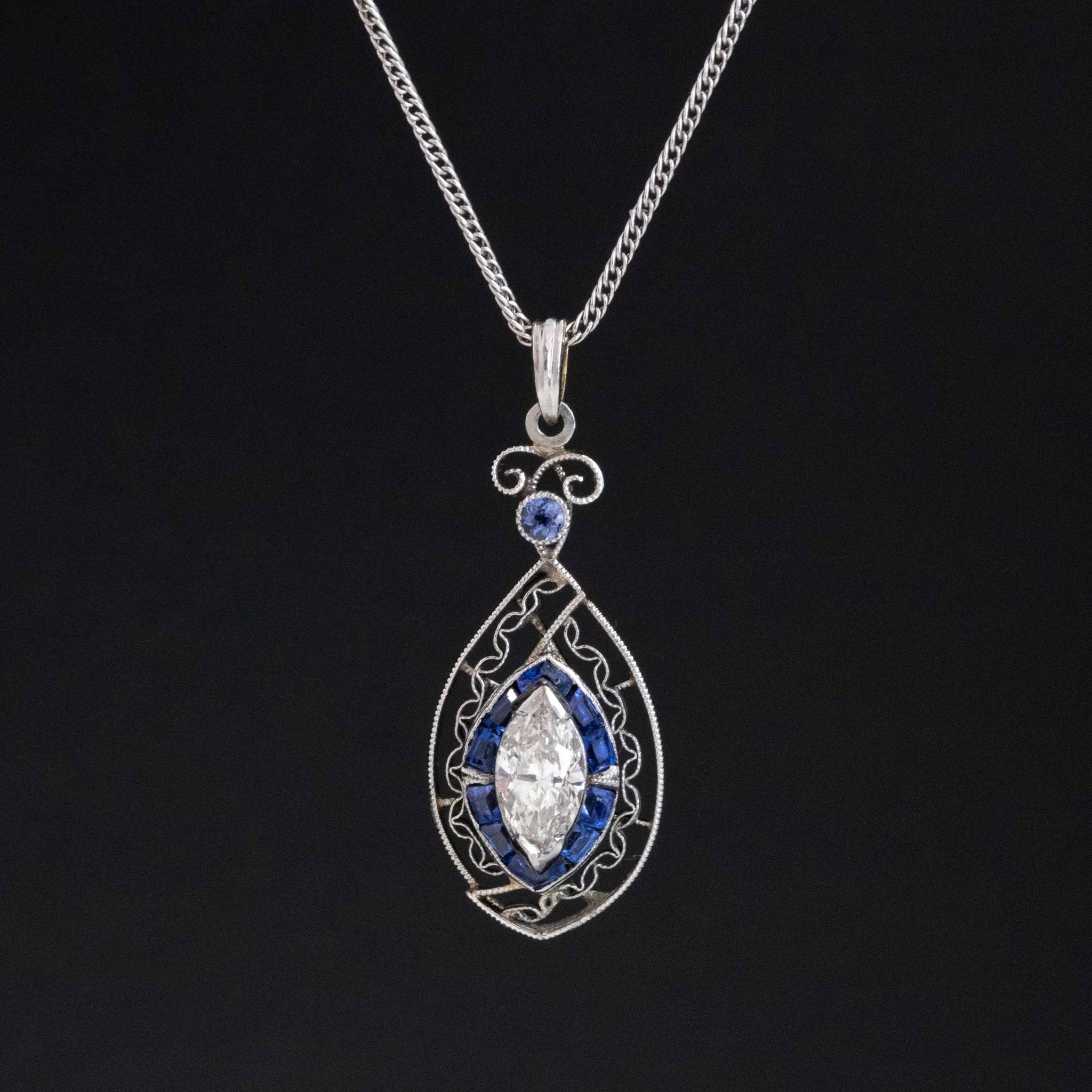 A darling Edwardian era pendant with so much detail and intricate metalwork - we find her to be the sweetest thing. That marquise in the center is long and leggy, and all the swirly platinum work adds a beautiful touch of detail.