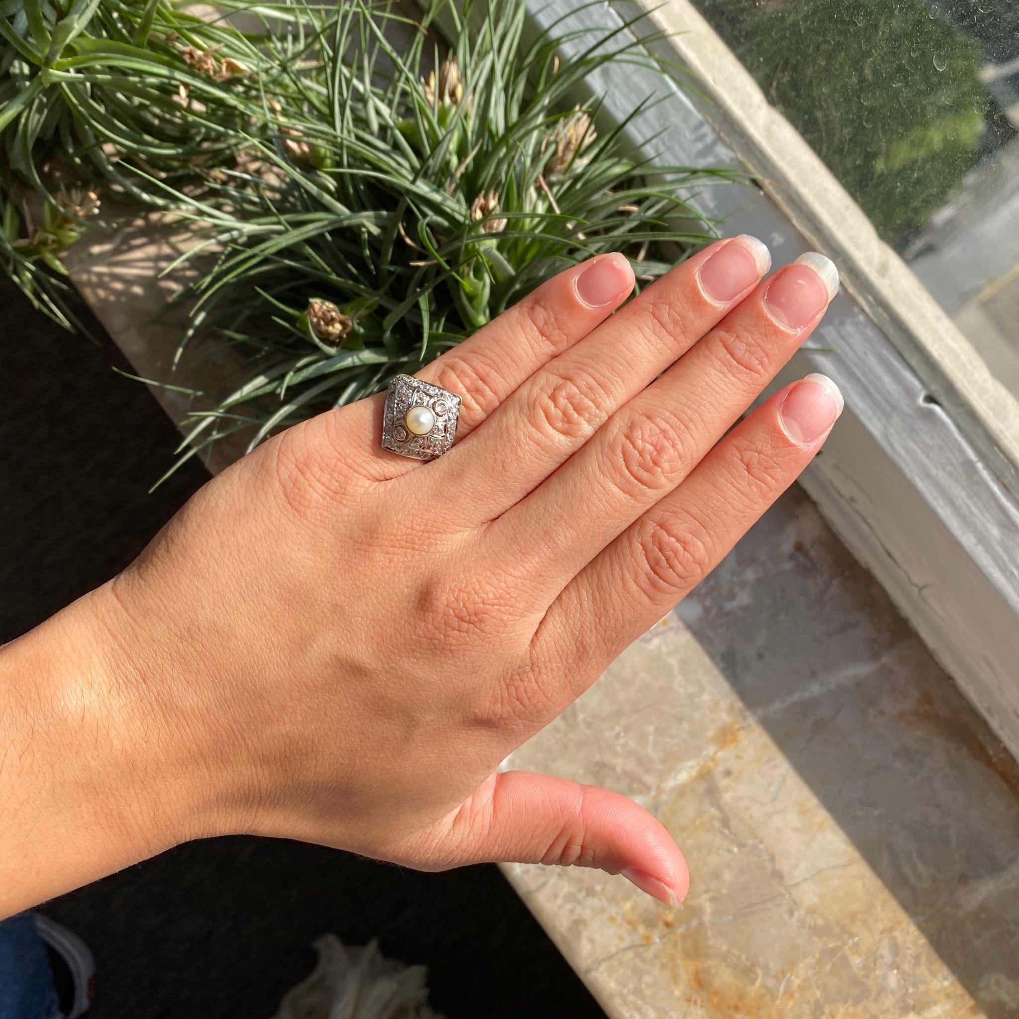 Such a classic ring from the period, set with a central pearl (also, did you know that pearls are making a healthy come back?). This would make for a beautiful dinner or right hand ring, with its beautiful lines. The diamonds just sparkle like mad on the finger! I think she would make for a unique engagement ring as well!