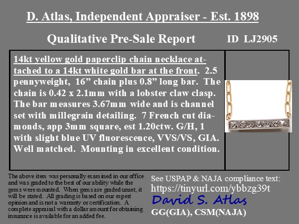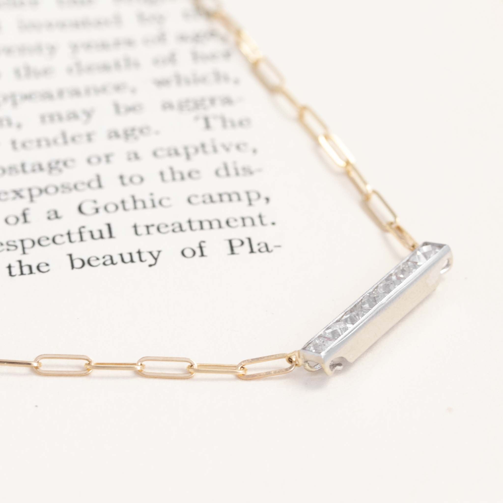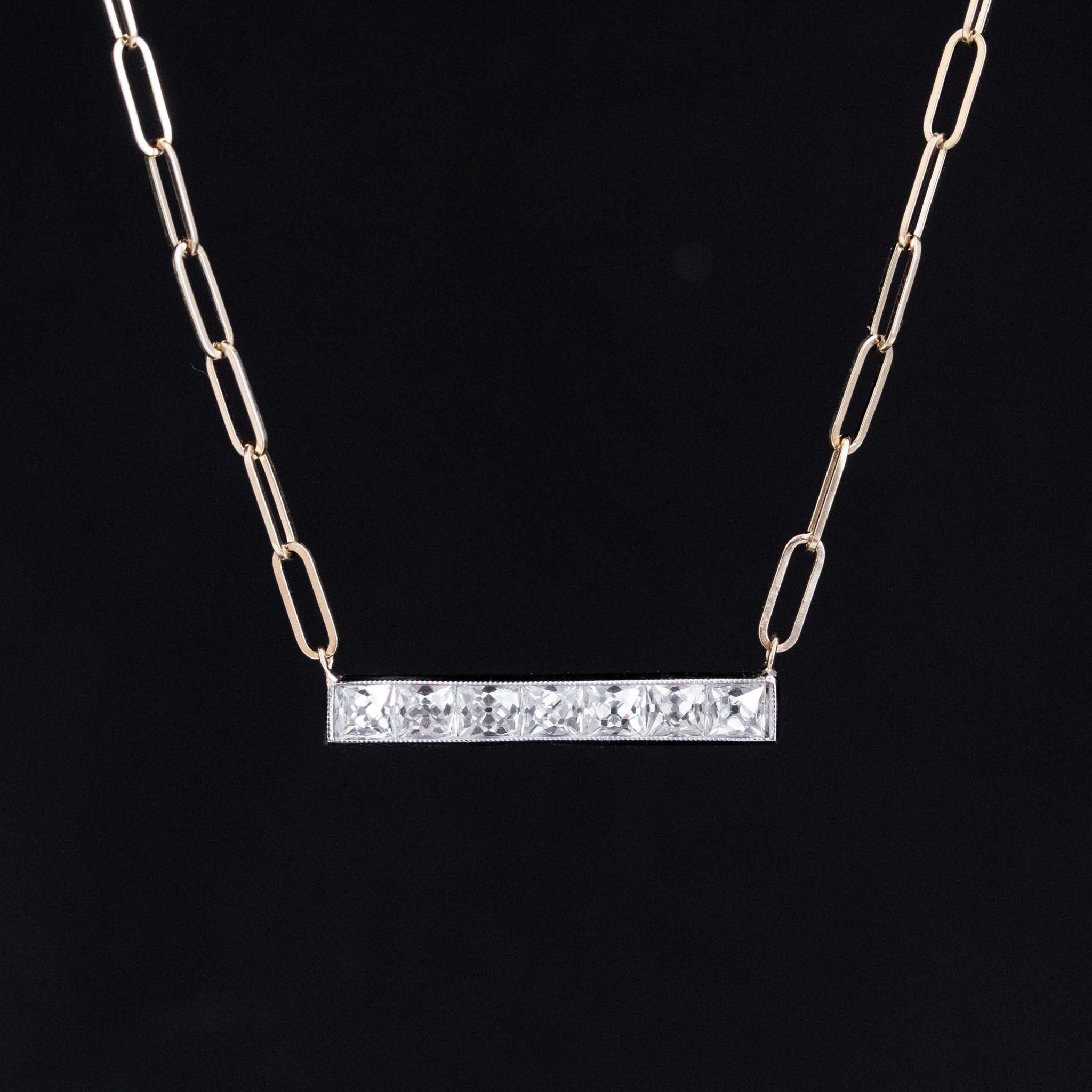 When all one wants is a sliver of sparkle on decolletage! Shimmering French cut diamonds, channel set in a white gold bar, and strung in a paperclip chain. The effect is one of easy, casual elegance.