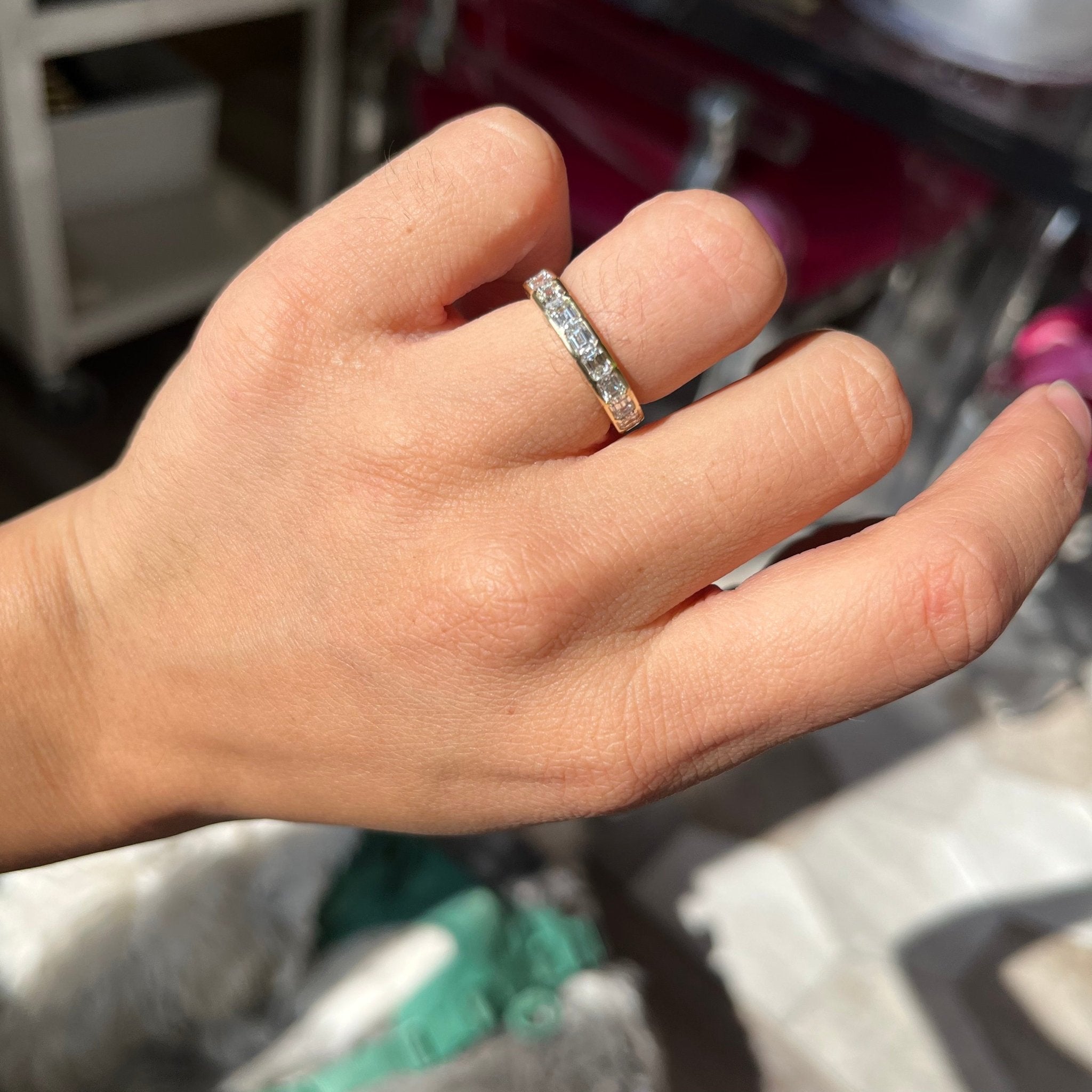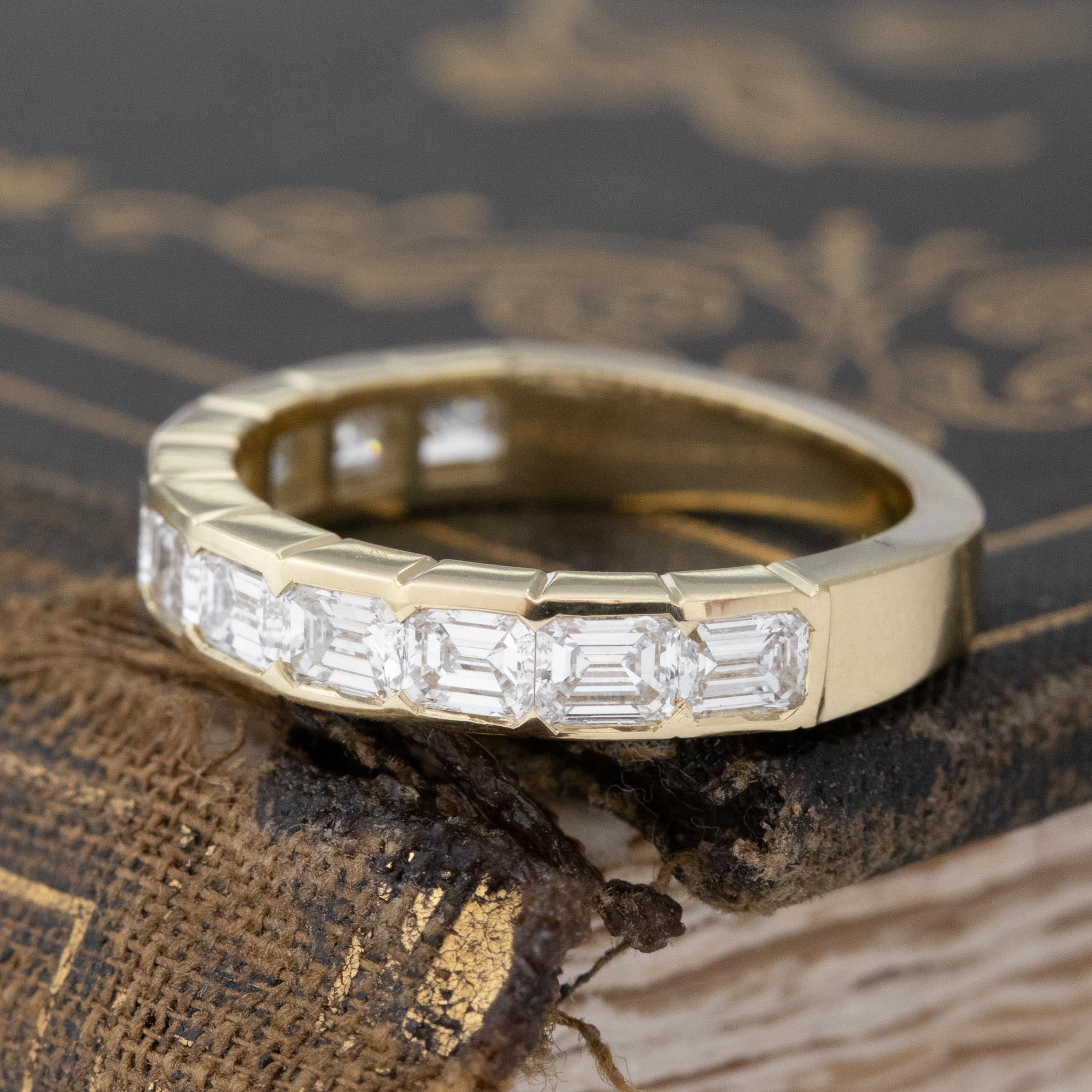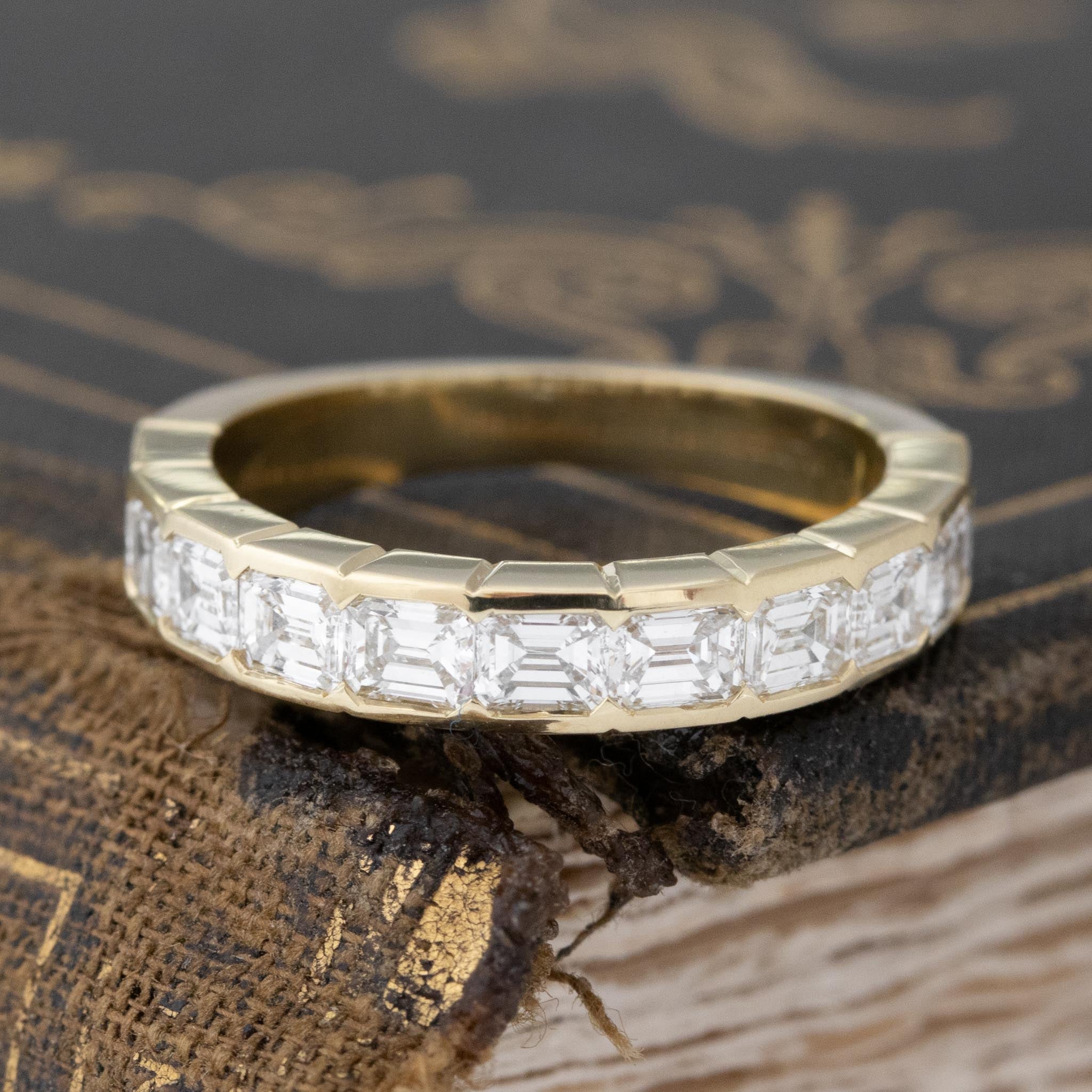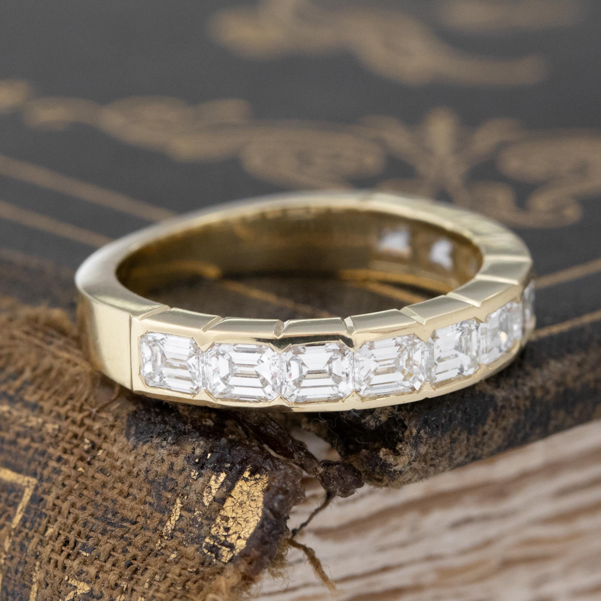 Emerald cut diamond eternity bands are sleek, sexy, and an ever-classic option in your jewelry suite! And in yellow gold? We’re sold.