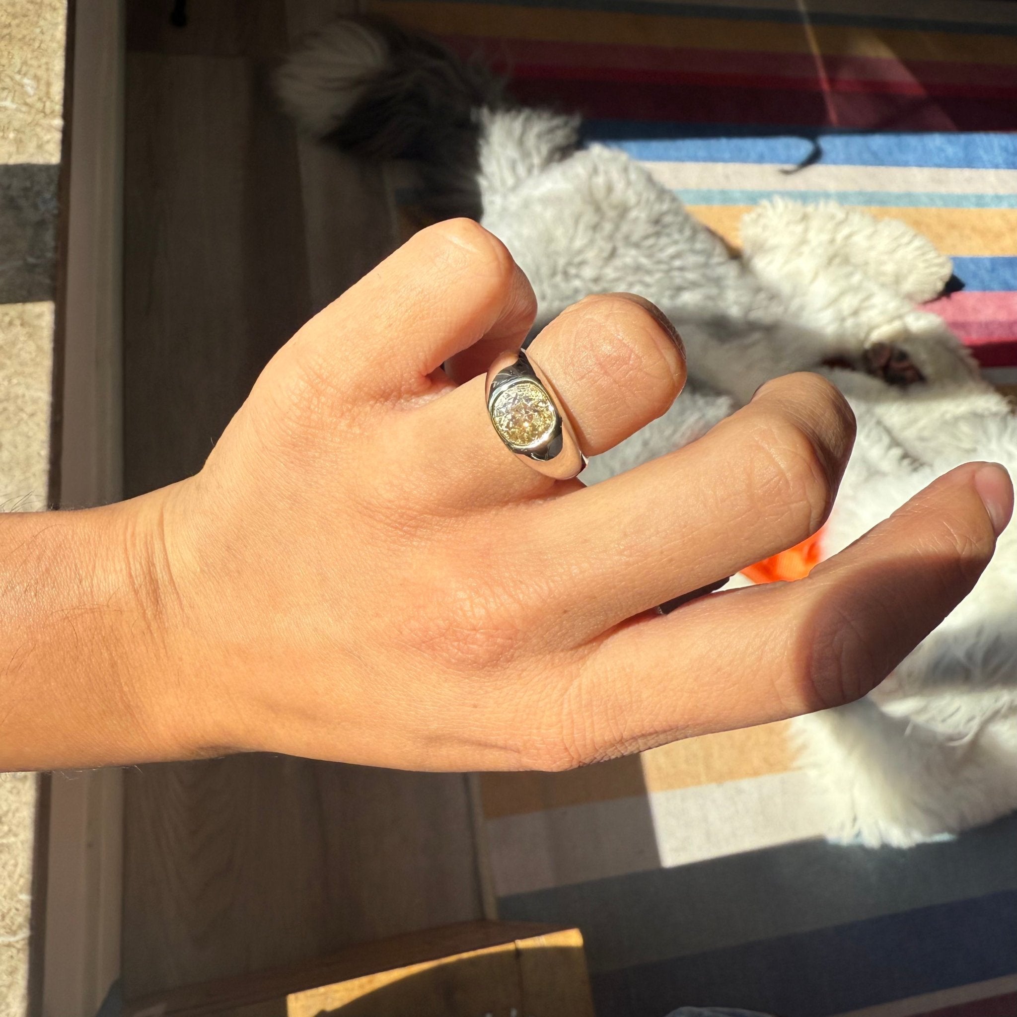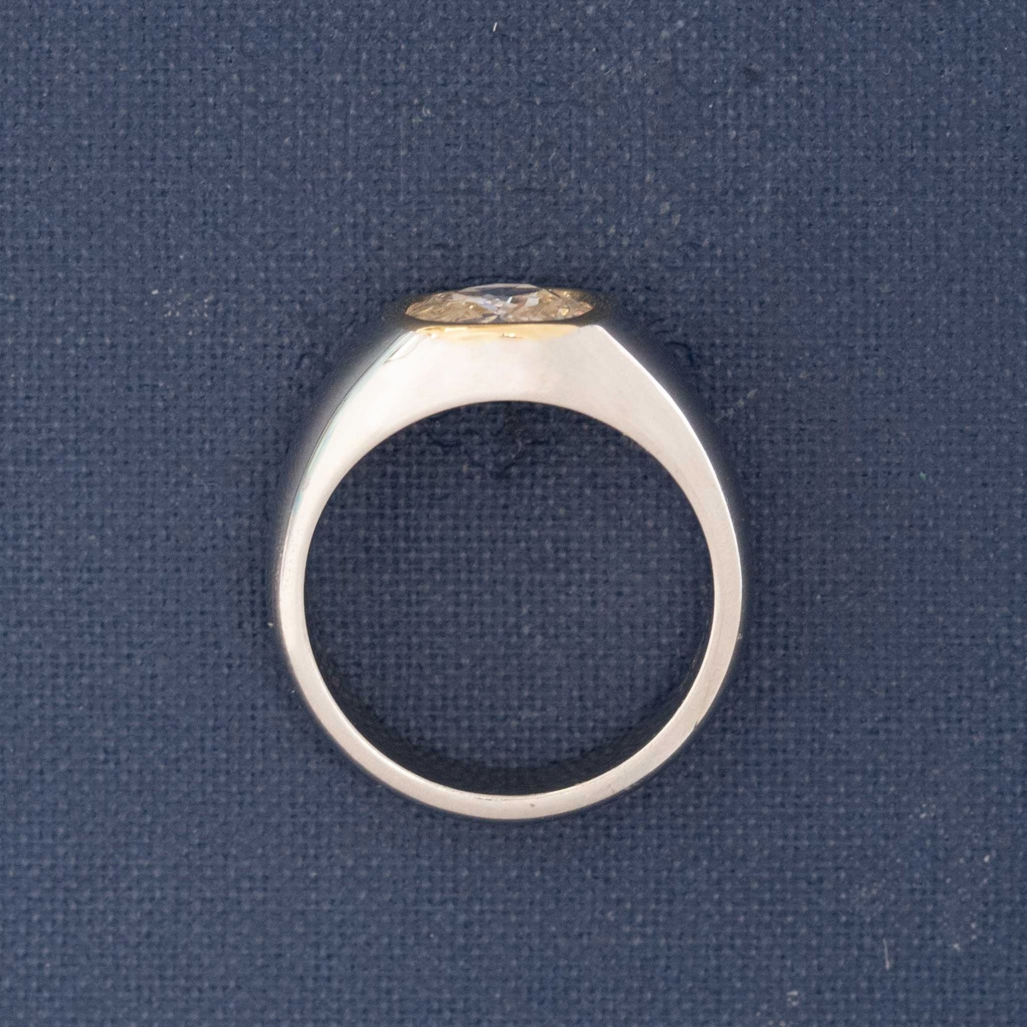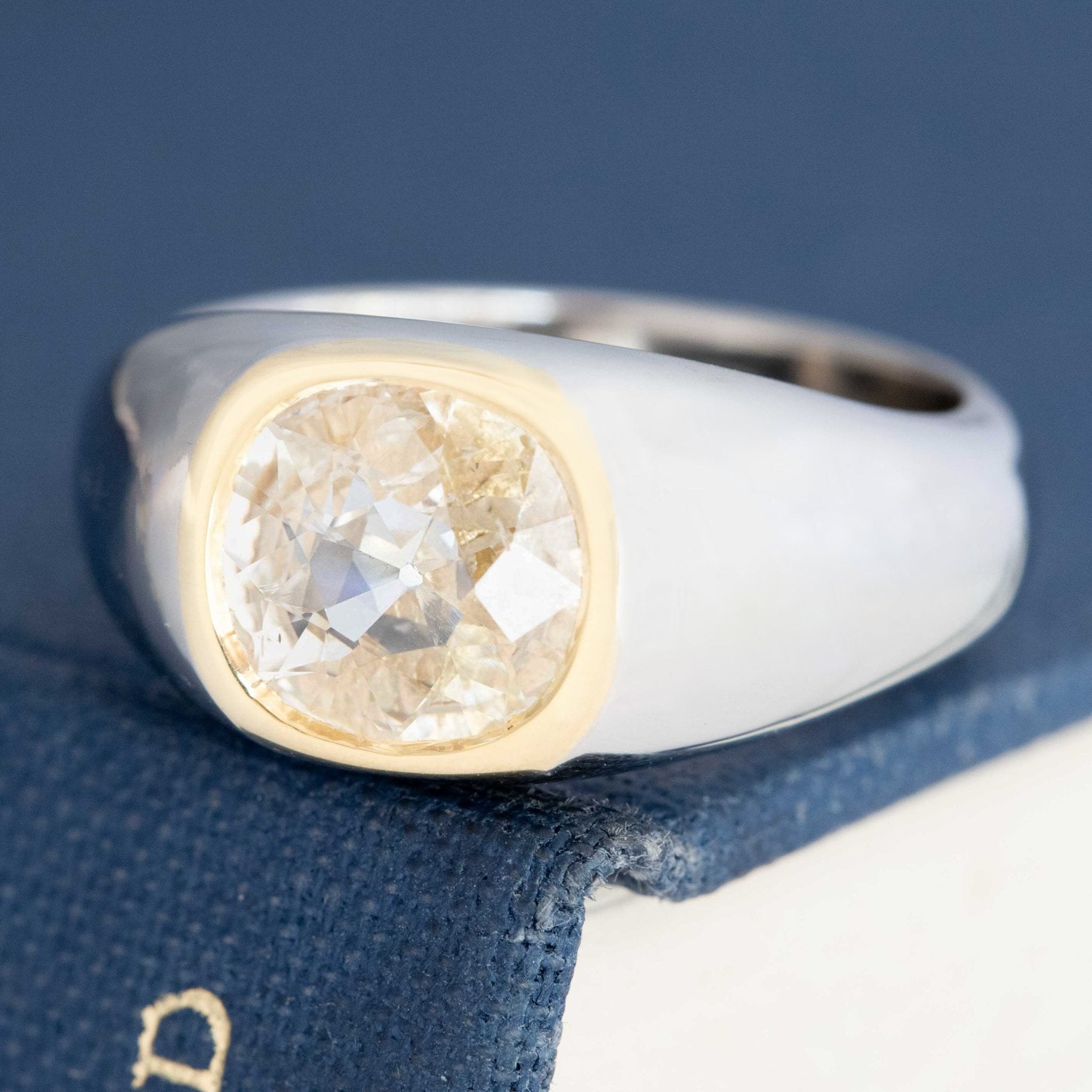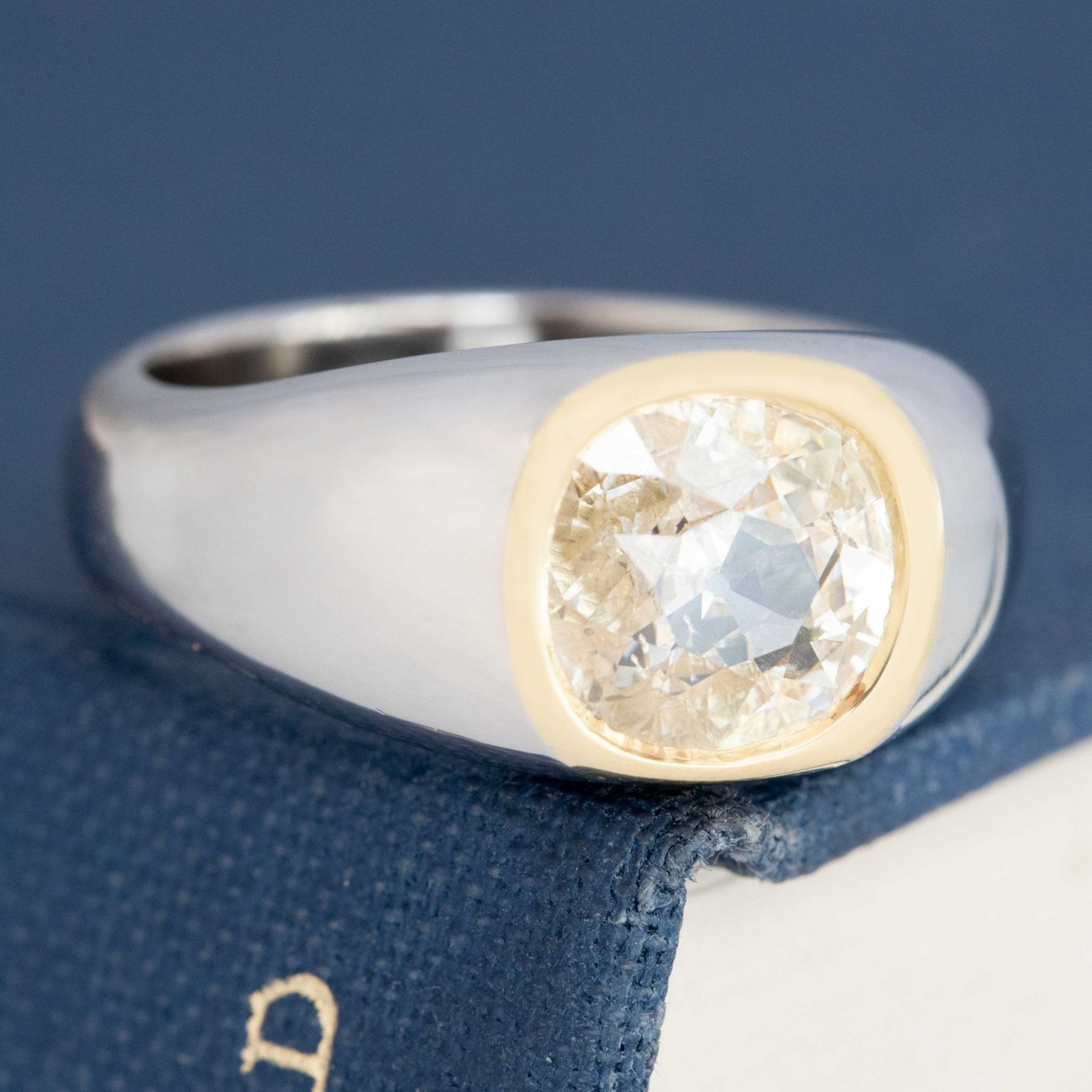 Inspired by an old antique flush-set ring we once had in our inventory, we took this 1.22ct old mine cut and wrapped her in a yellow gold bezel then set flush in chunky platinum! The stone itself has a much lower depth percentage than the average old mine cut, so it gives you a greater spread - essentially 2ct measurements at a 1.22ct price tag. The stone itself is bright and sparkly, with a warm glow that really sings in that gold bezel.