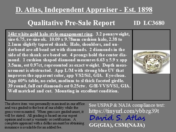 - Surrounding diamond is estimated to be G/H colors & VVS/VS1 clarities. GIA Standards