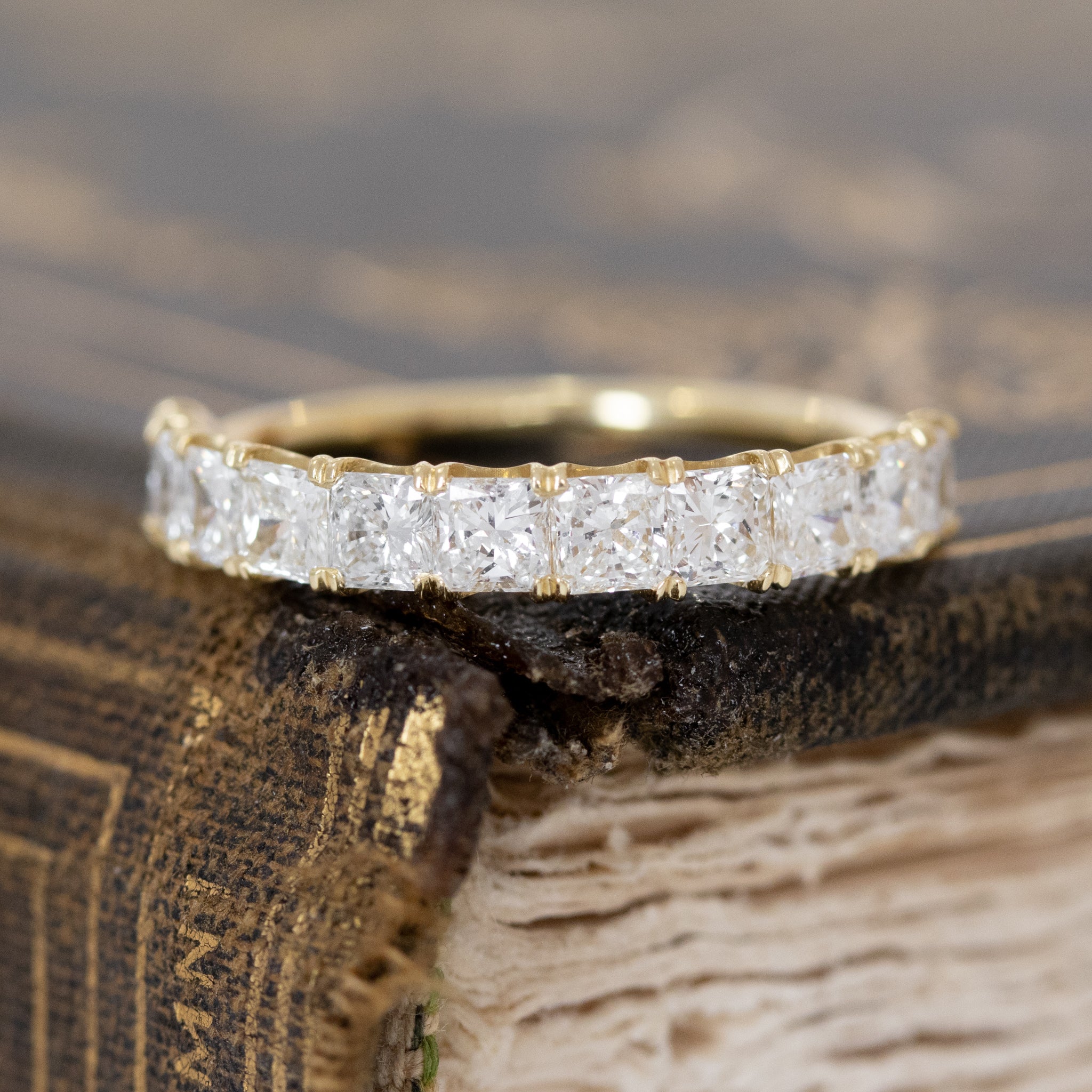 We came across this parcel of radiant cut diamonds and couldn’t help but make a band with them! We love the shape, brightness, and sparkle of this half-hoop band, which sits low on the finger. Bold enough to be worn on its own, but will stack beautifully with other bands as well! Beautiful swoopy details on the setting.
