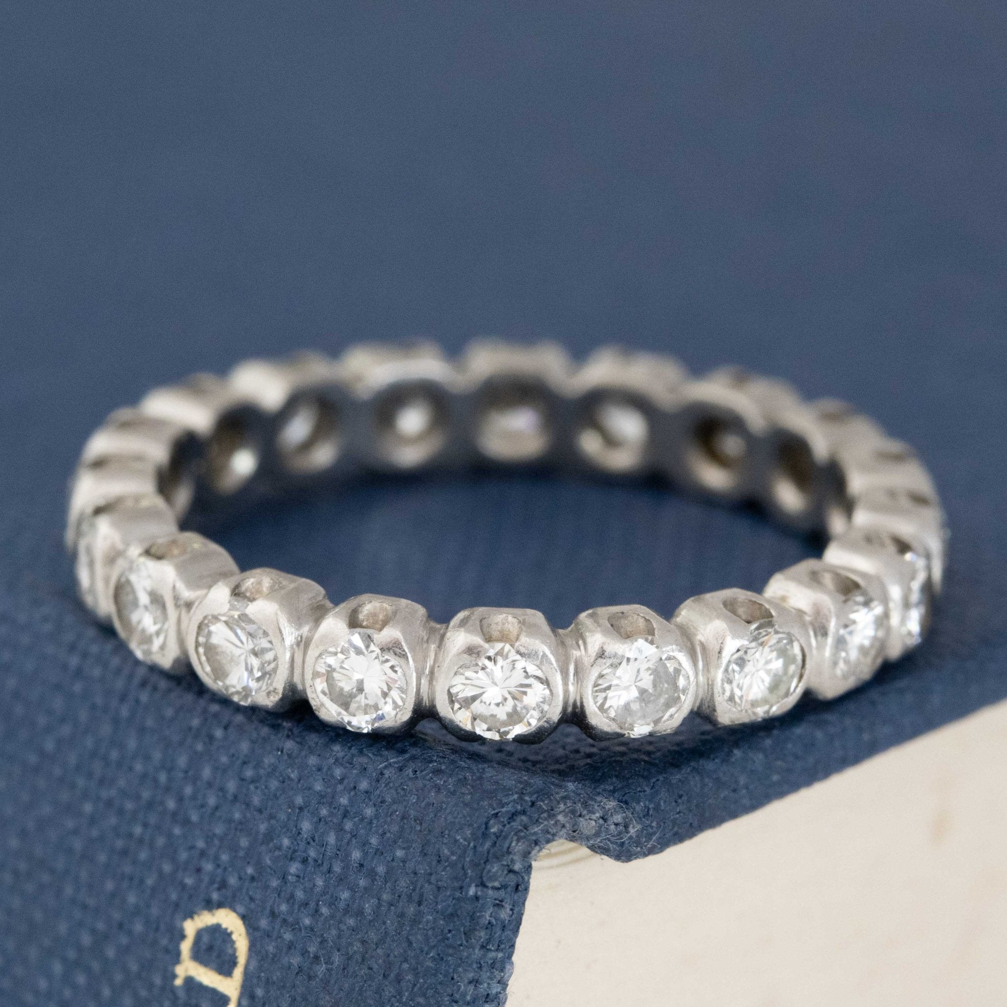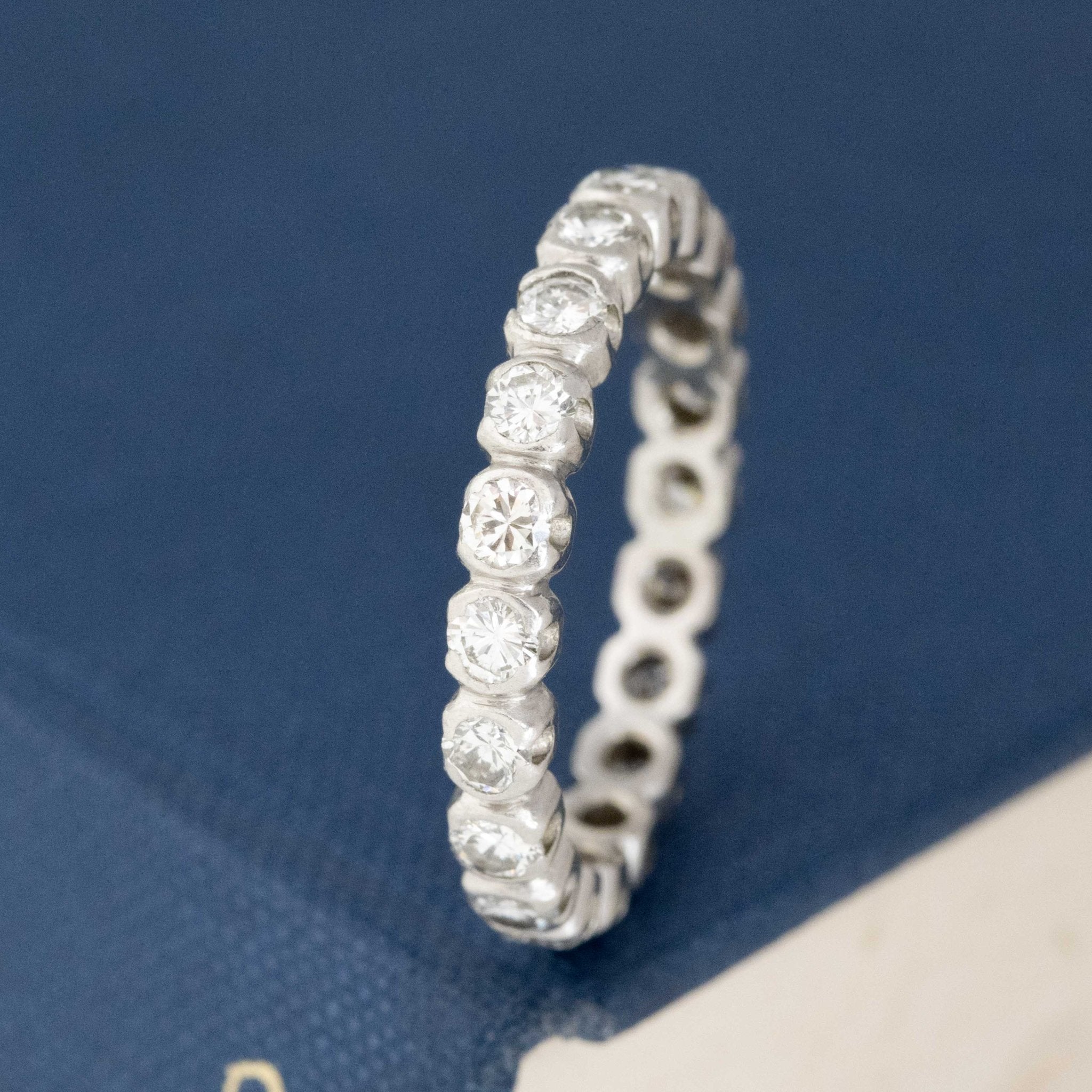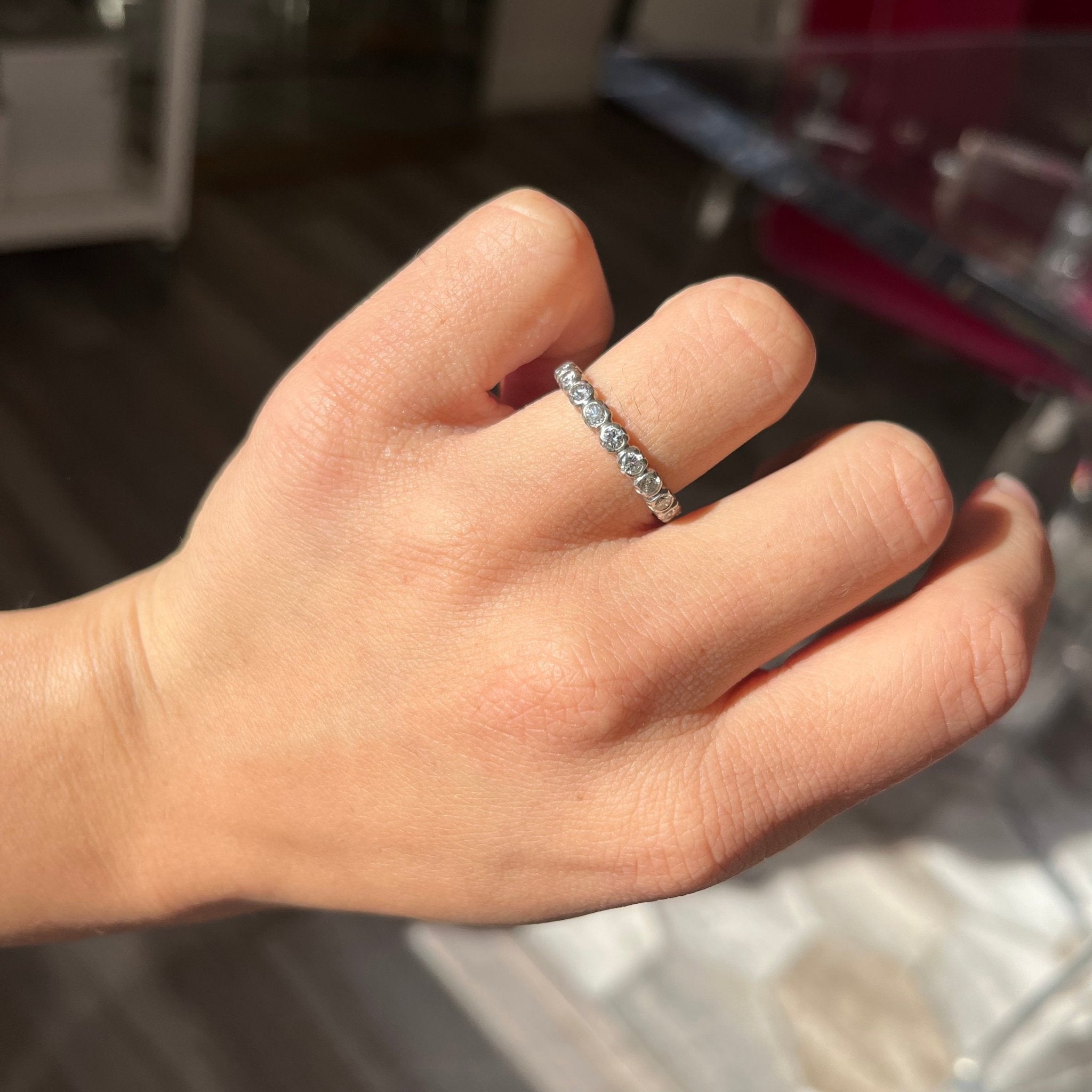 Diamond eternity bands are a classic piece of jewelry that are sure to dazzle from day to night, from now 'till forever! This round brilliant number has a unique, bezel-like setting that really maximizes diamond sparkle and size.