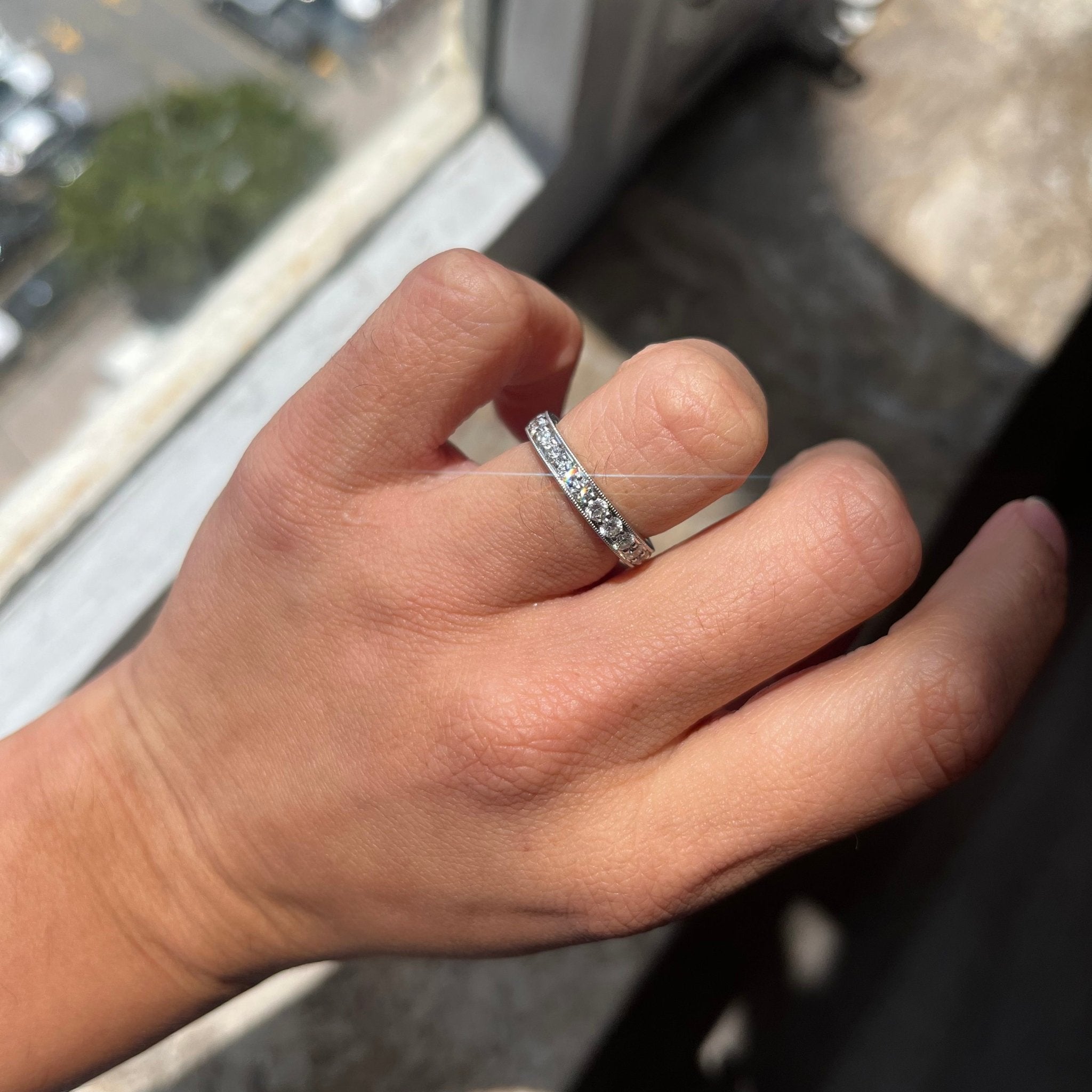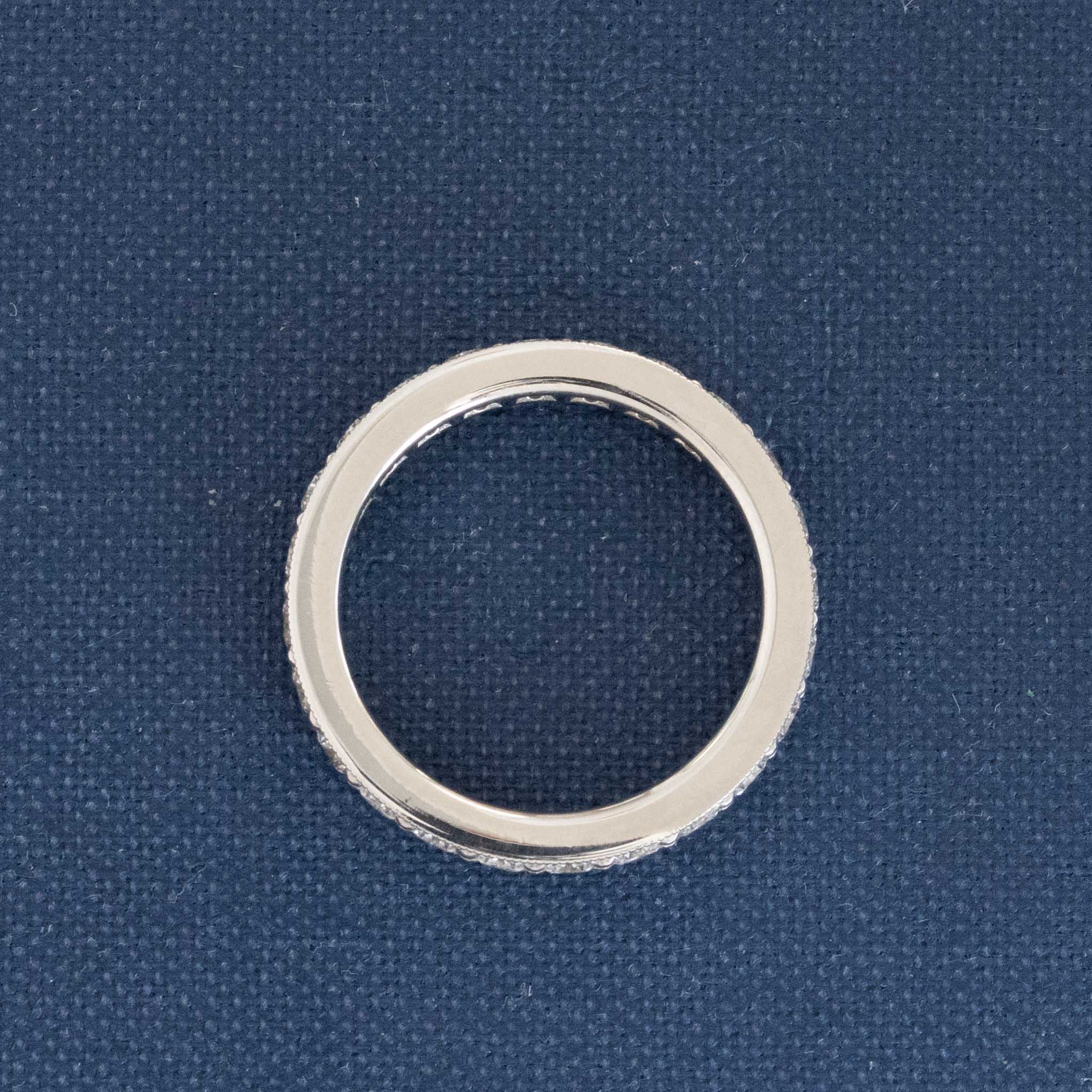 "The Tiffany Together collection represents how our most important commitments are uniquely ours—and only we can define them. Here, a full circle of bead-set diamonds shines between milgrain edges. Wear this platinum design on its own or stack it with other bands for a look that is effortlessly elevated."