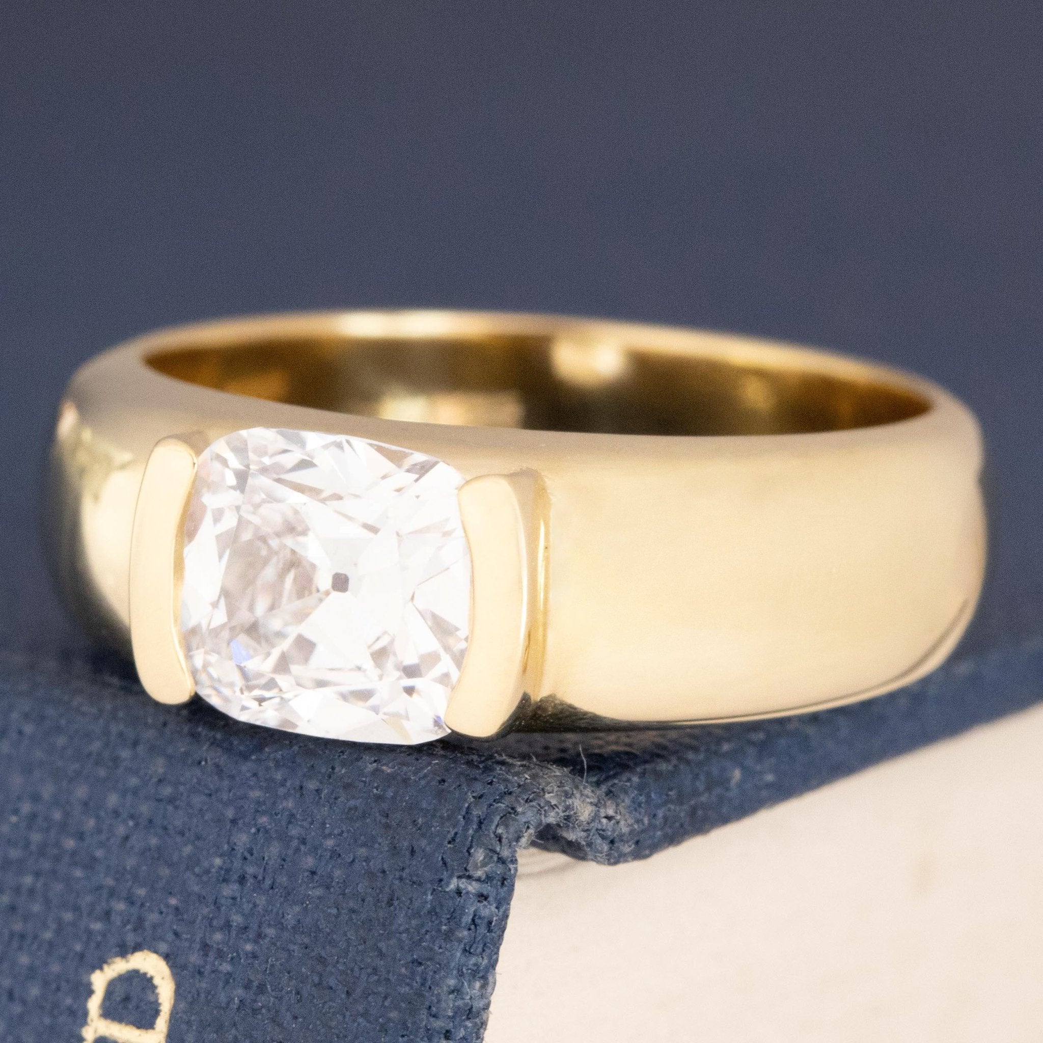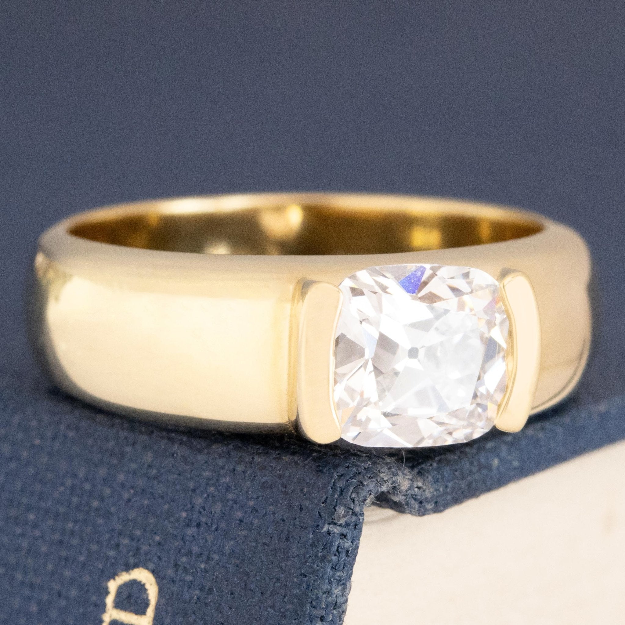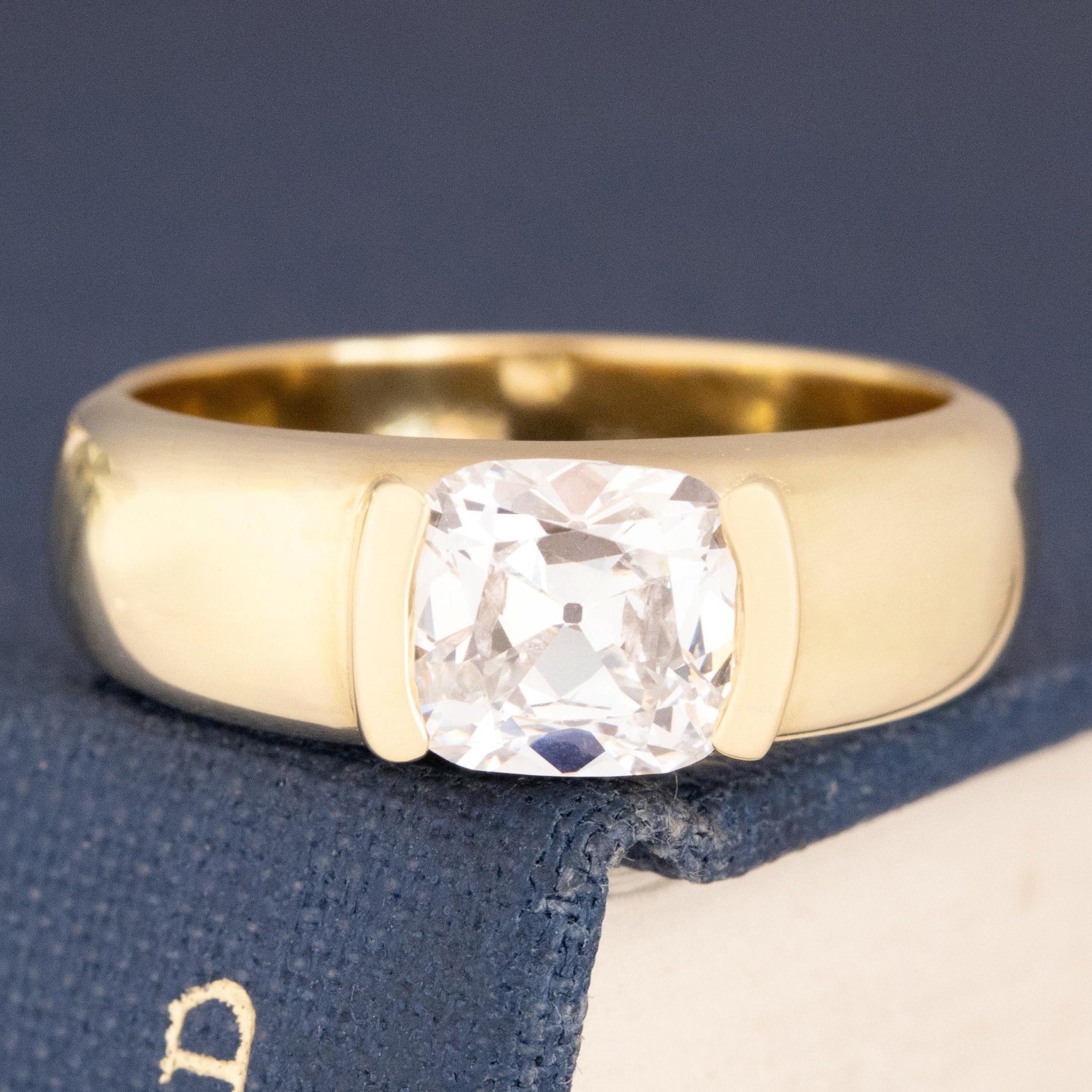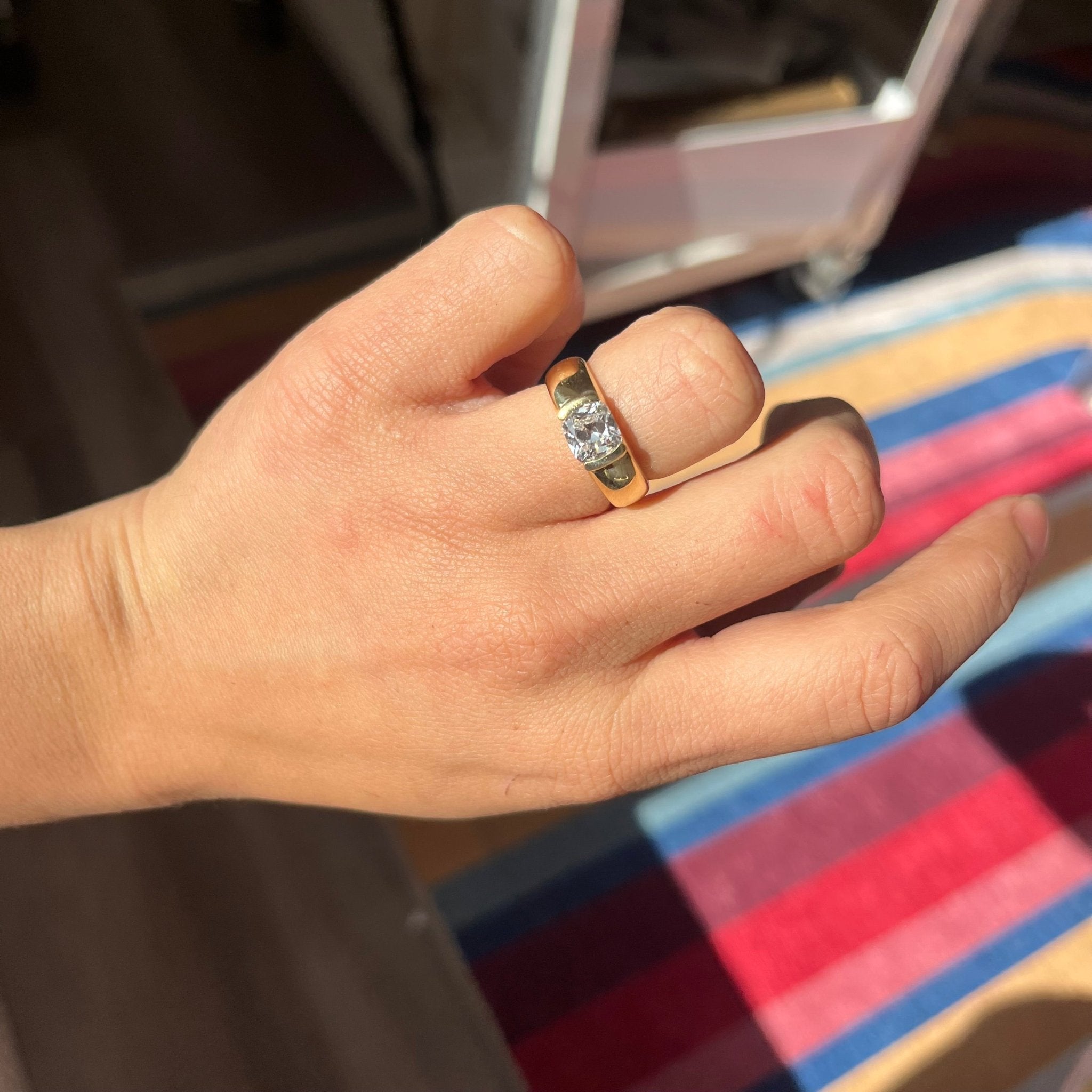 A chunky, wide half-bezel setting which matches perfectly with its' equally chunky old mine cut diamond center! Sitting in the east/west orientation, this ring wraps around one's finger in the most buttery delicious way. The stone is a 1.26ct antique old mine cut with a cushiony shape and charming facets - she spans across the finger beautifully and makes for a chic and timeless solitaire ring. She would stack beautifully with a band too - perhaps a vintage platinum band, or a yellow gold one dotted with diamonds?