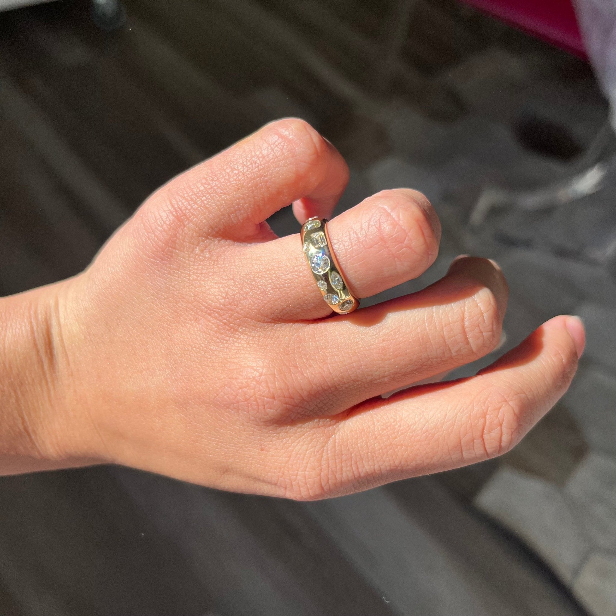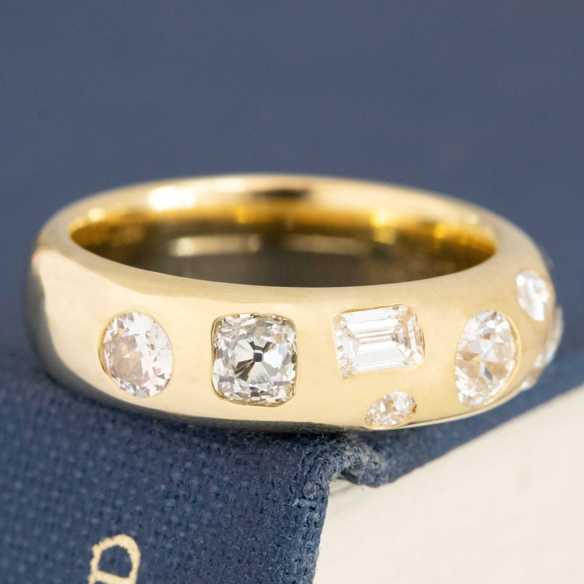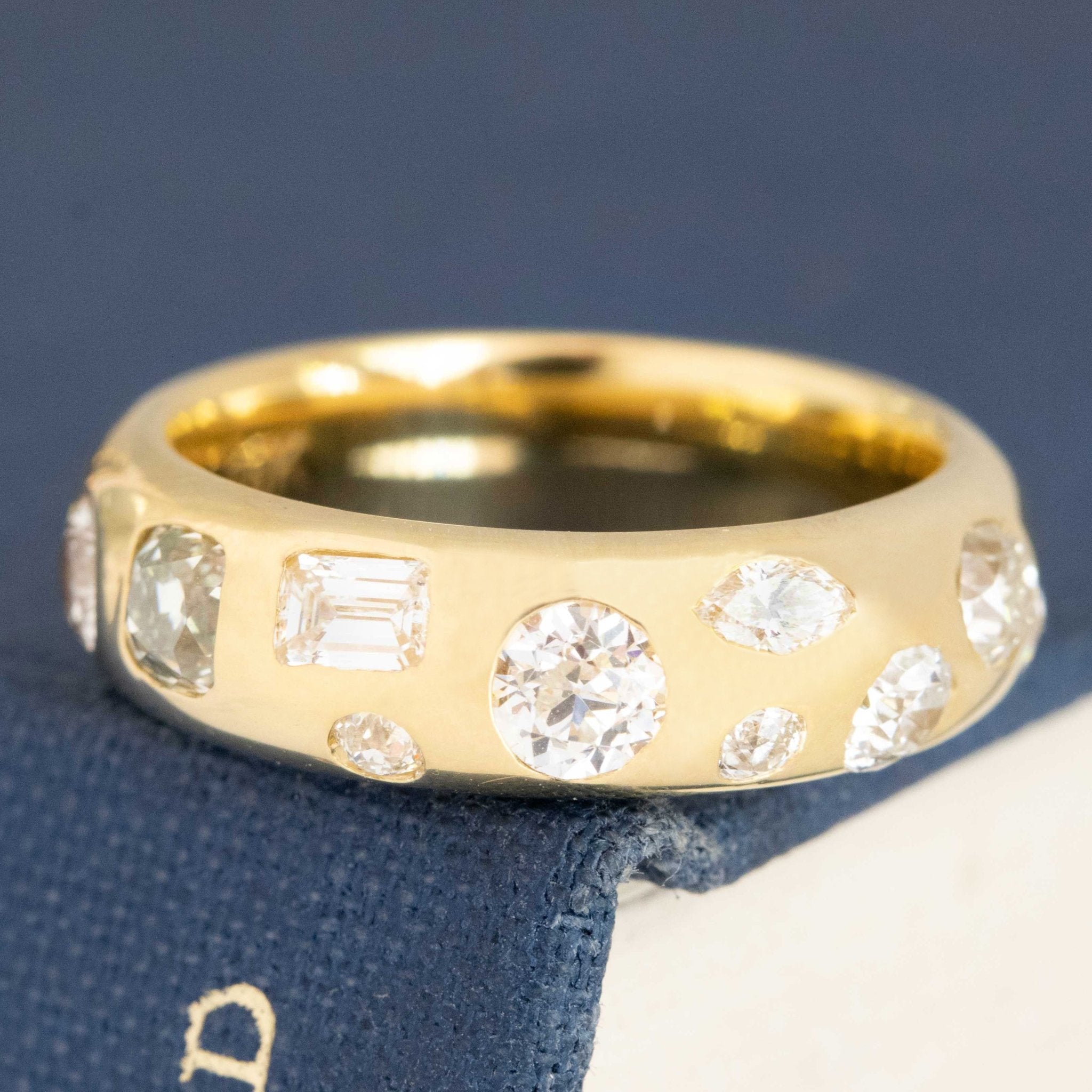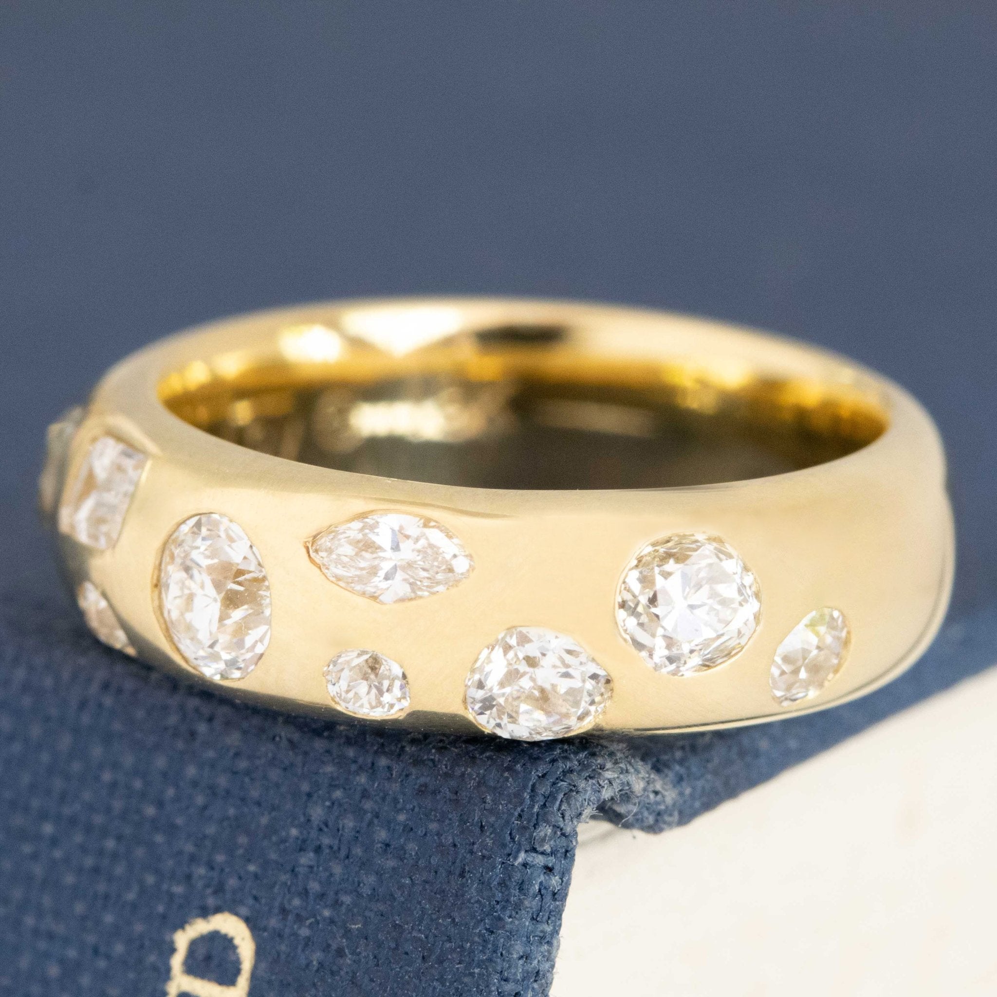 We've come across plenty of vintage rings n this style - we refer to them as scatter bands, as they are usually a chunky gold canvas with old cut diamonds scattered throughout. We had our jewelers set these recycled antique and vintage diamonds in a random orientation, giving you a ring that is both modern and rustic at the same time. She's so chic and sparkly, we are in love with how these bands have turned out! Hefty and chic - she is sure to become your go-to band!