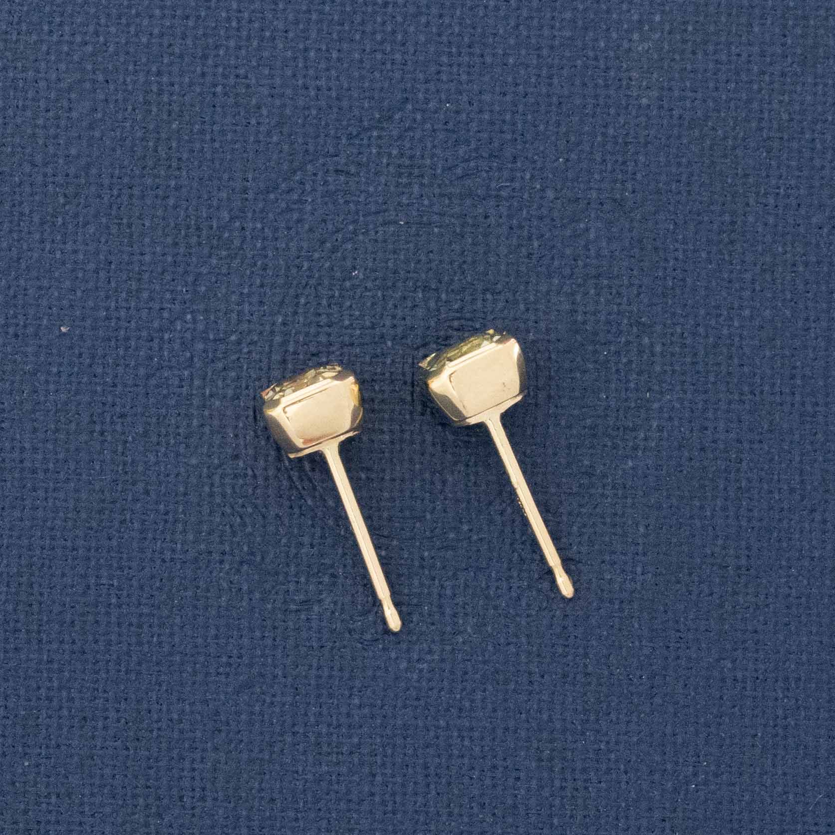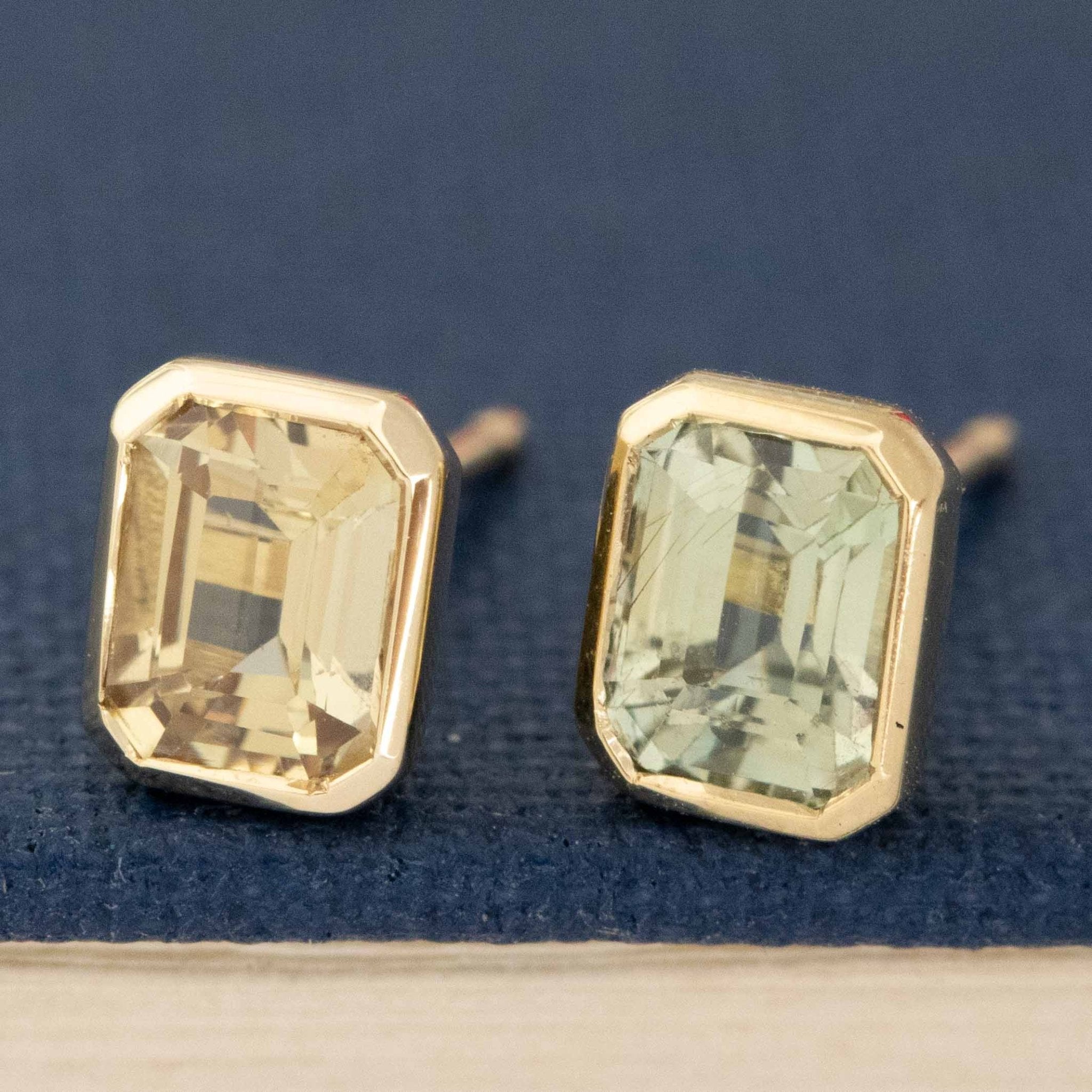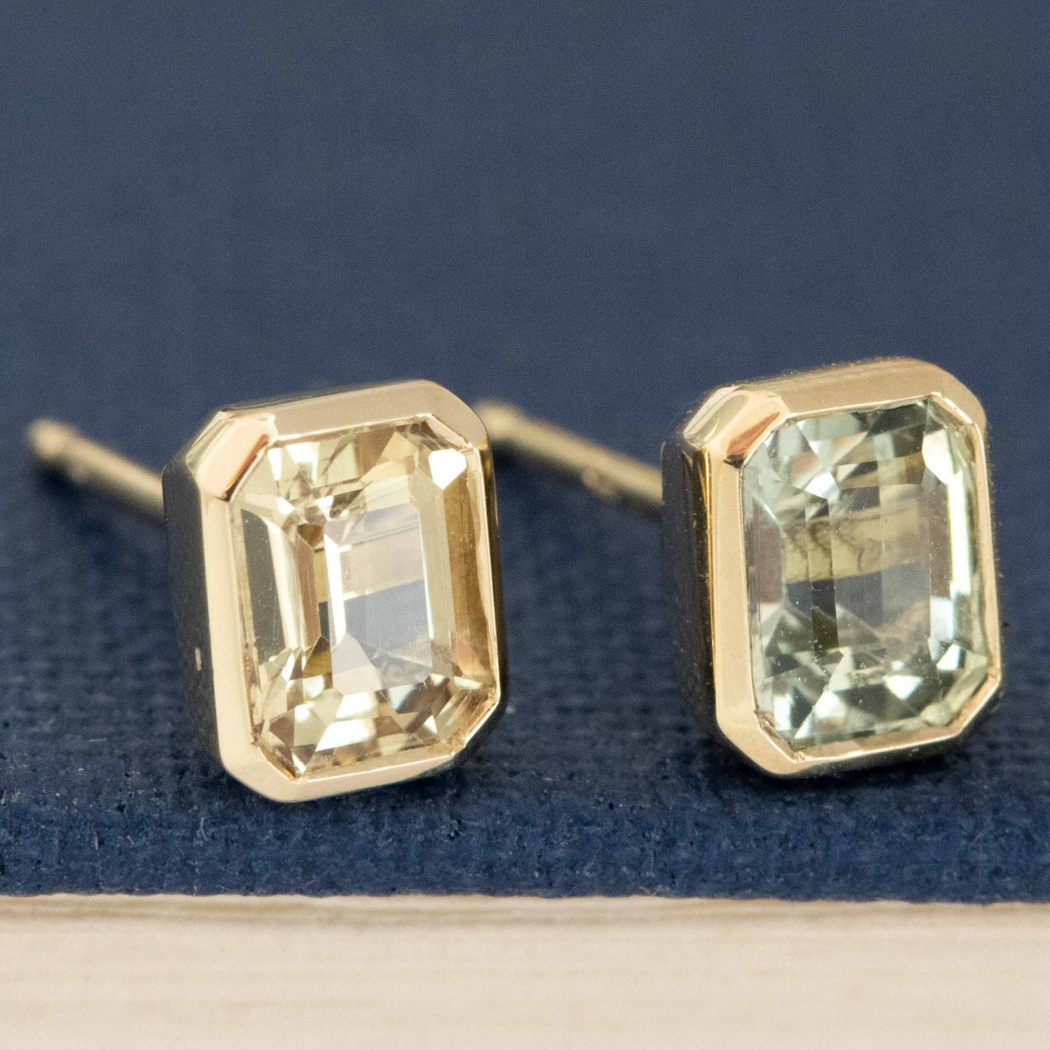 These sweet, pale yellow/green babies have great spread and look beautiful in 14kt yellow gold. The bezels help emphasize those crisp, geometric corners while adding a bit more size on the lobes. Perfect studs, if you ask us!
