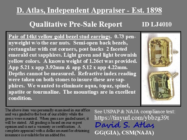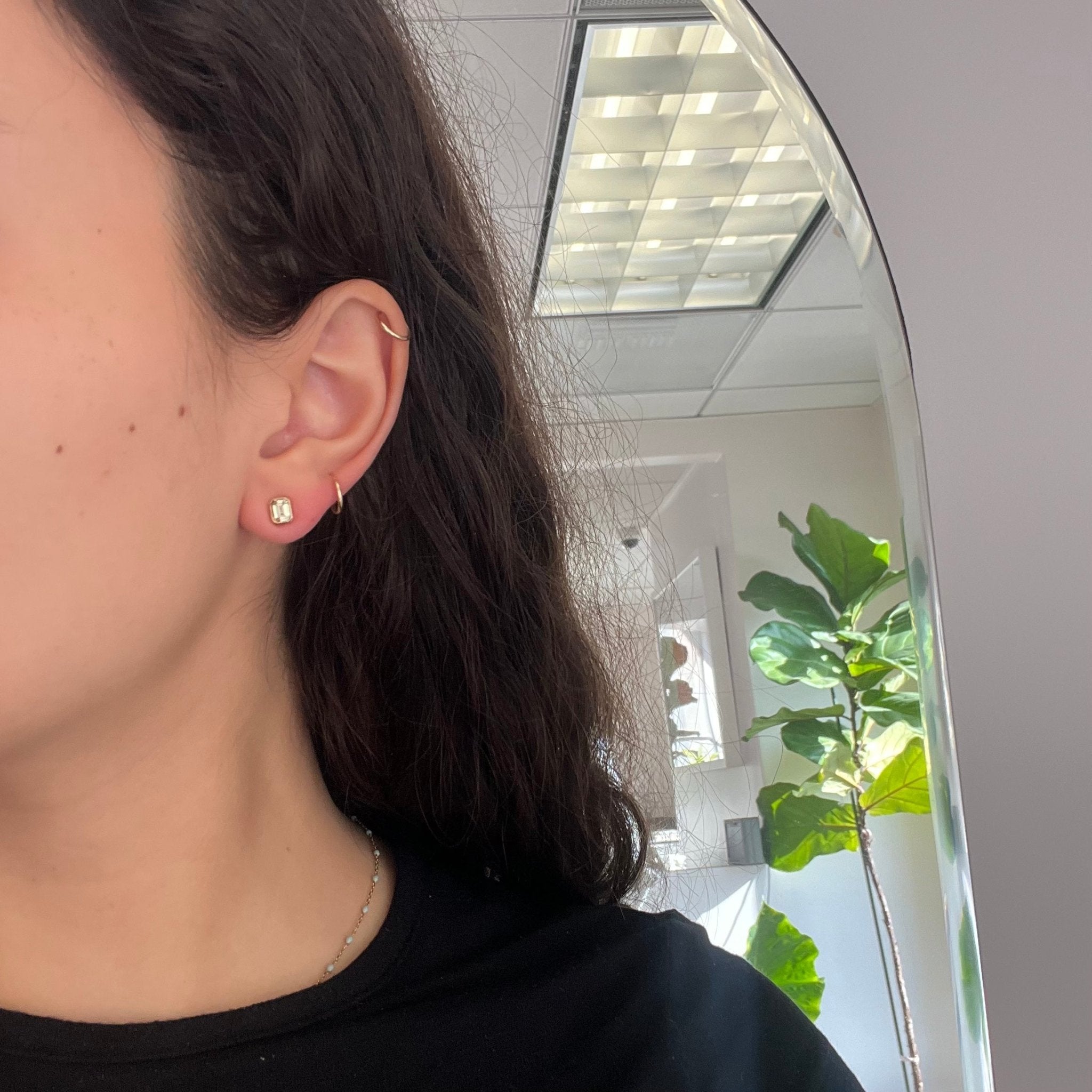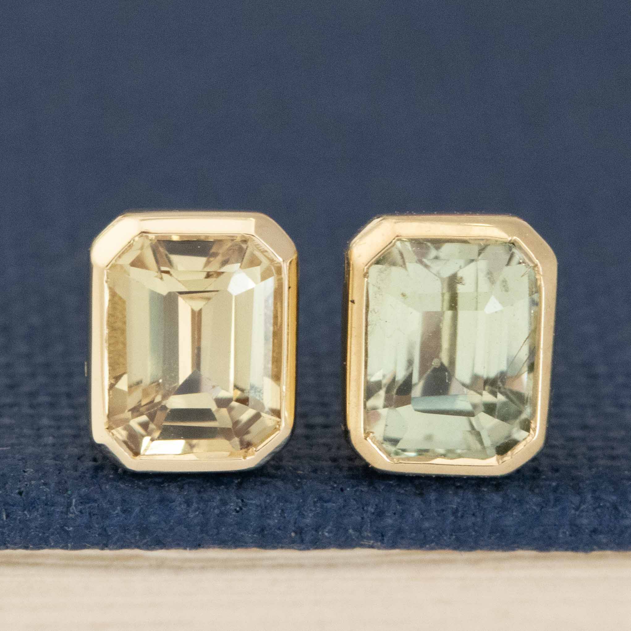 These sweet, pale yellow/green babies have great spread and look beautiful in 14kt yellow gold. The bezels help emphasize those crisp, geometric corners while adding a bit more size on the lobes. Perfect studs, if you ask us!
