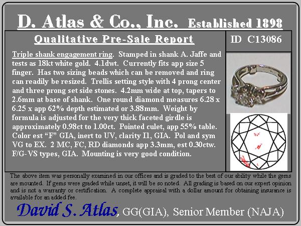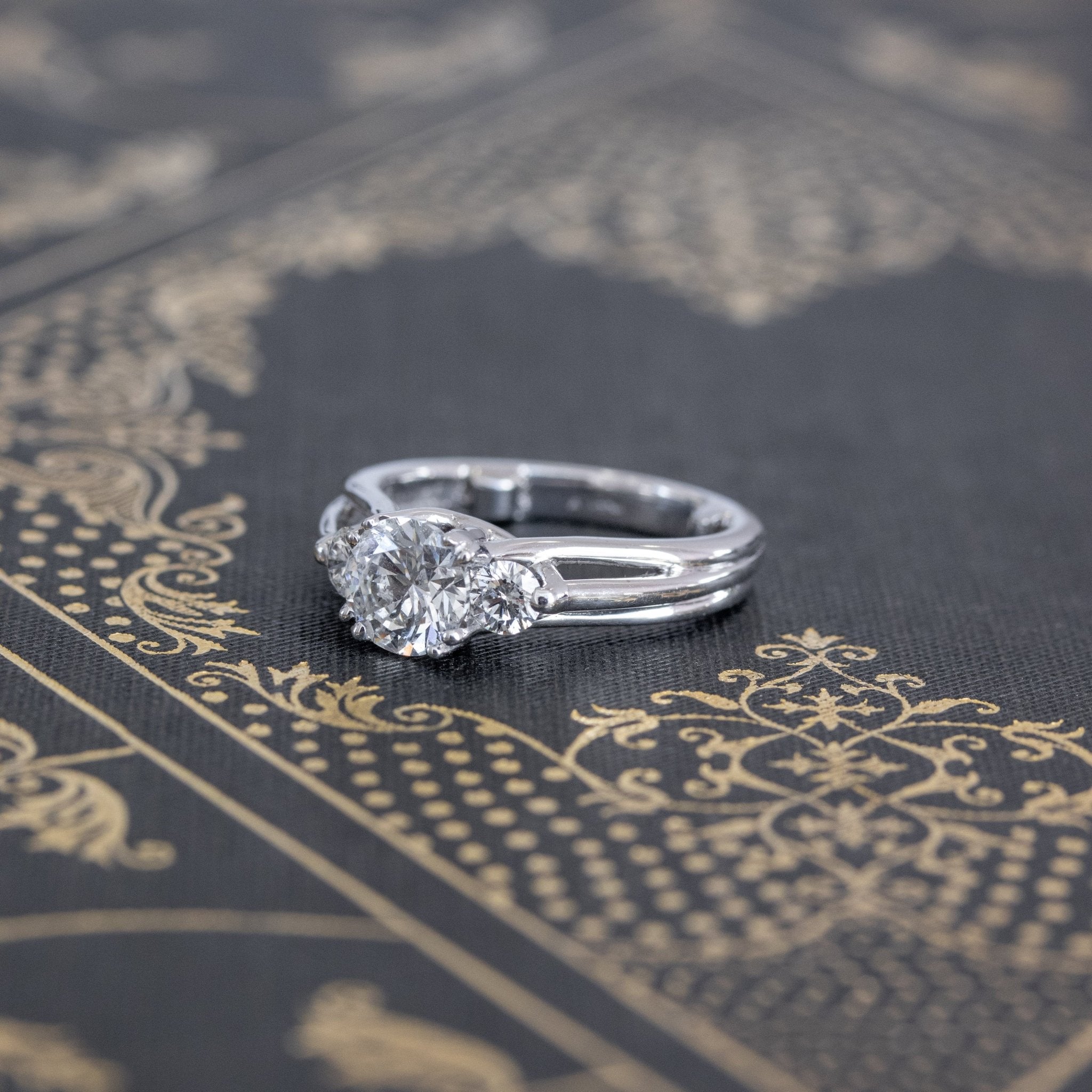 Classic 3-stone ring, set with an icy-white round brilliant diamond center stone, flanked by .30ctw of nicely matched side stones. The setting is by jeweler A. Jaffe and retails in the $2900 range (style ME1279, part of their Classic collection). The diamond is bright and is a lovely performer, its sparkle and fire not impacted by its clarity grading at all!