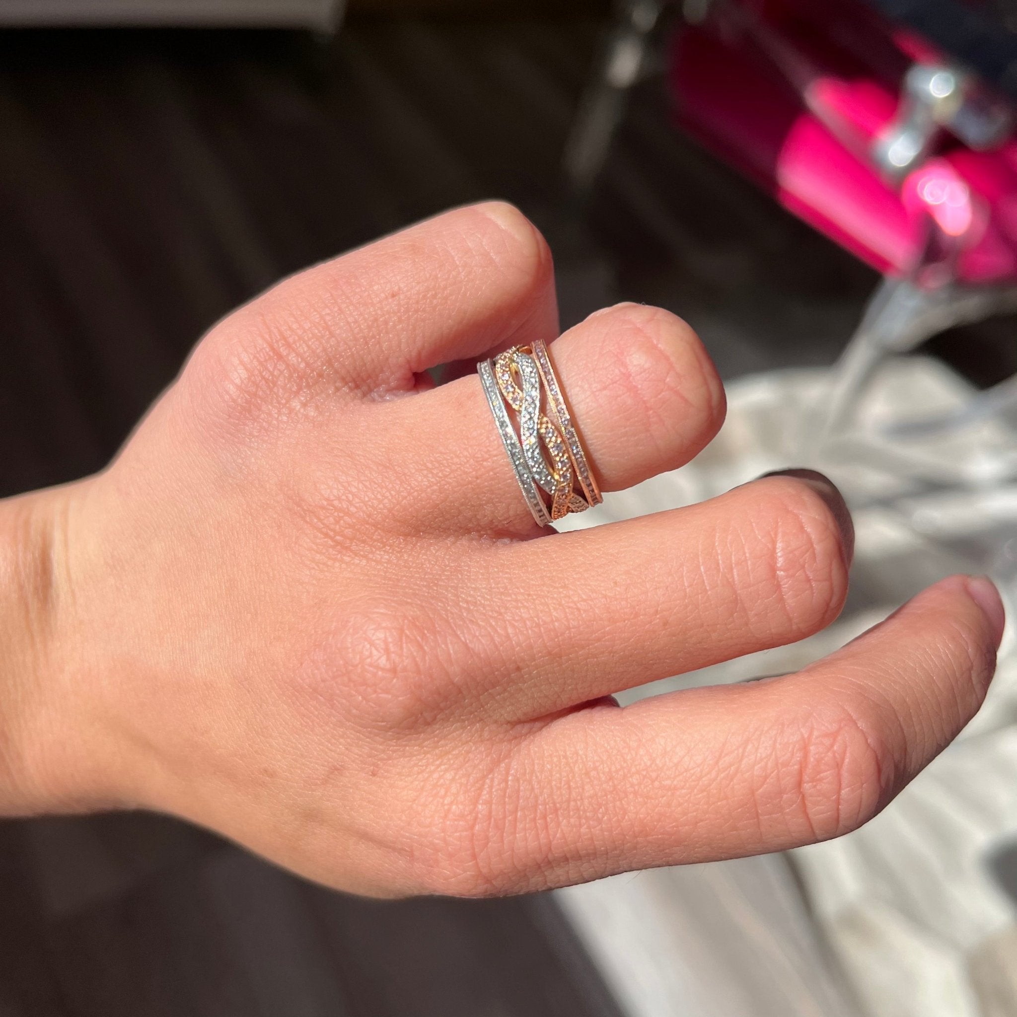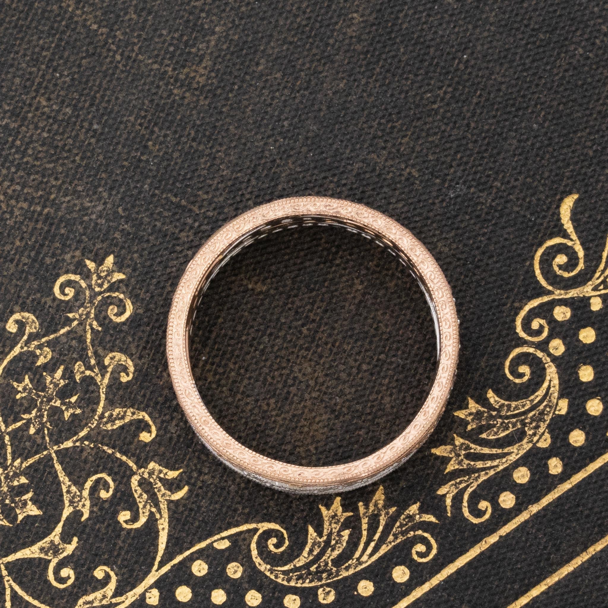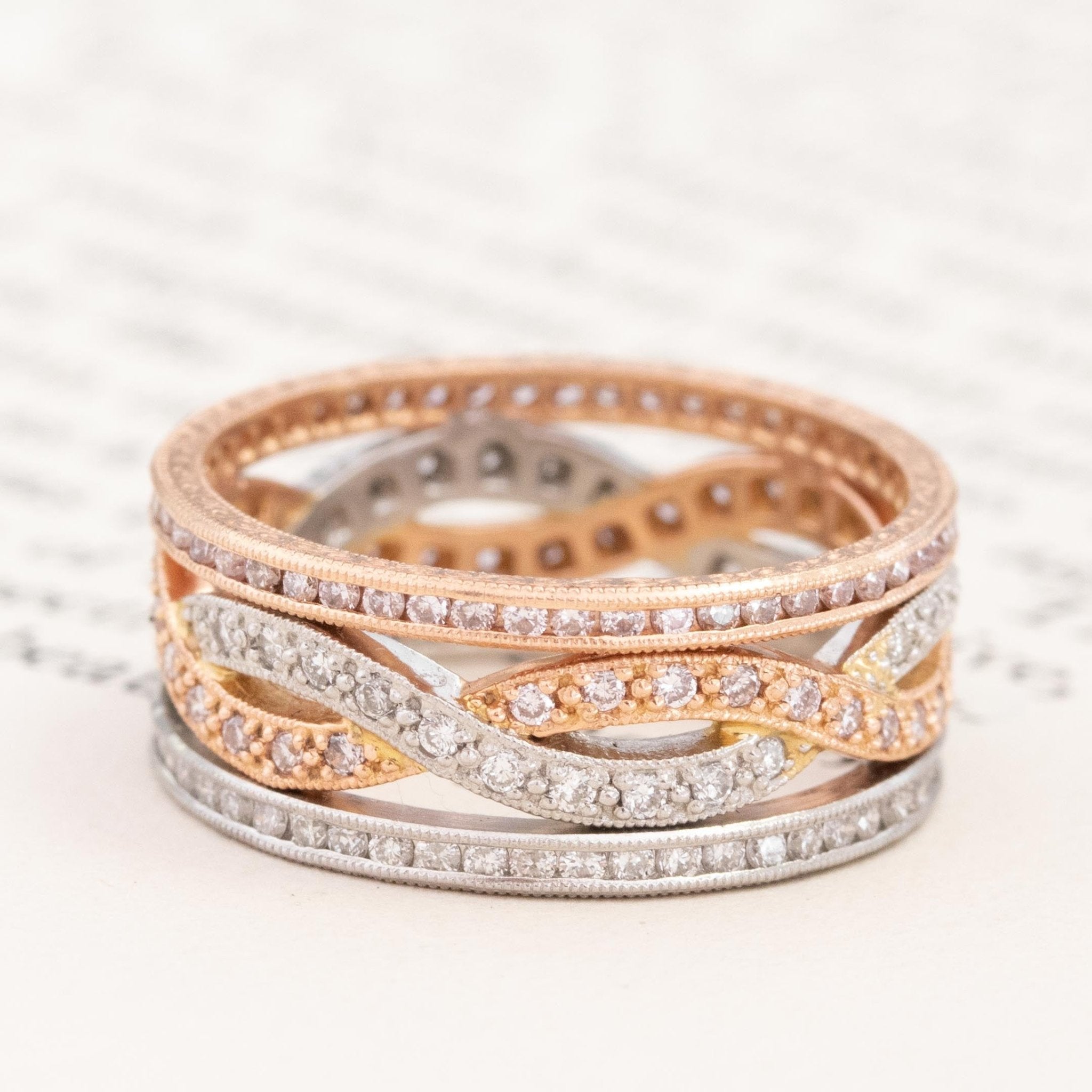 A beautiful two-tone band with white and fancy pink diamonds, all intertwined gracefully in bead and channel settings. Dotted with sparkle and migraine all over, we love the duality of this band and how one can style it with mixed metals or go with all pink/all white. Super chic on the finger!