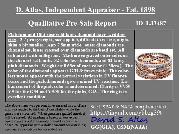 - Diamonds are estimated to be G/H & fancy pink colors, VVS-Si clarities. GIA standards