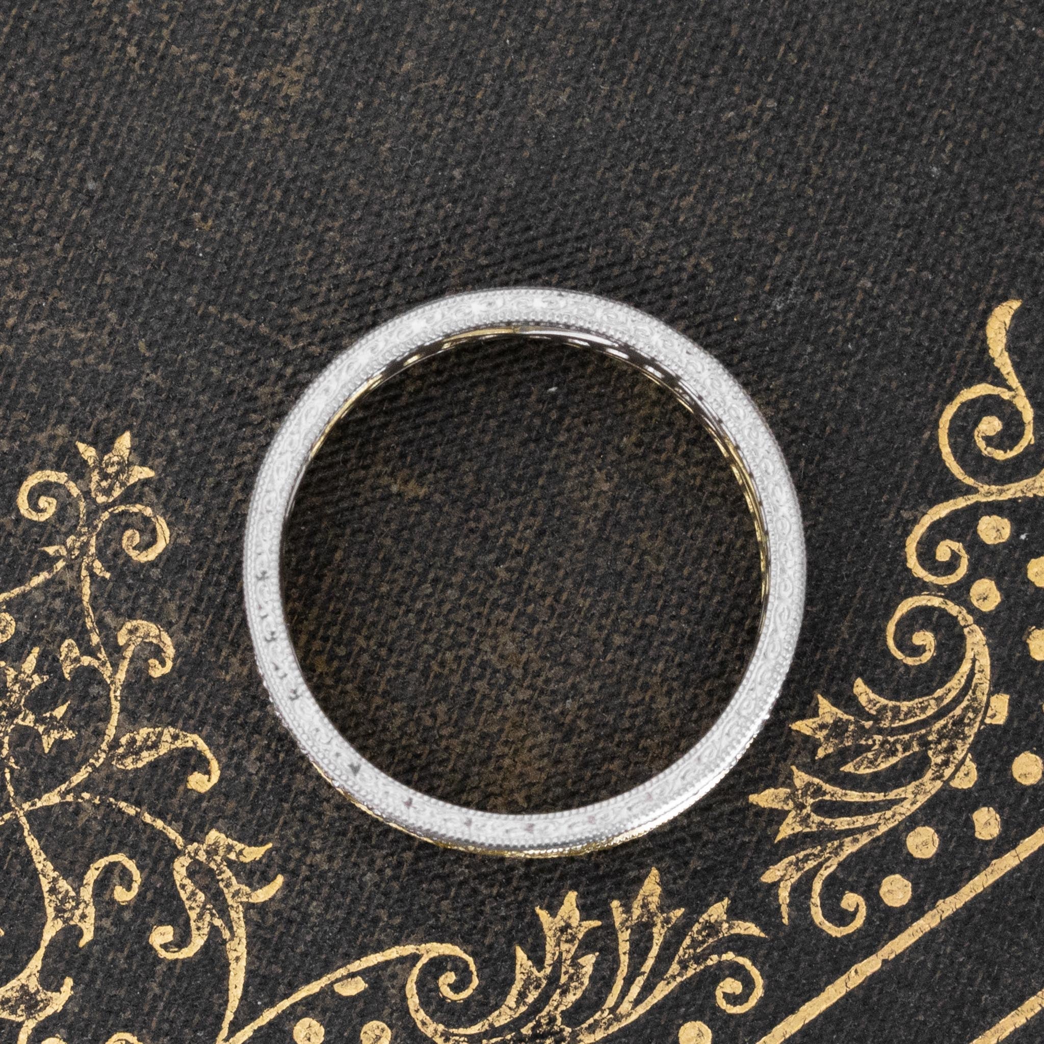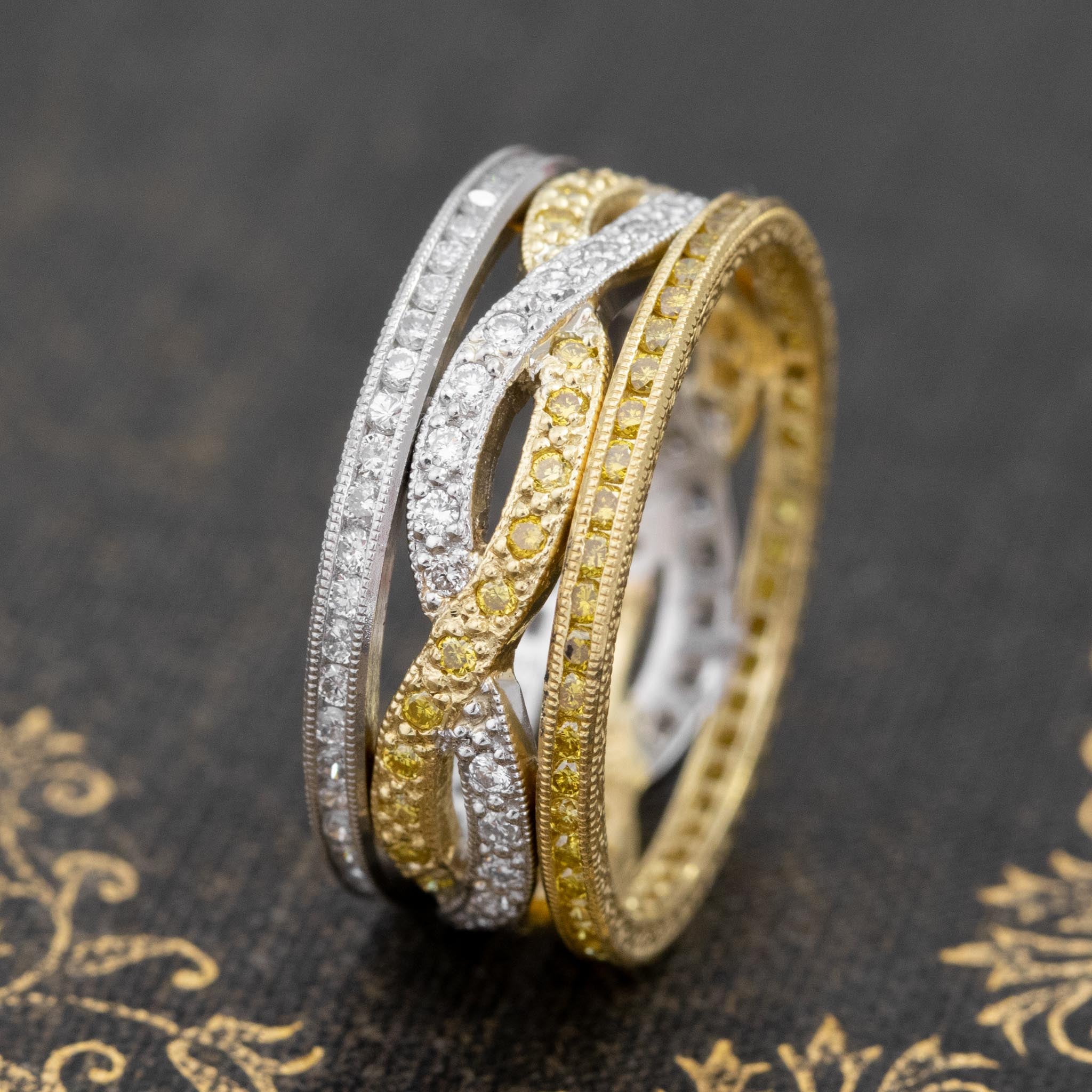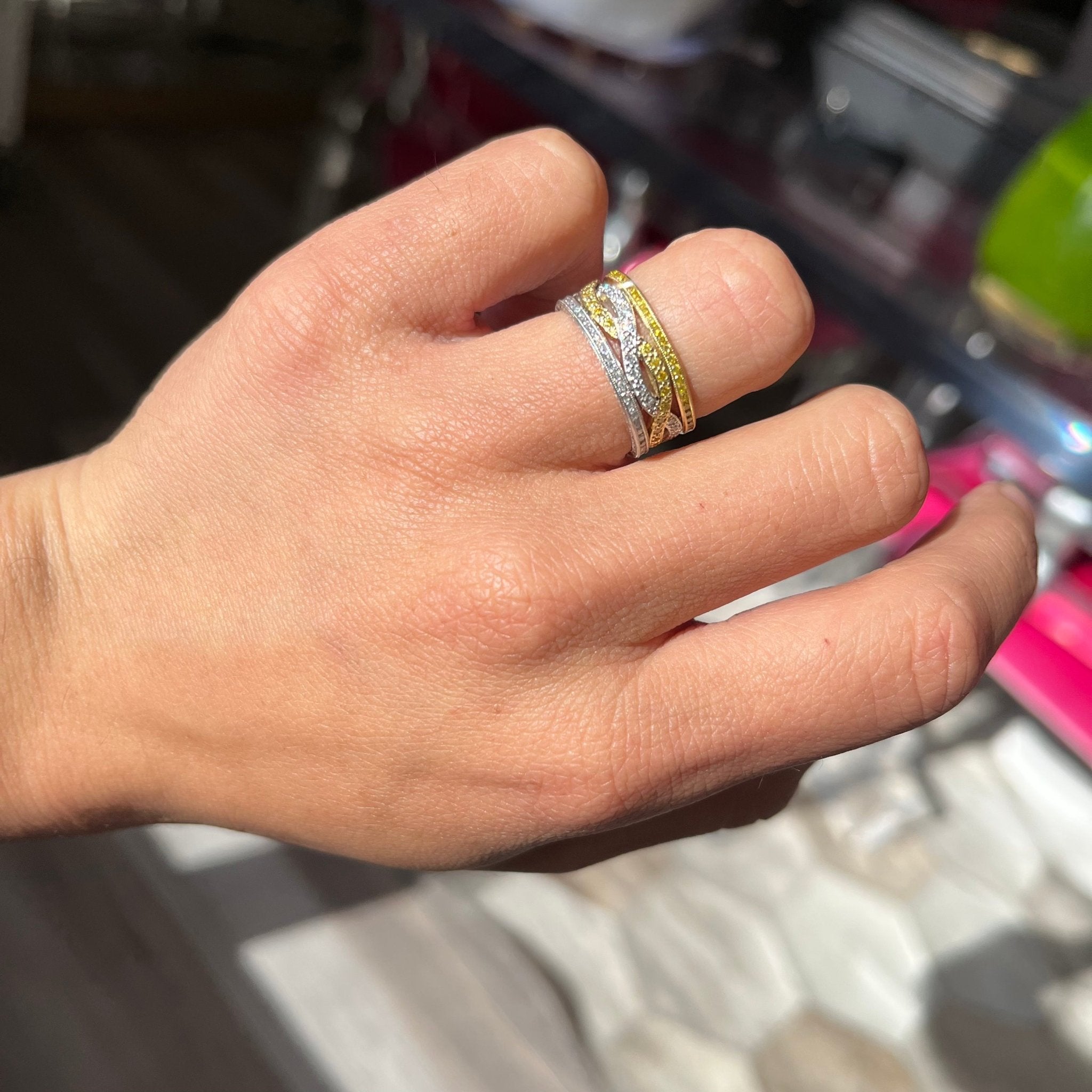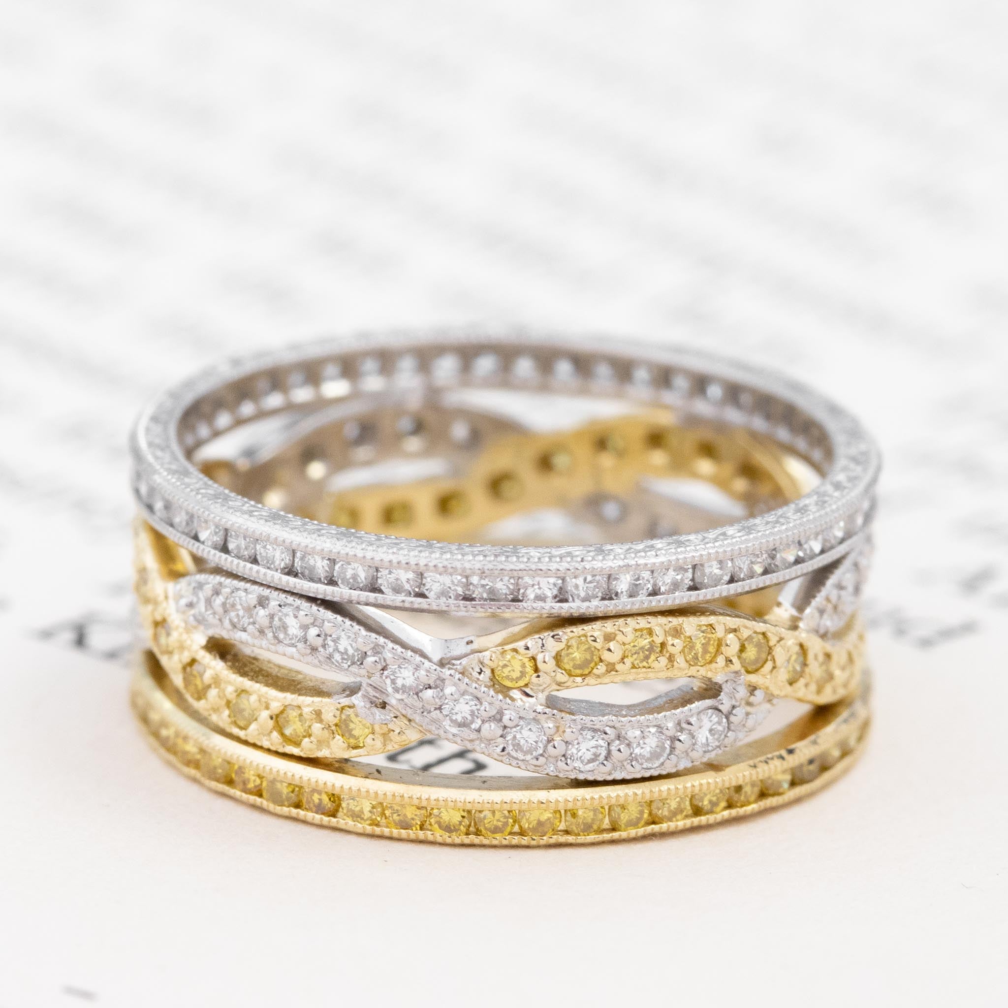 A beautiful two-tone band with white and fancy yellow diamonds, all intertwined gracefully in bead and channel settings. Dotted with sparkle and migraine all over, we love the duality of this band and how one can style it with mixed metals or go with all yellow/all white. Super chic on the finger!