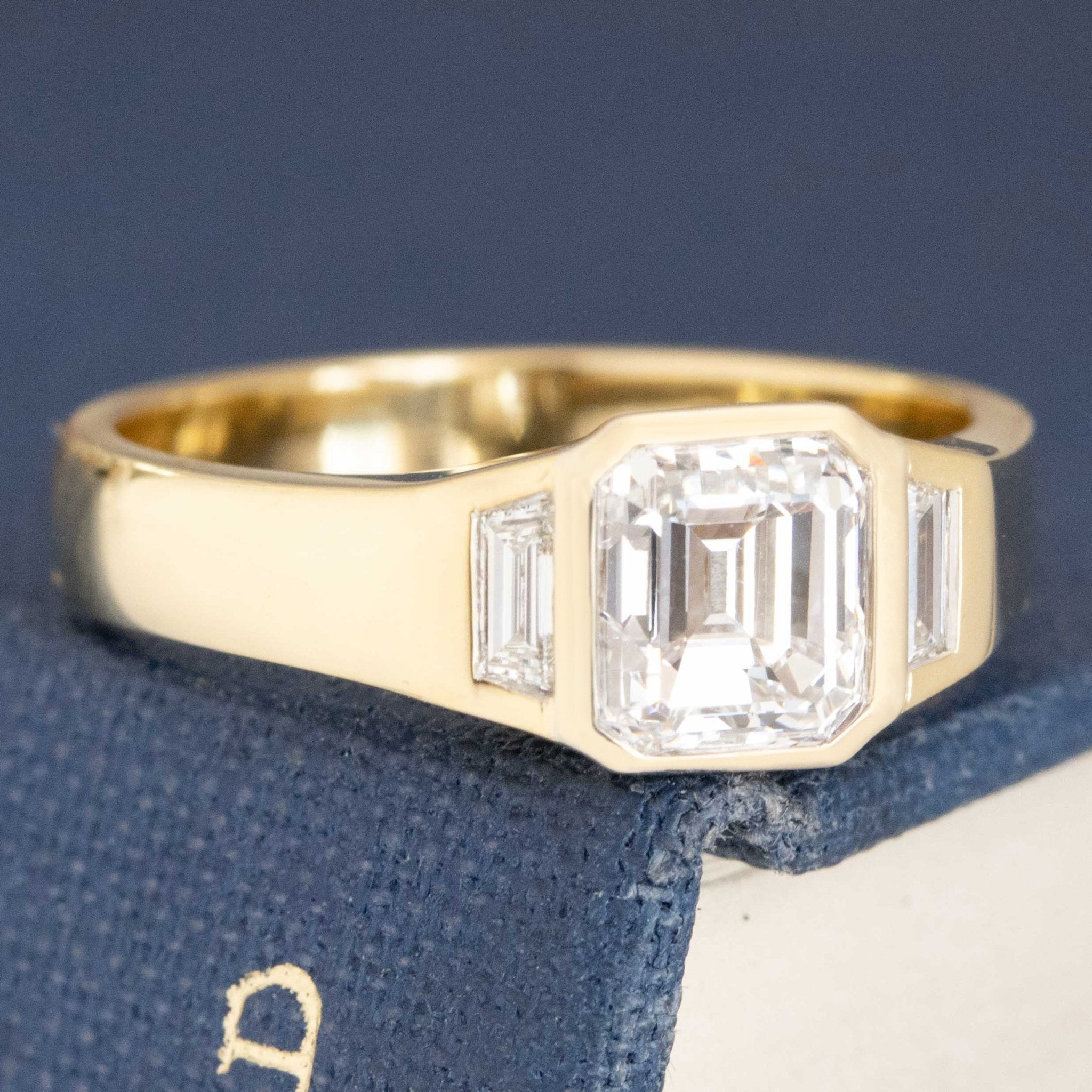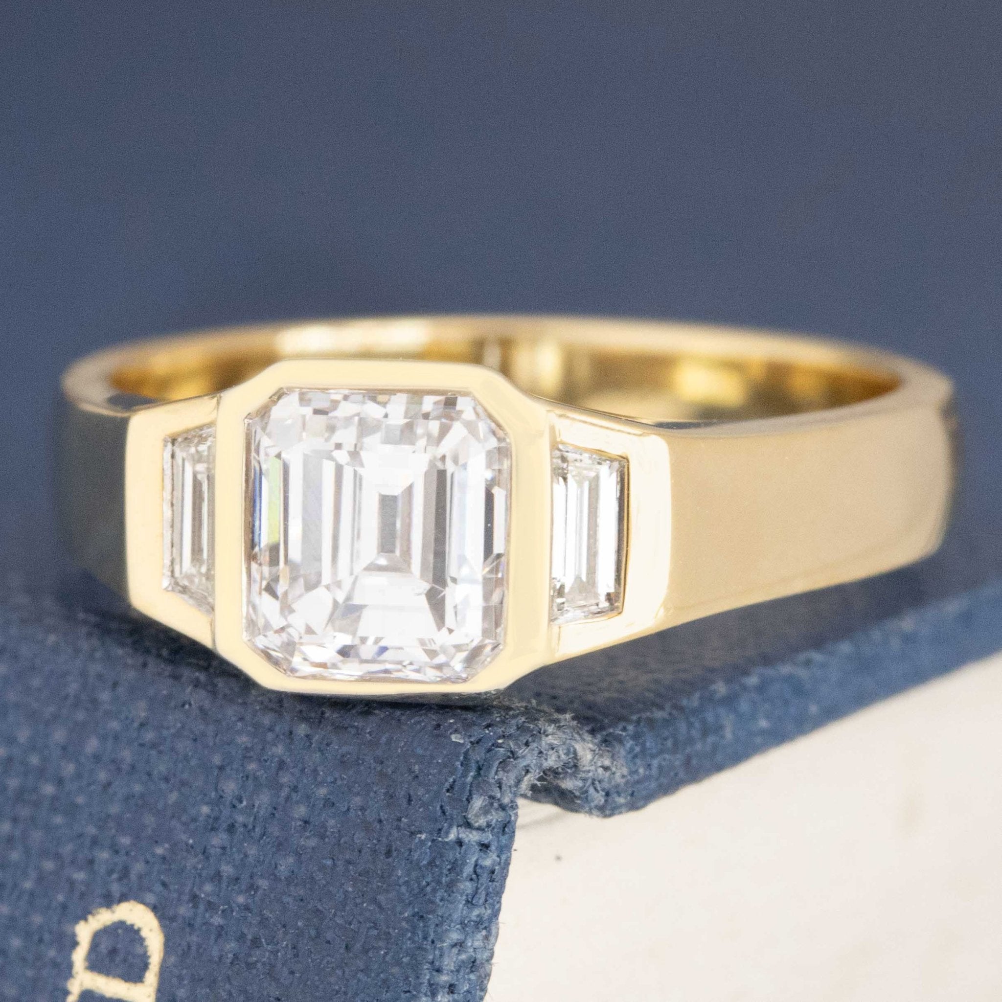 1.31ctw Emerald Cut Diamond Bezel Trilogy Ring