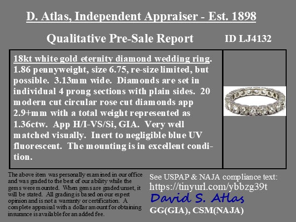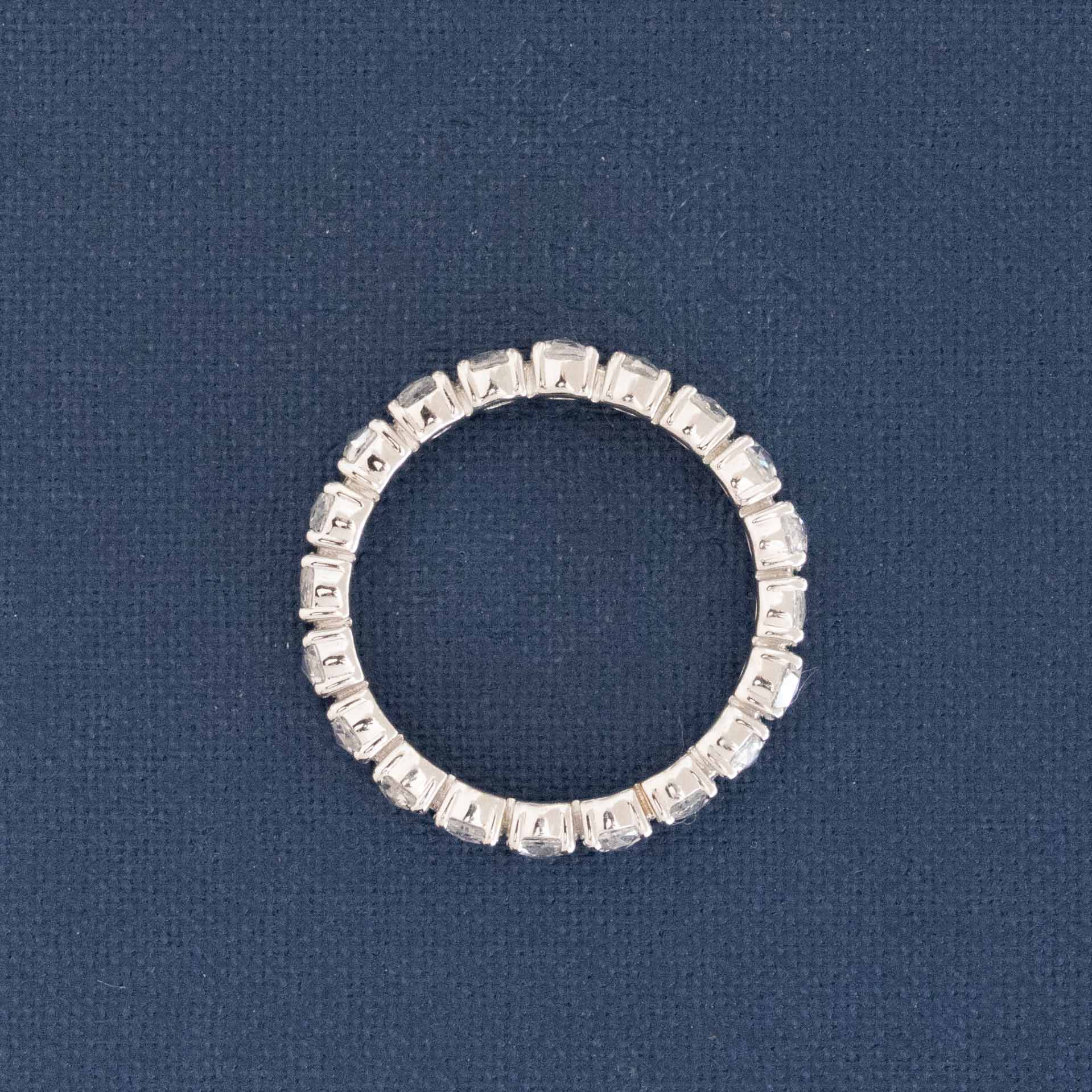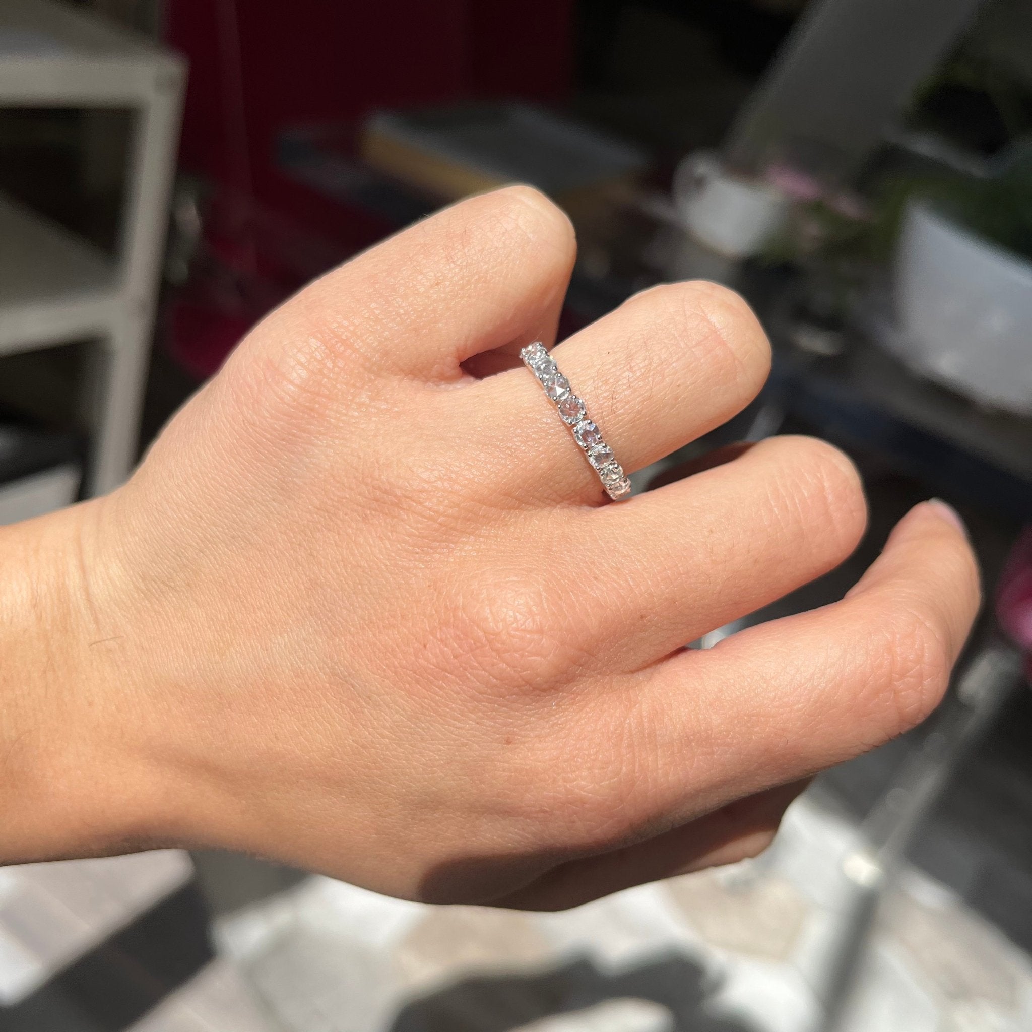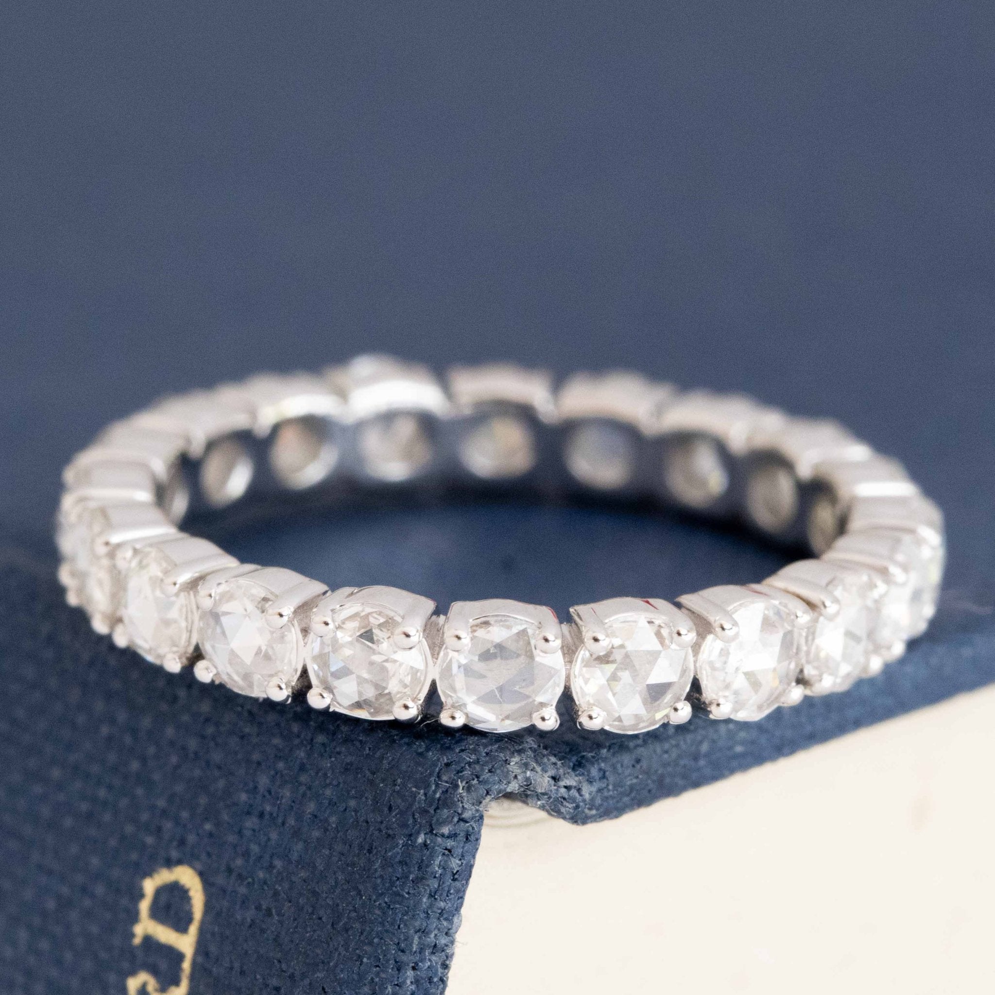 Rose cut diamonds are some of our favorites around here - they are elegant, unique, and have the prettiest faceting and shimmer. This full eternity band is made in 18kt white gold, allowing for a band that looks like a row of diamond floating on the finger. A wonderful option for those seeing a more subtle diamond stacker!