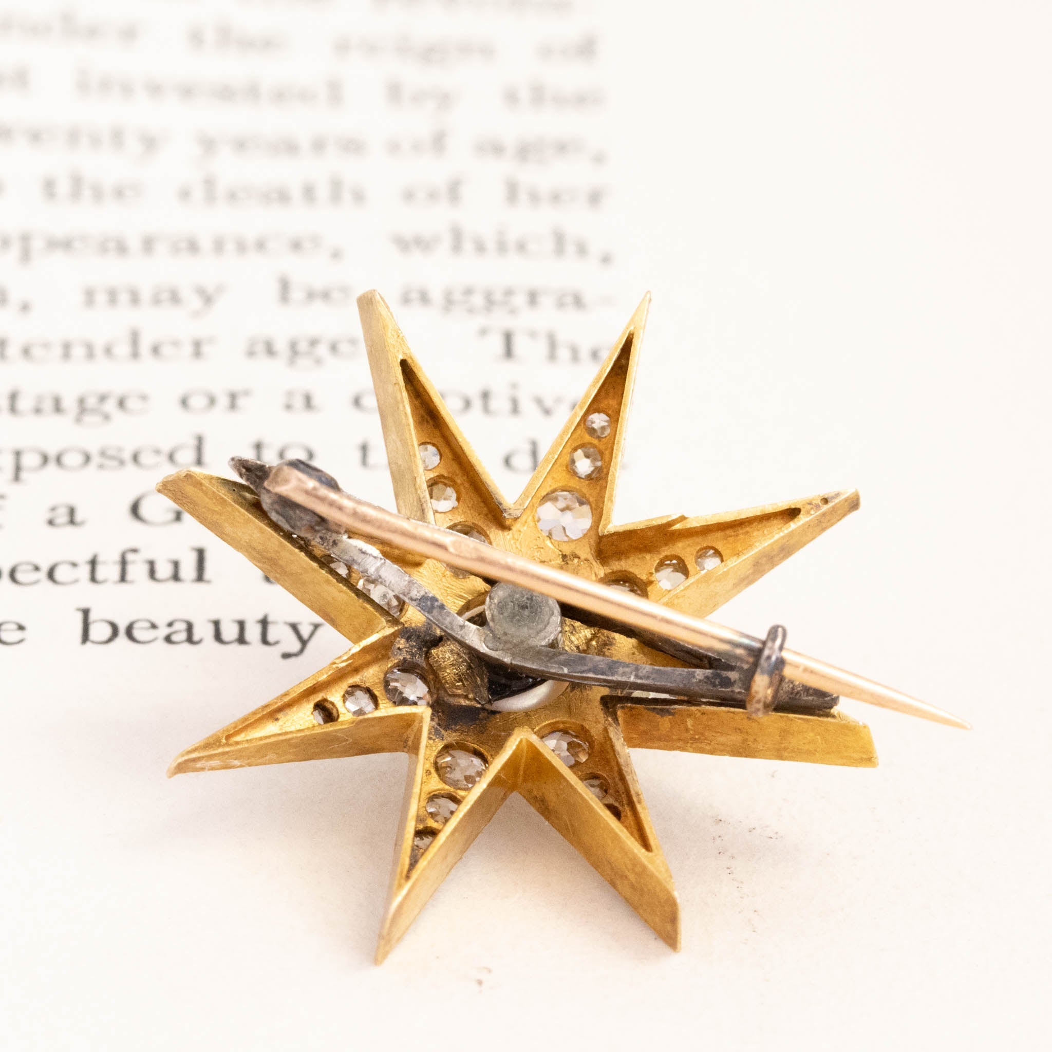 A classic Victorian-era jewel - an old mine cut encrusted gold starburst crescent with a sweet pearl center. In the perfect size for somebody who wants the glam and detail of a Victorian star in a more petite scale. Bright and sparkly, she'd make a perfect brooch or pendant.