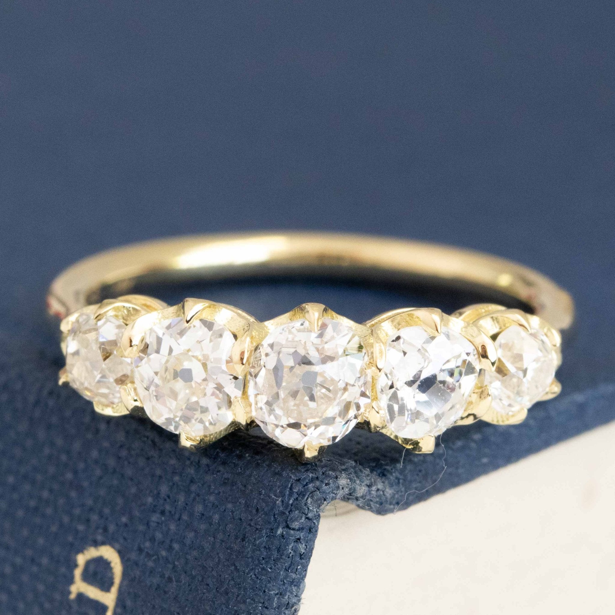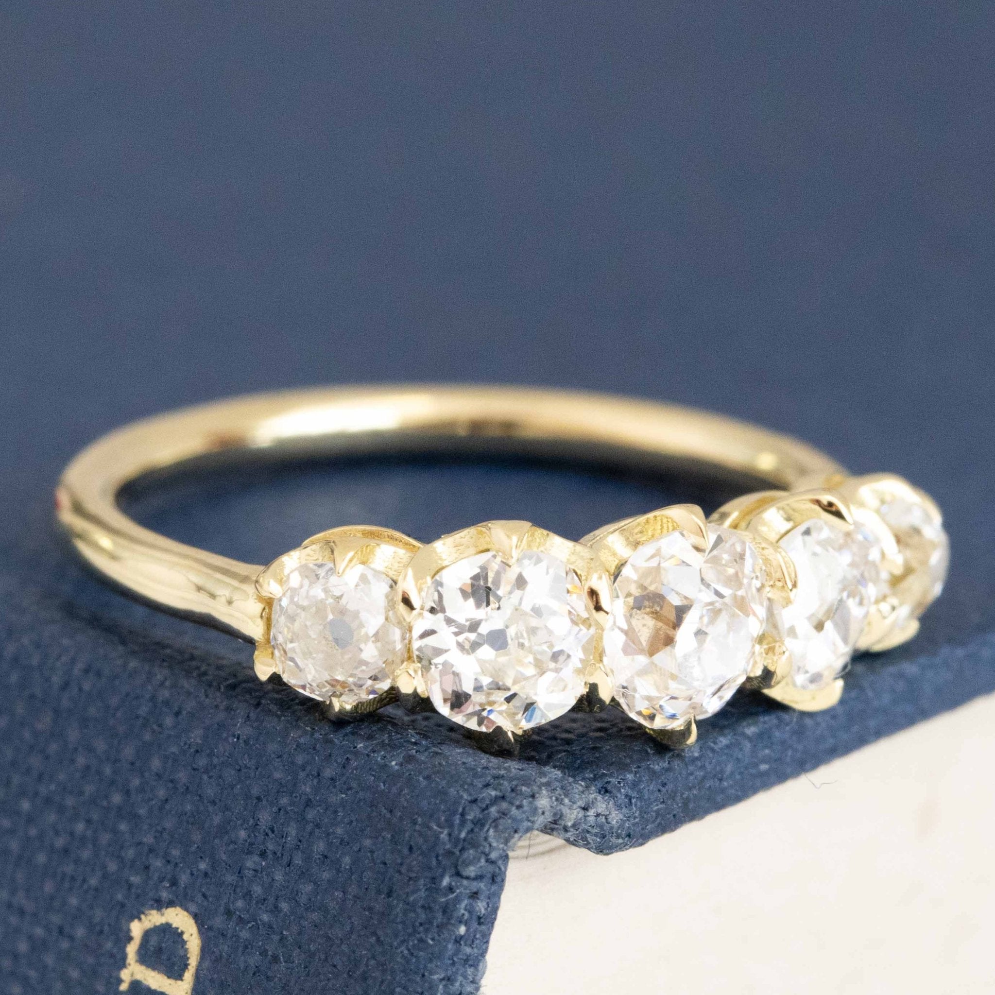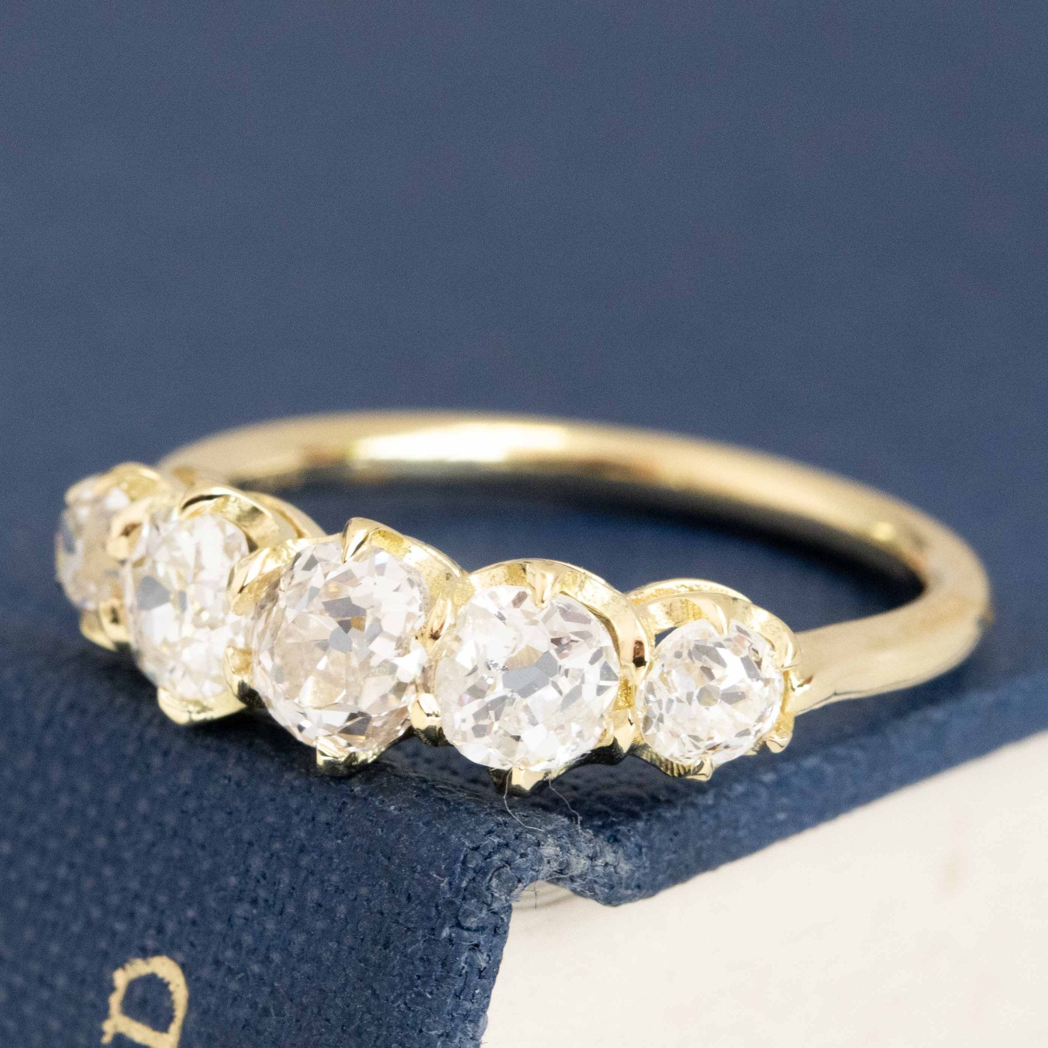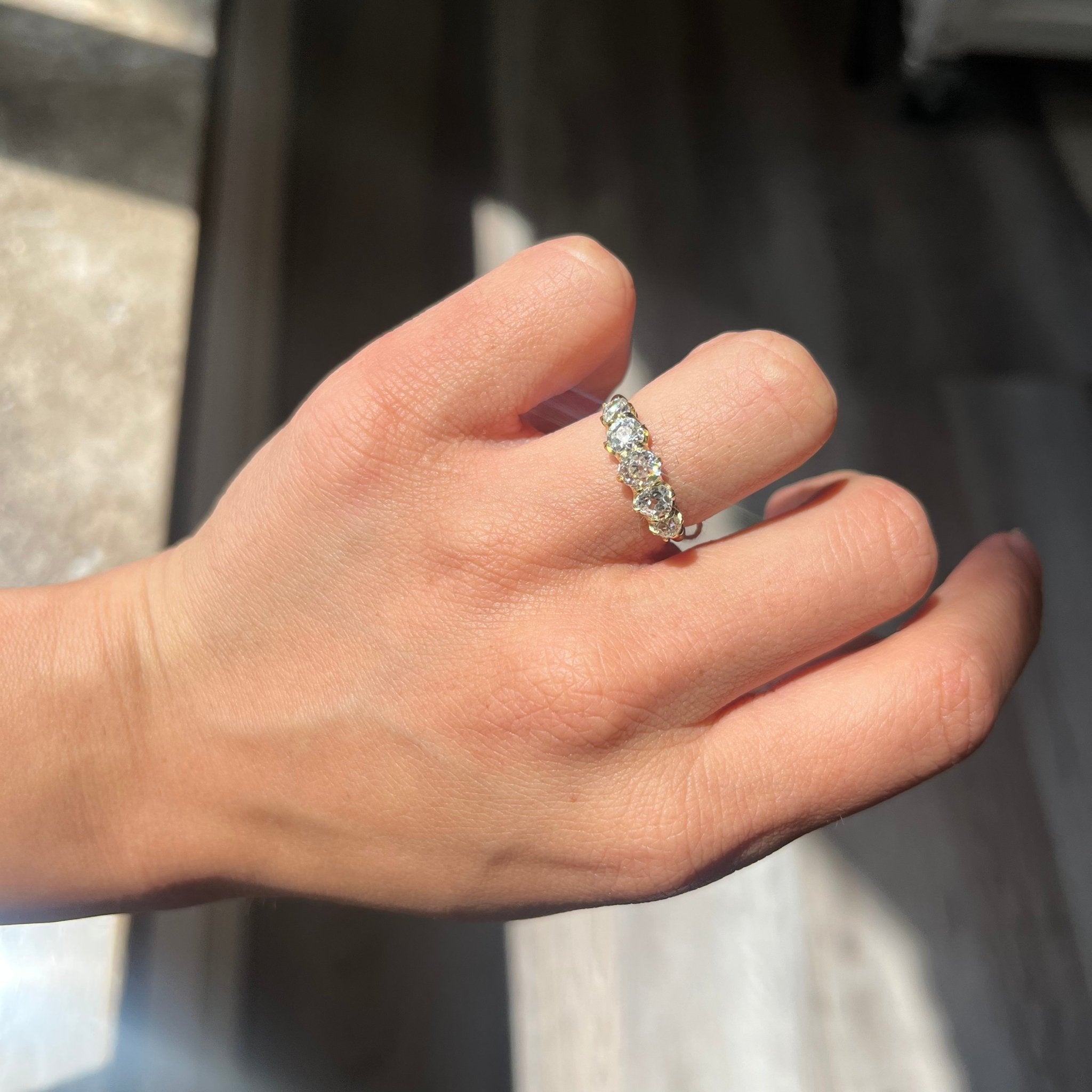 Modeled after antique diamond half-hoop bands from the Georgian and Victorian eras, this 5-stone band is set with chunky and charming old mine cut diamonds in 18kt yellow gold! The diamonds are bright and sparkly, twinkly and sparking brightly - so beautiful and elegant on the finger. This band is slightly graduated in size, giving you an even more unique look on the hands.