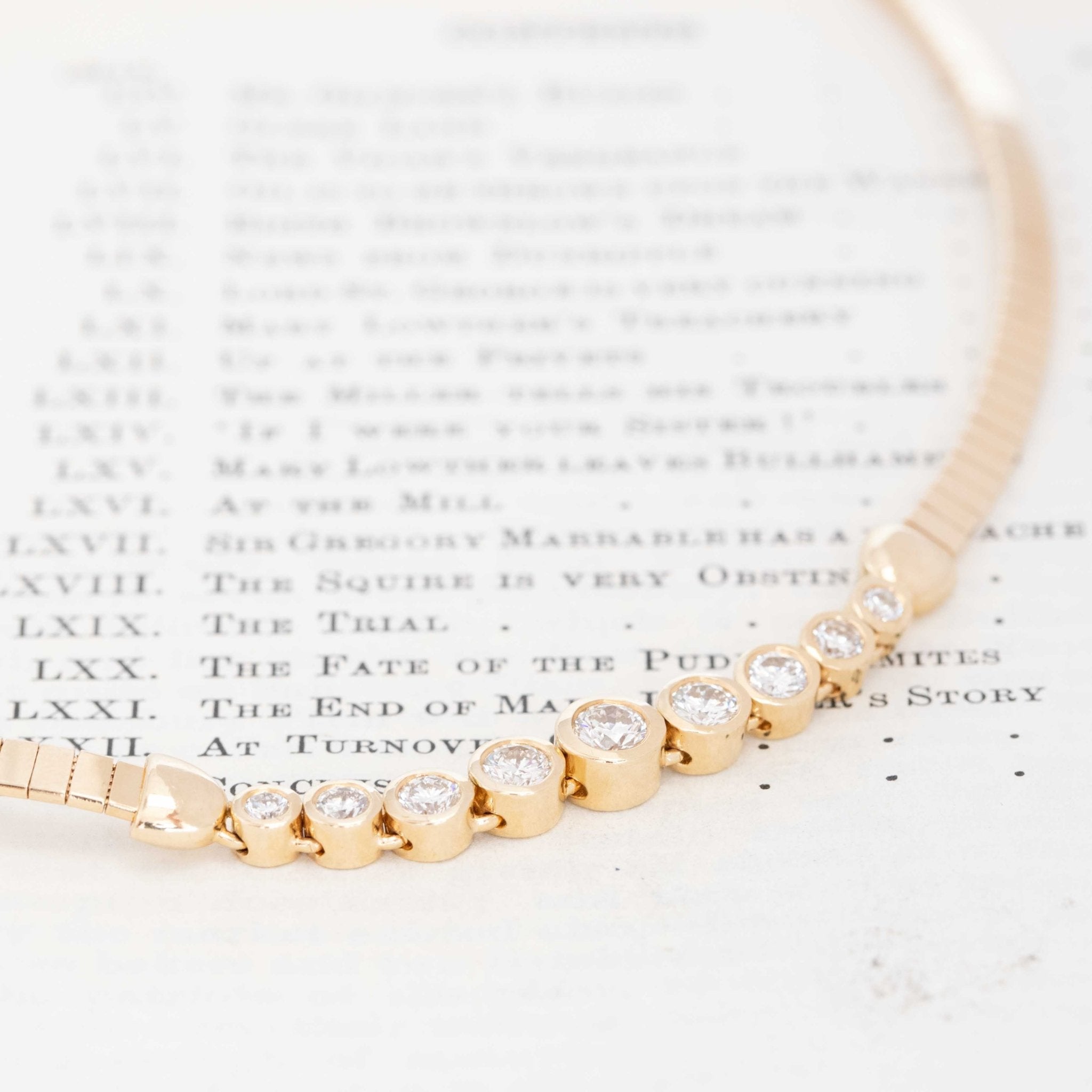 A charming graduated diamond collar, combining bezel-set stones with a buttery omega collar! I love the versatility of this piece, working in every context you’d want a tight gold collar or diamond situation along the décolletage.