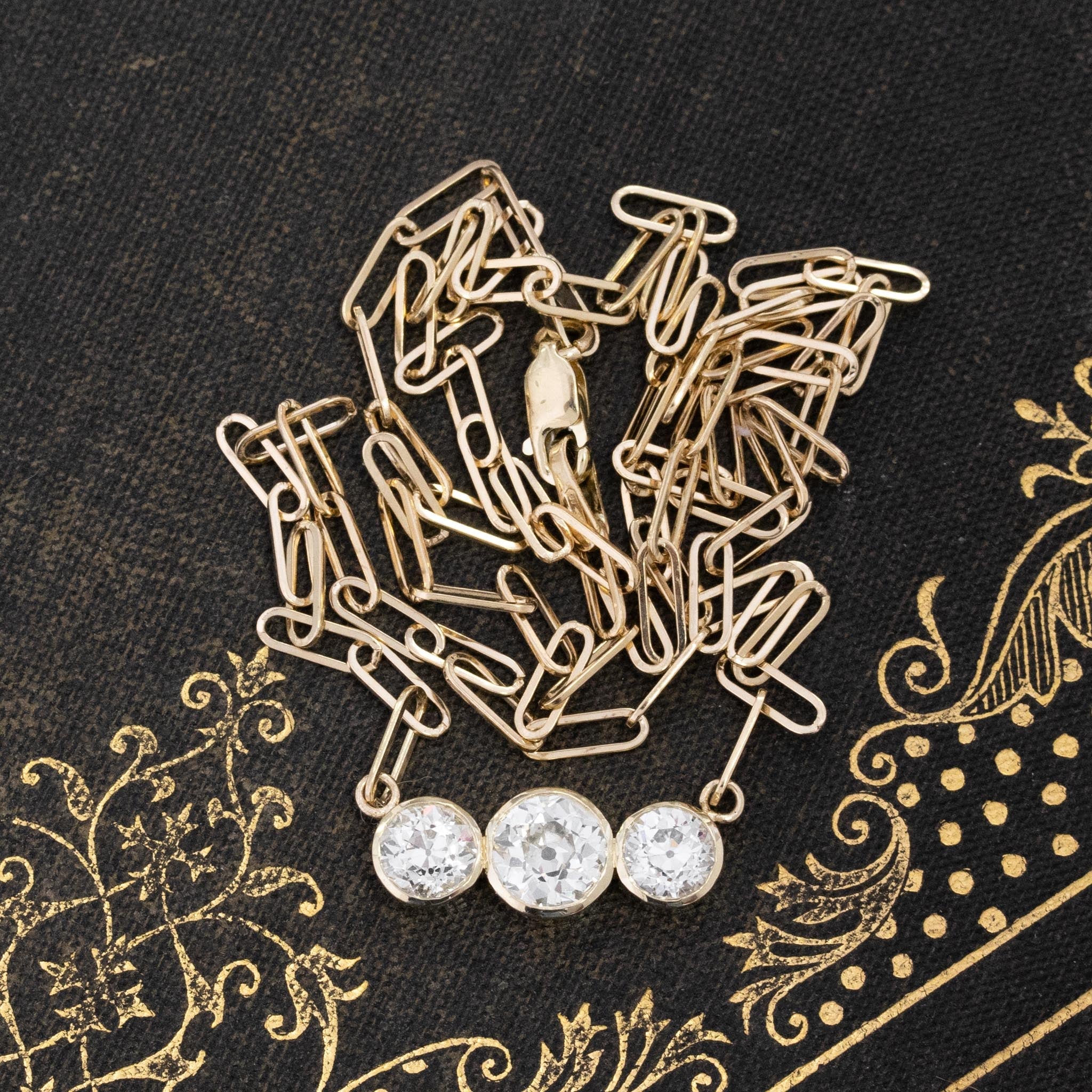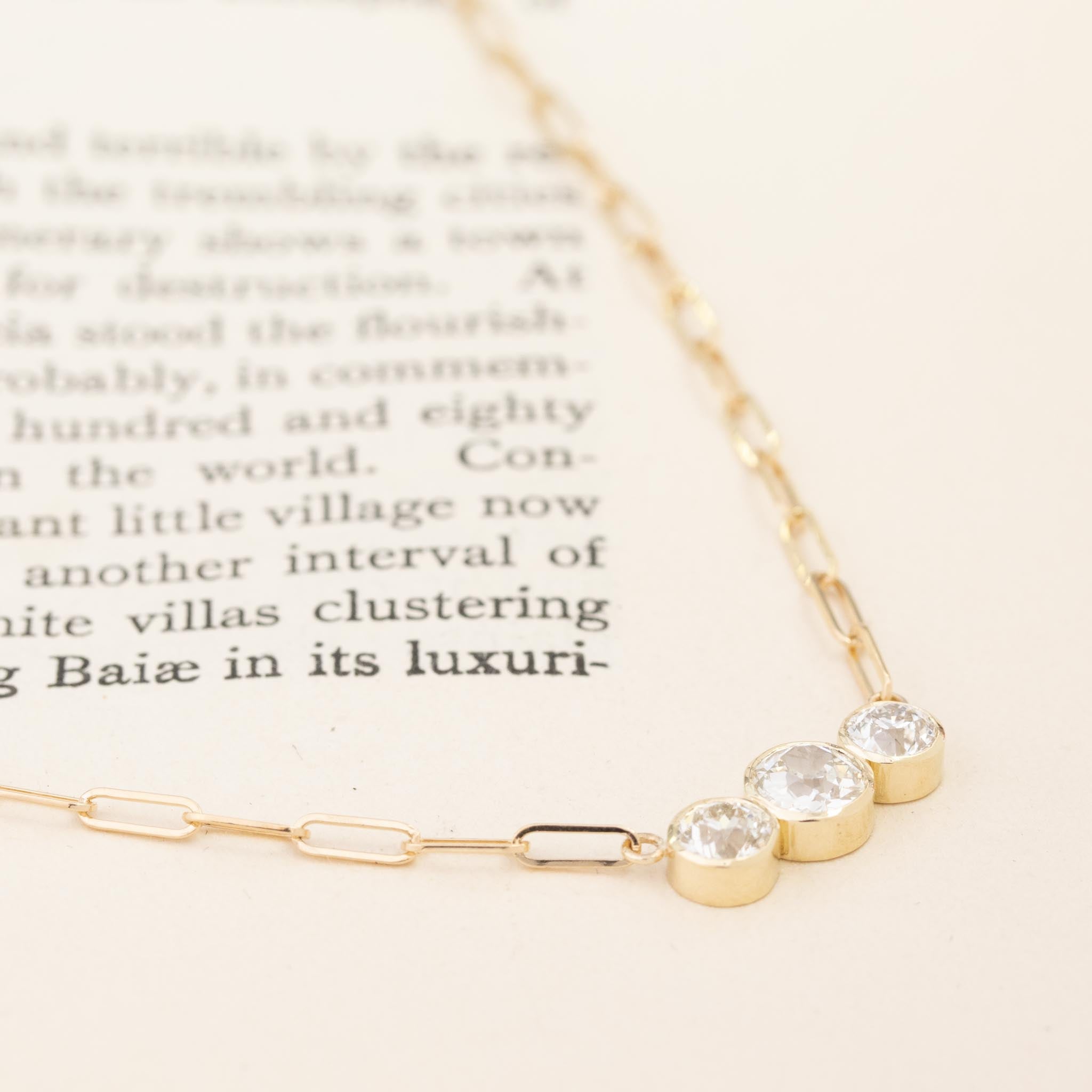 An OEC diamond trilogy pendant in gold bezels along a paperclip chain - BRB, while we swoon! Each of the diamonds is bright and sparkly, with lots of prismatic light play coming from each movement. The gold paperclip chain makes for a super chic daily necklace situation with old cut charm.